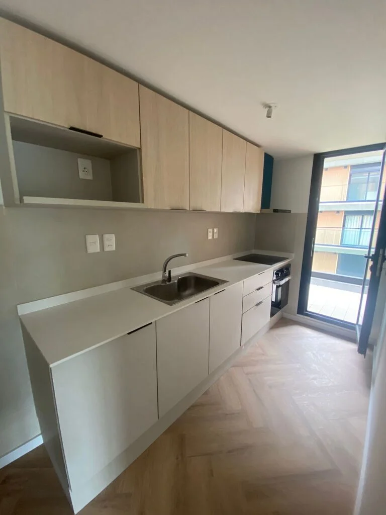 La unidad cuenta con living comedor, cocina definida y equipada con muebles bajo y sobre mesada, 2 dormitorios con placares, baño completo.
