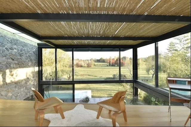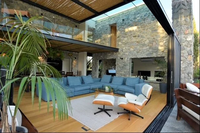 Living comedor con estufa a leña, techos en doble altura y aberturas plegables de piso a techo unificando el espacio interior con el exterior aterrazado con piedra.