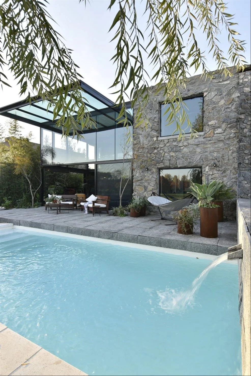 La piscina es climatizada con cascada con fondo al campo de golf rodeada de verde.