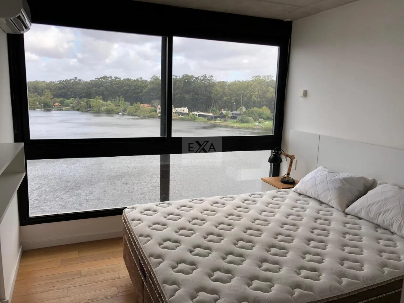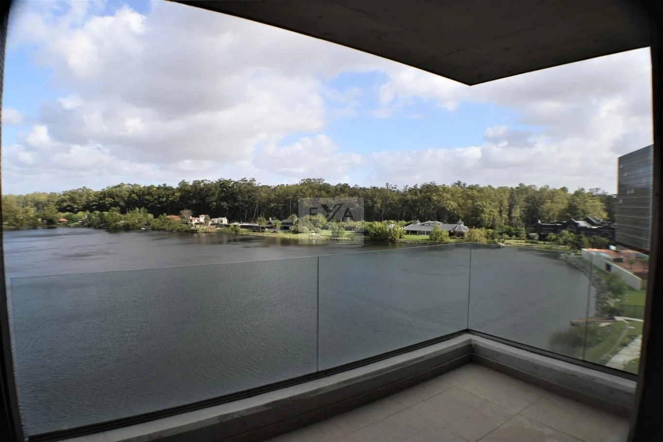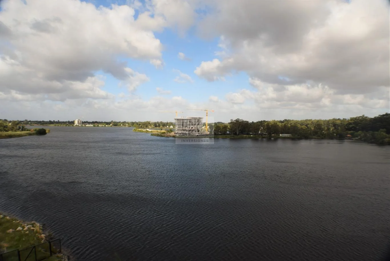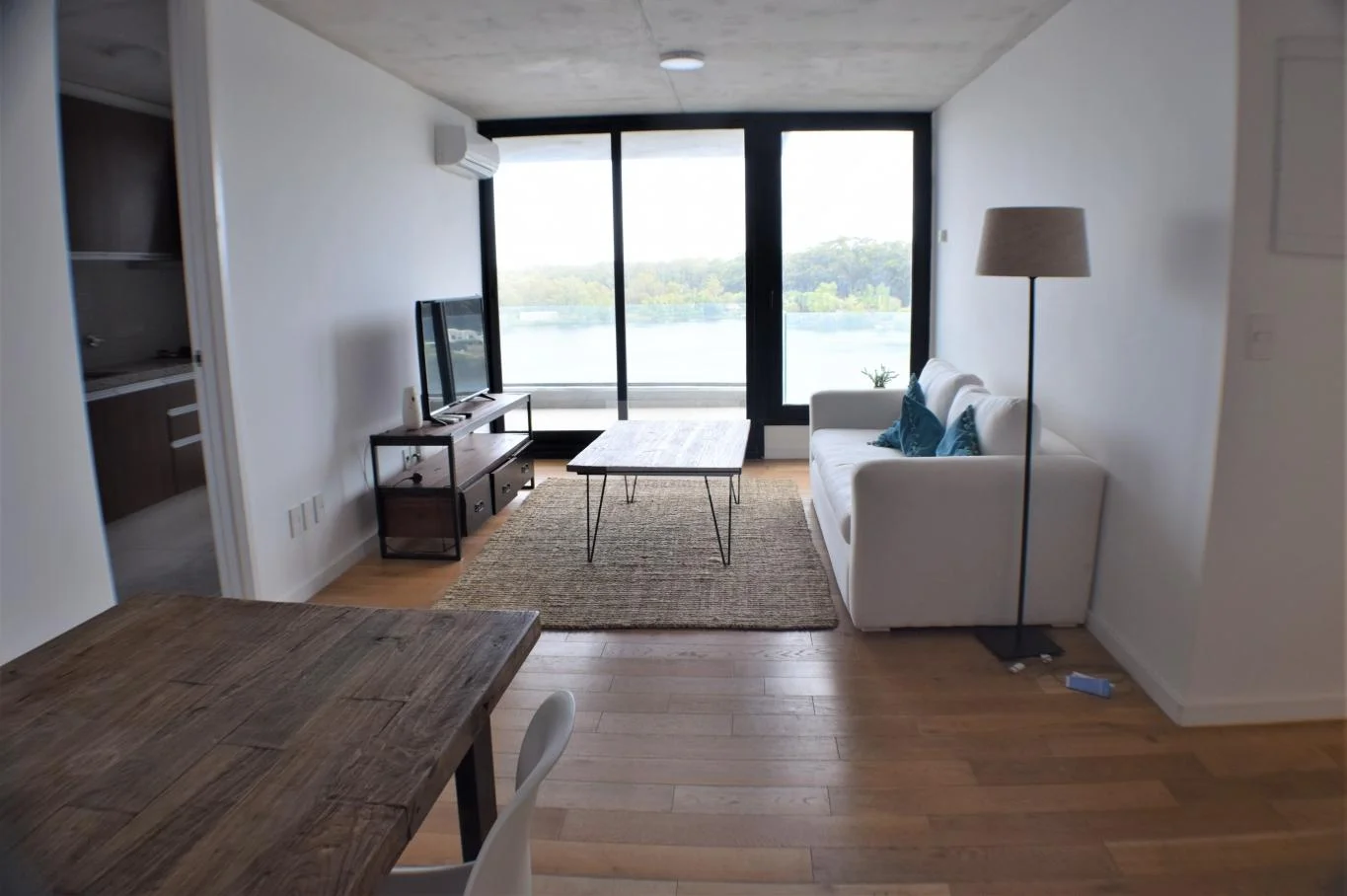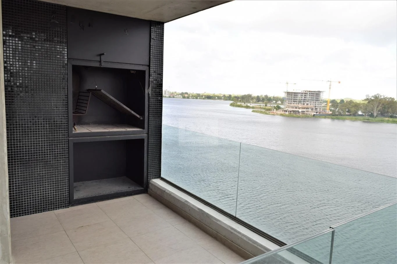 Living comedor con salida a terraza con parrillero hacia el lago, cocina definida, 2 dormitorios y 2 baños.
