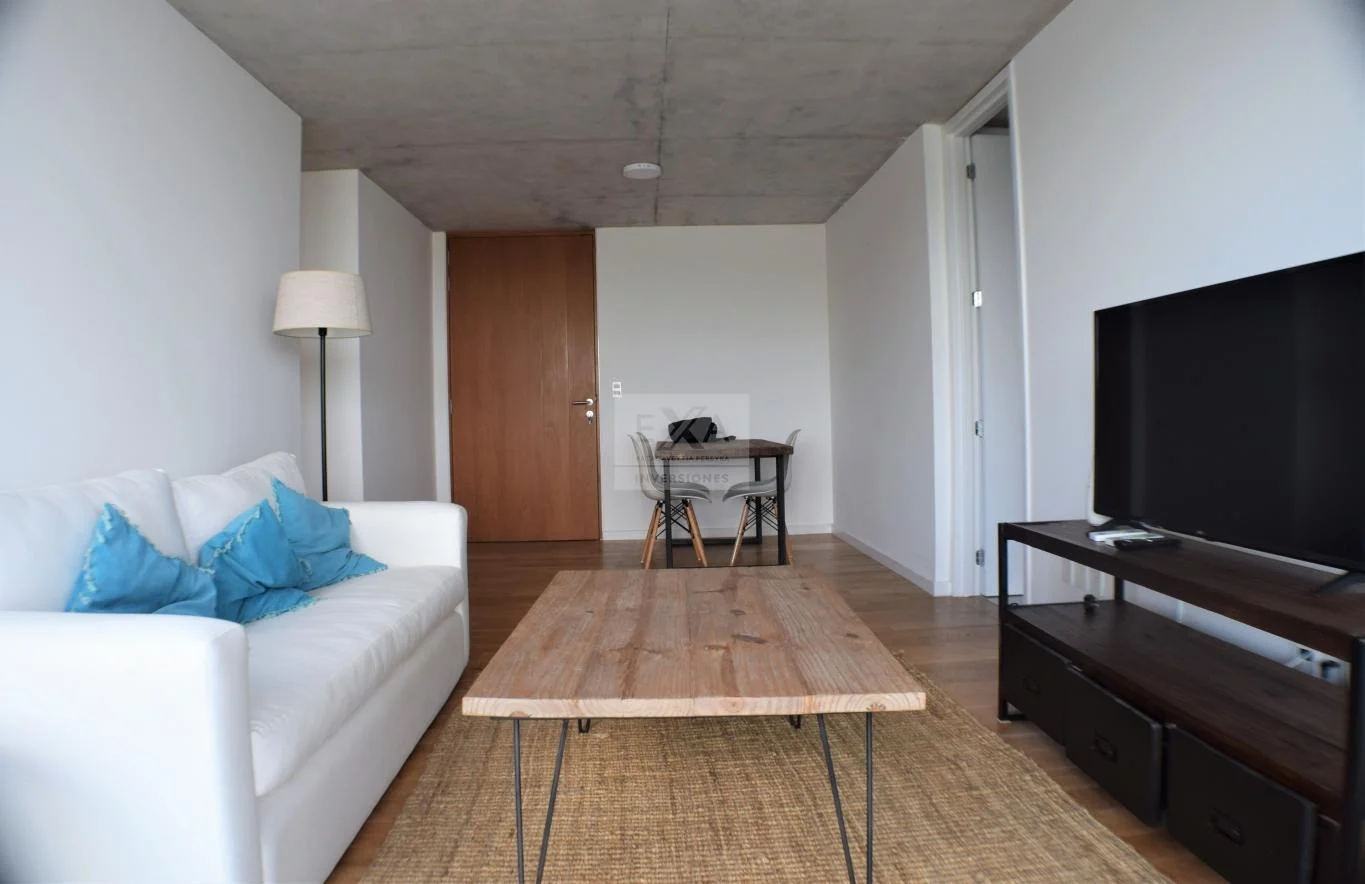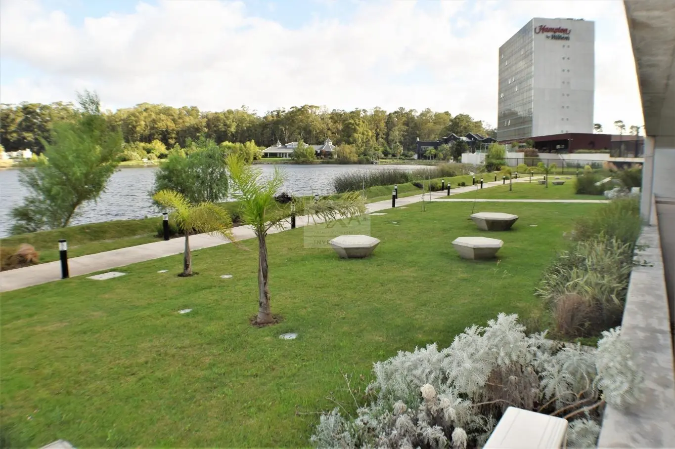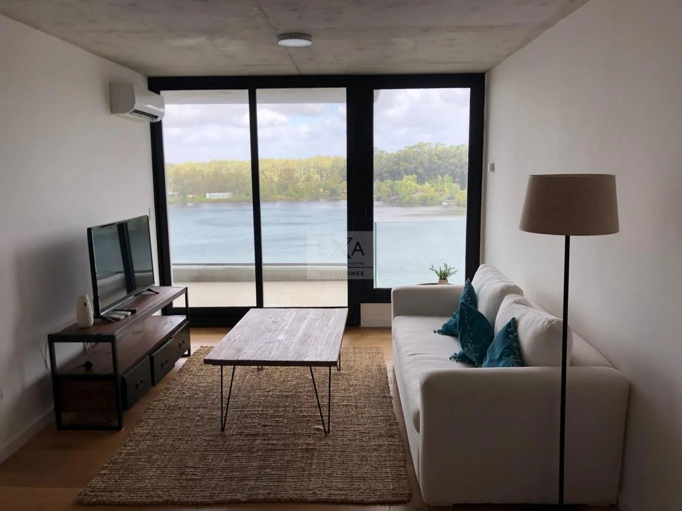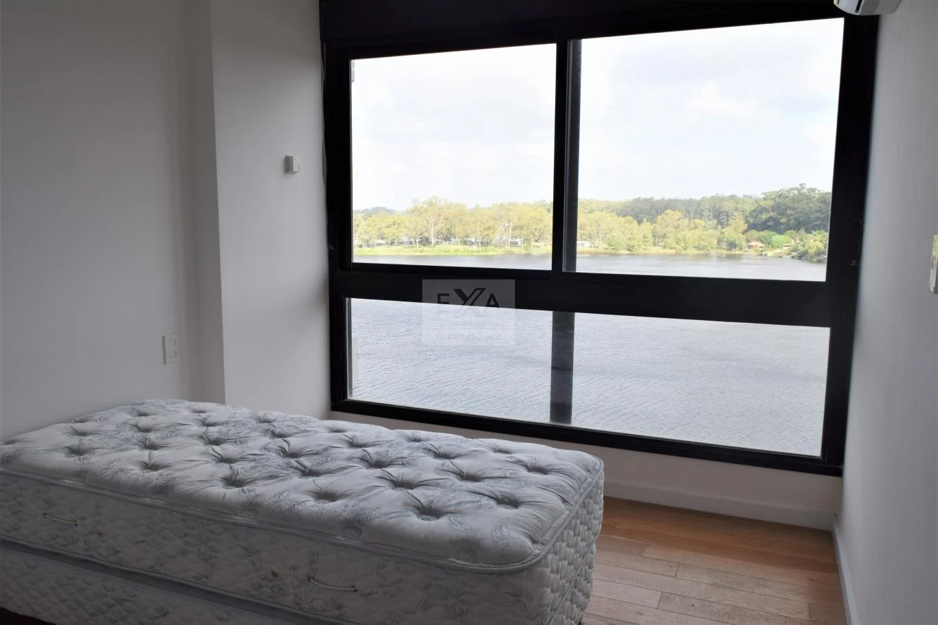 Living comedor con salida a terraza con parrillero hacia el lago, cocina definida, 2 dormitorios y 2 baños.