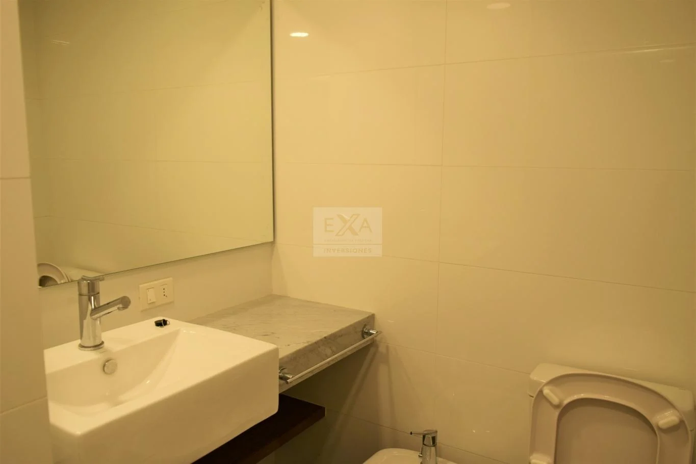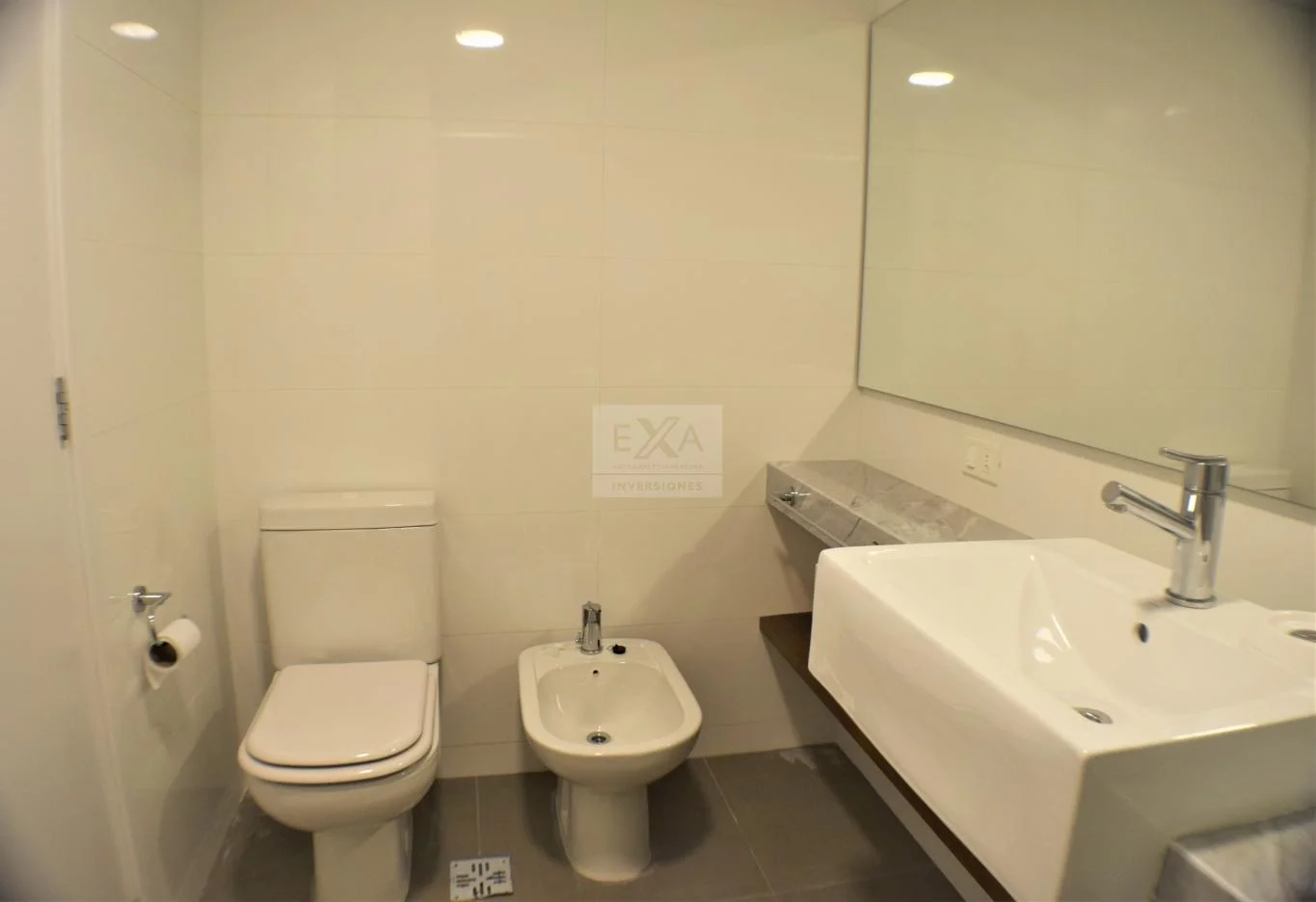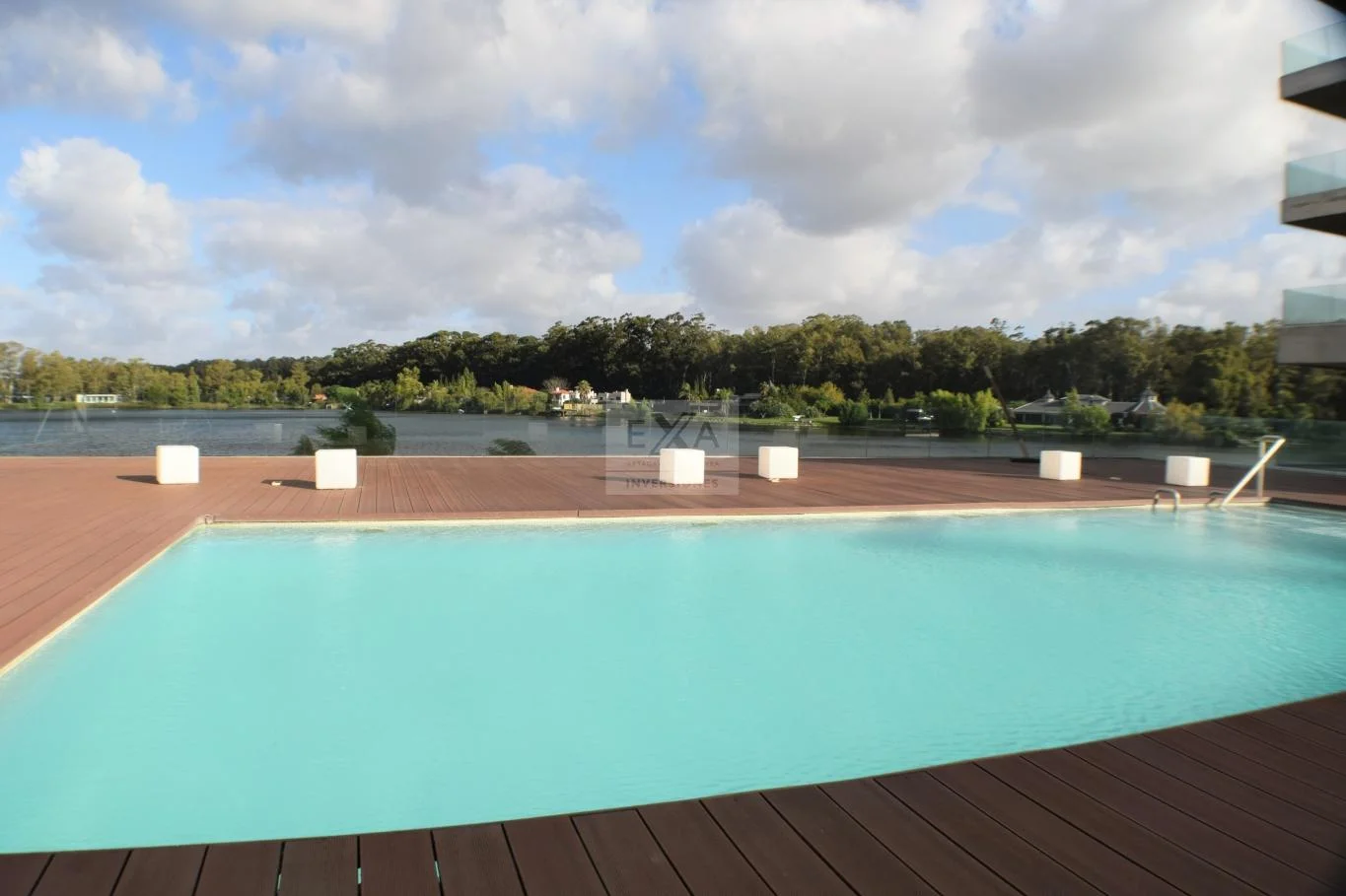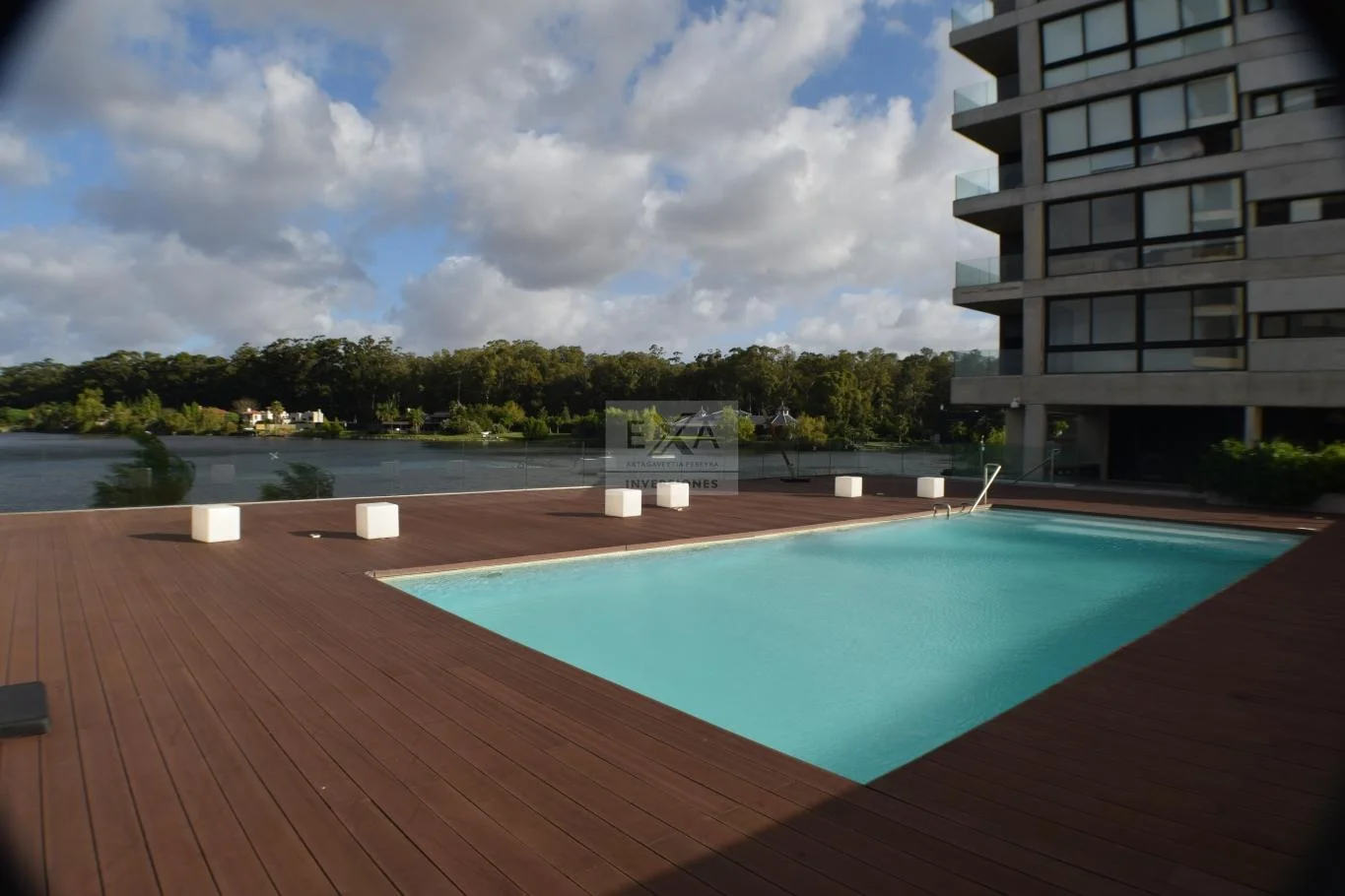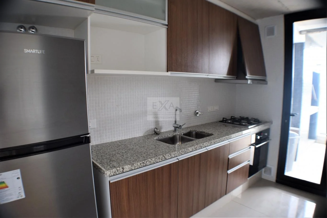 Living comedor con salida a terraza con parrillero hacia el lago, cocina definida, 2 dormitorios y 2 baños.