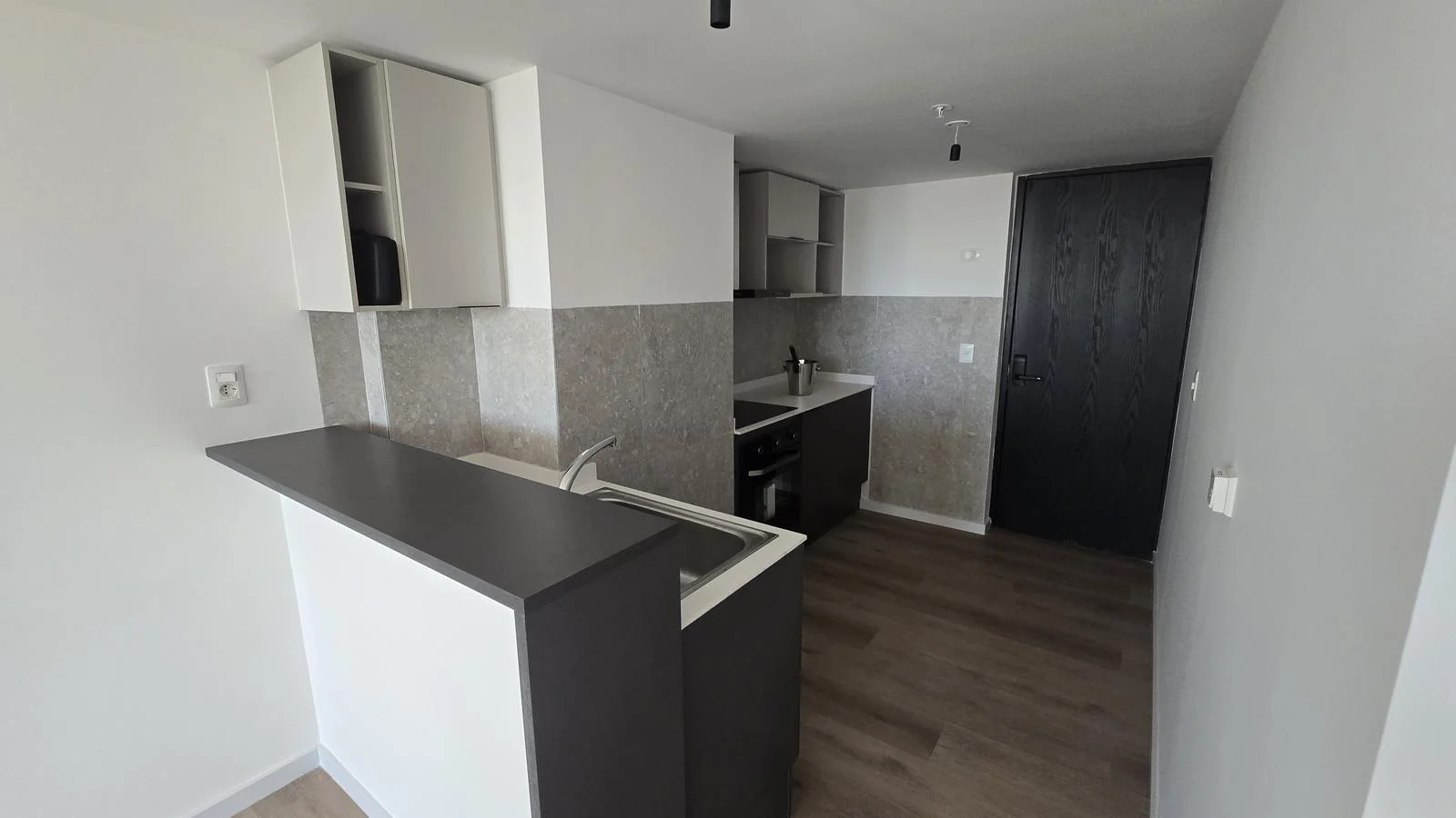 Cuenta con living comedor con cocina integrada con muebles aéreos, bajo mesada, horno empotrado y anafe vitrocerámico. 1 dormitorio con placar. Terraza a lo ancho del apartamento. 1 baño completo.