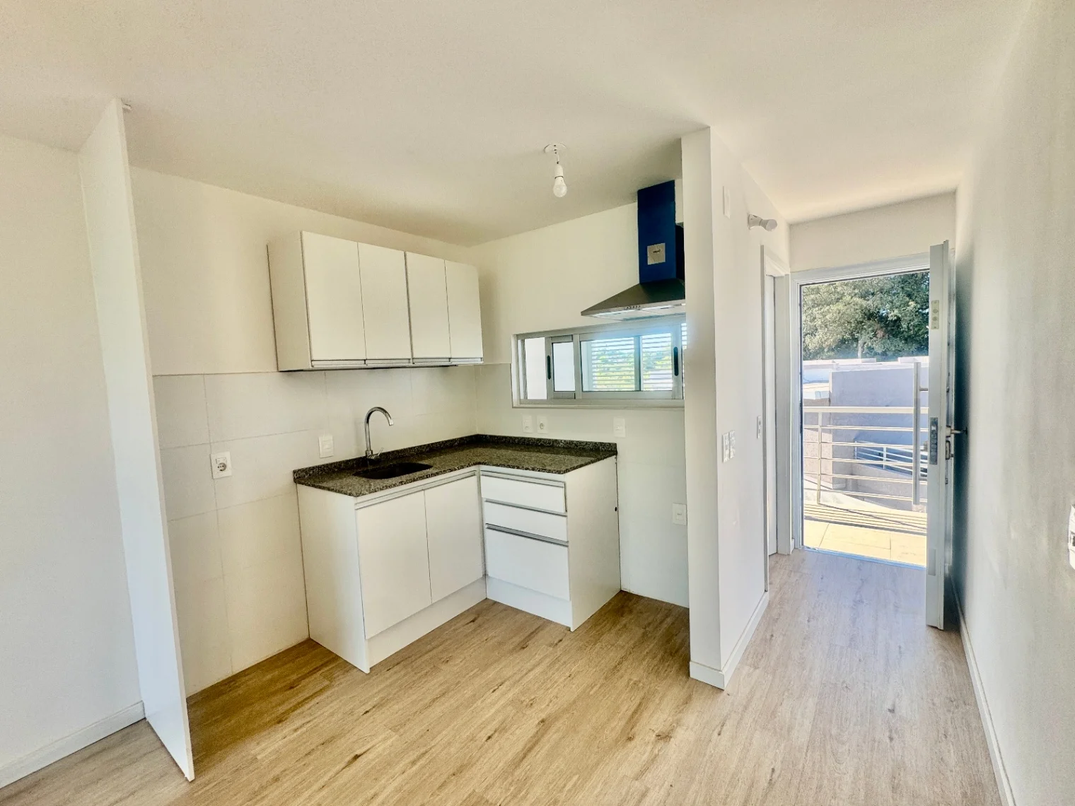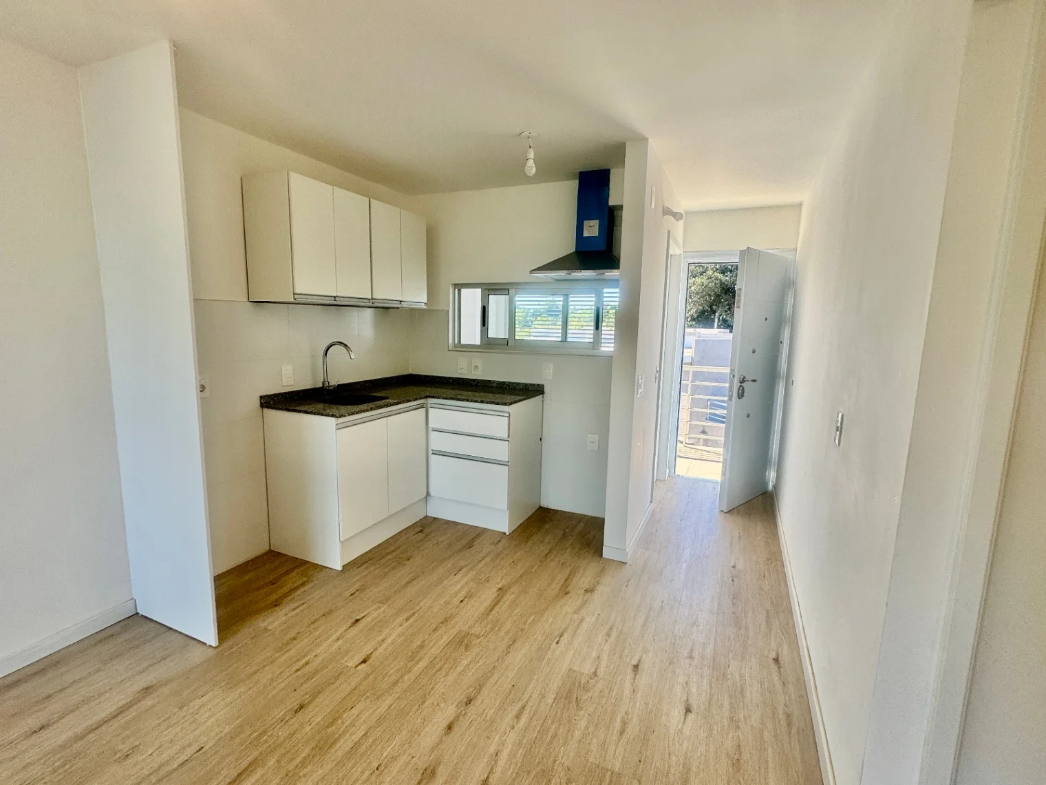 Living comedor con aire acondicionado y cocina integrada con muebles aéreos ,bajo mesada, y una campana instalada.
