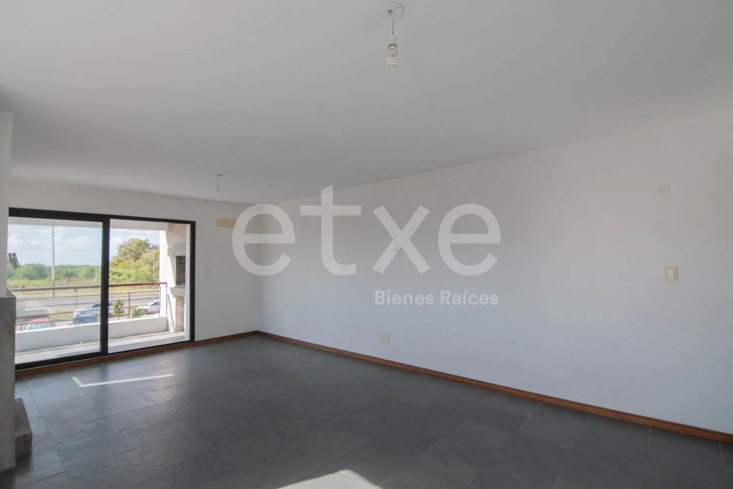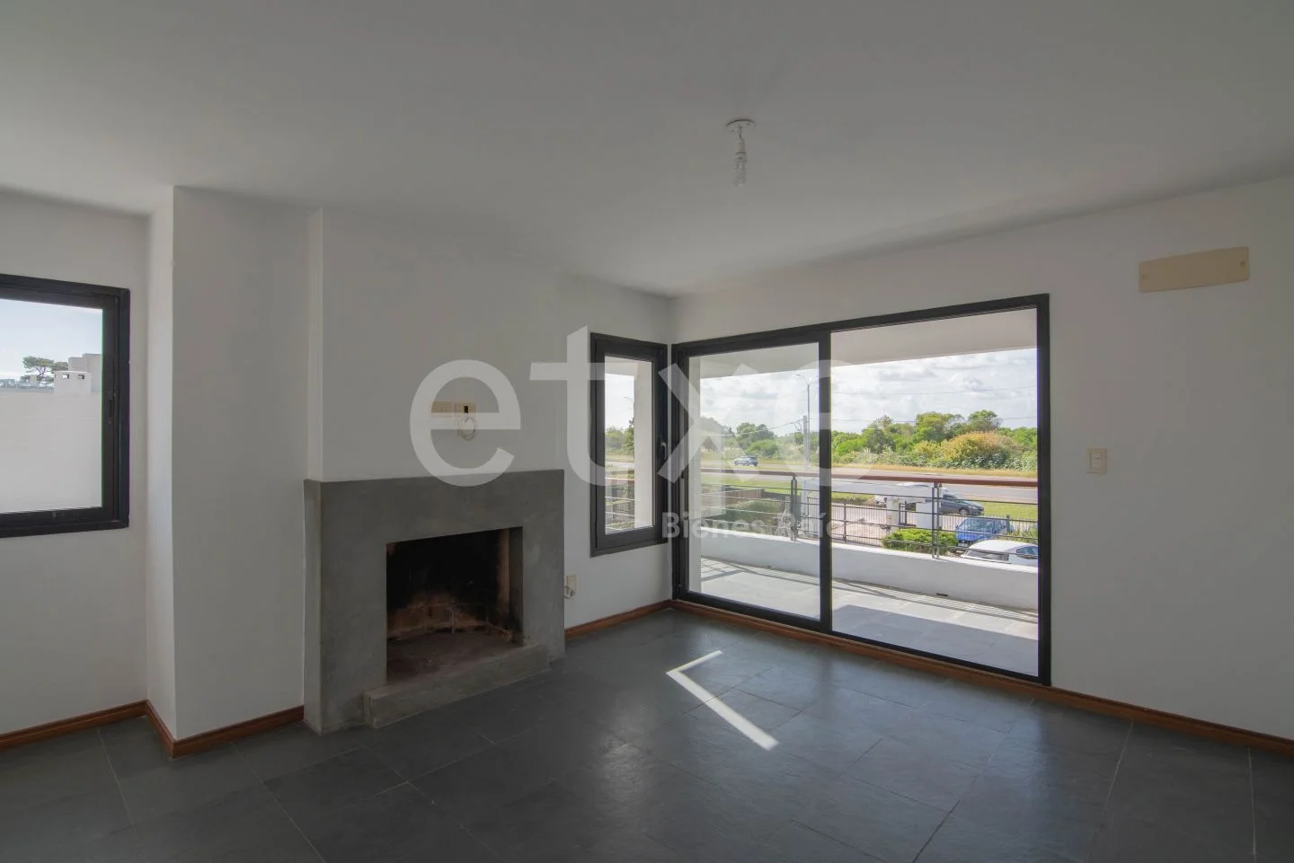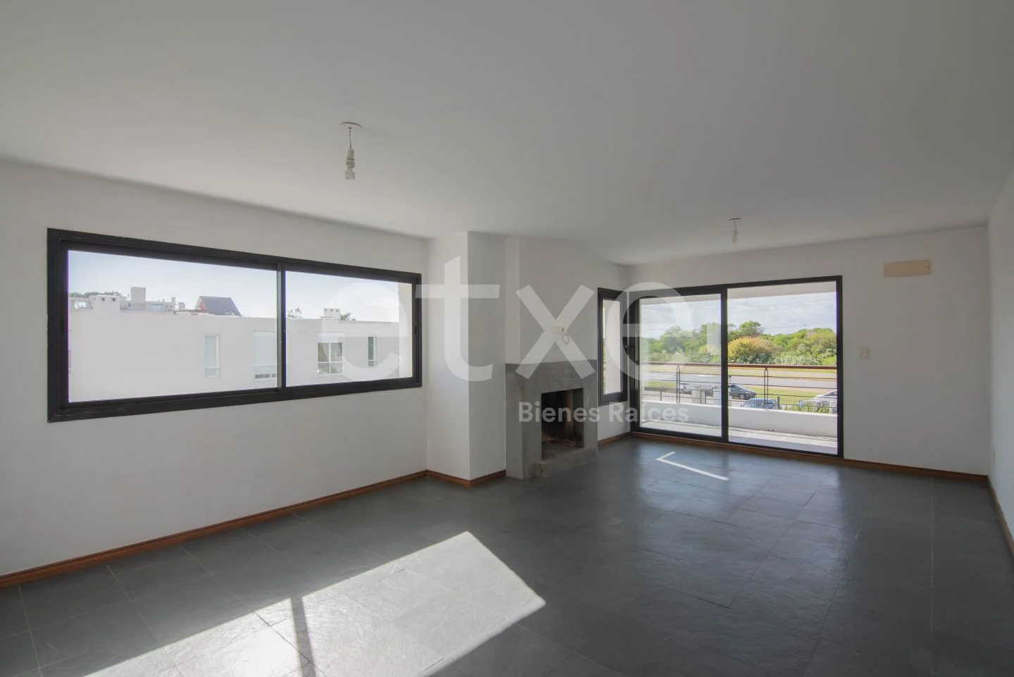 Ingreso a amplio living comedor con estufa a leña y salida a terraza al frente con parrillero y gran vista despejada.