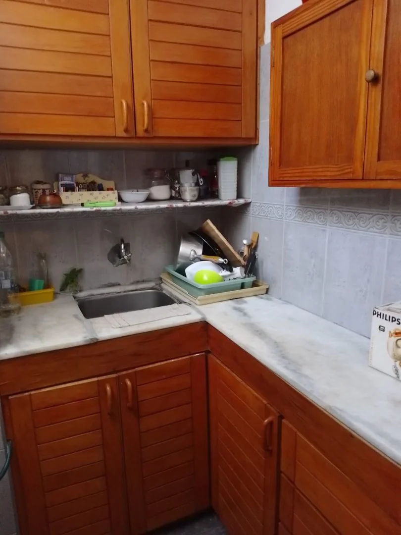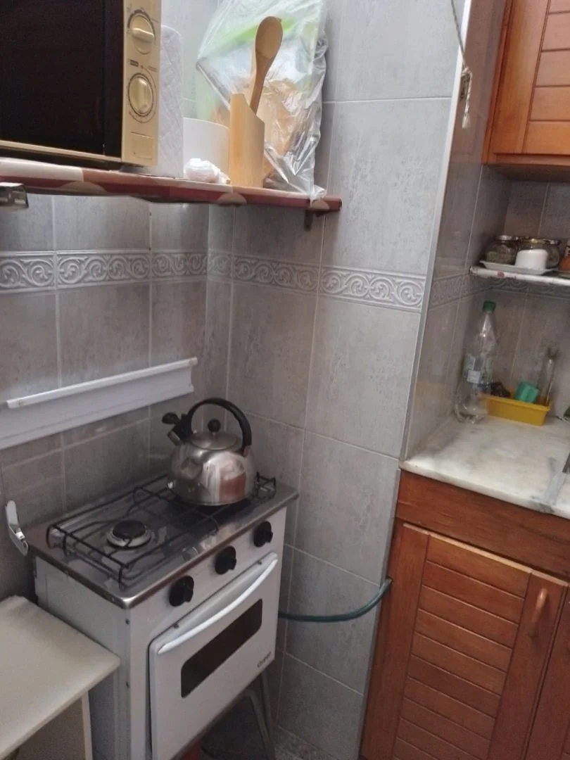 Cocina definida con placares bajo mesada y aéreos, cocina a gas y pequeños electrodomésticos.