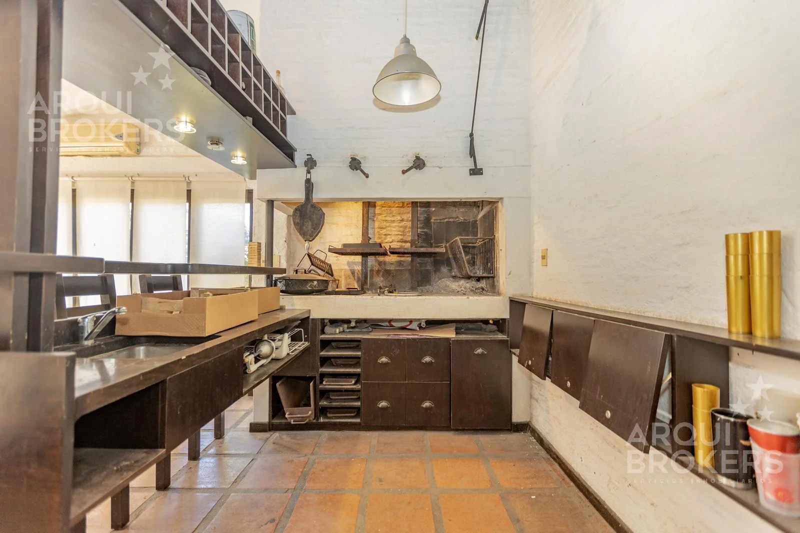 Barbacoa completa: parrillero, cocina a gas, estufa de alto rendimiento, baño completo con ducha y espacio adicional tipo estudio/dormitorio.