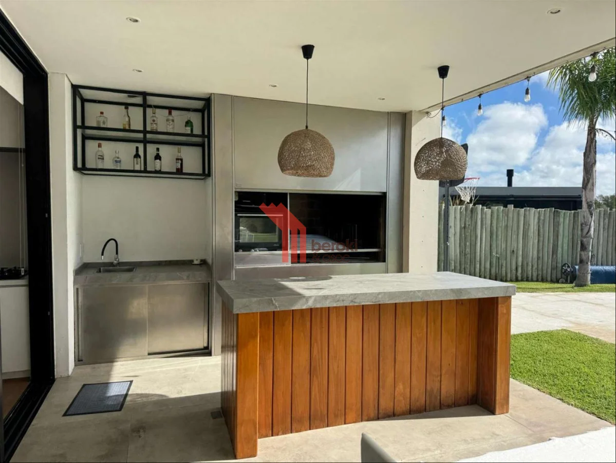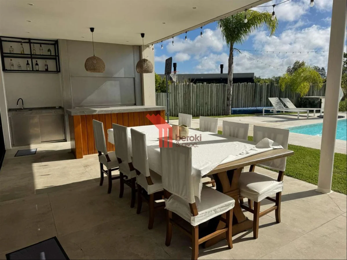 En planta baja, el área social se compone de living-comedor con estufa a leña a gas, cocina integrada con isla y conexión directa a una barbacoa techada de gran tamaño, equipada con parrillero y estufa, lo que permite su uso durante todo el año manteniendo un vínculo directo con el exterior.