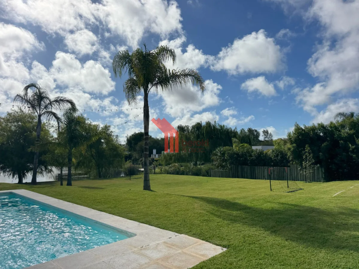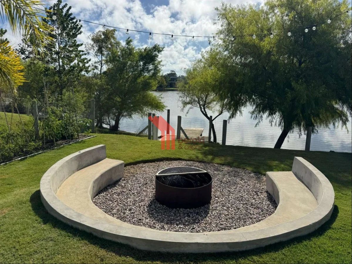 El exterior ofrece jardín parquizado, piscina climatizada, fogón y muelle con acceso directo al lago.