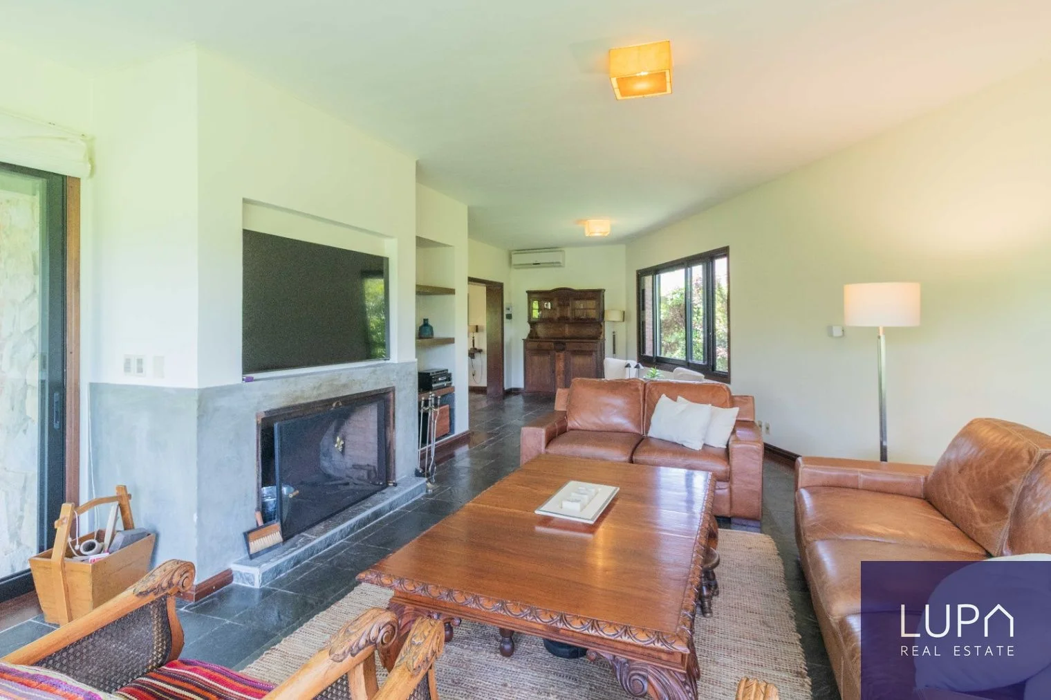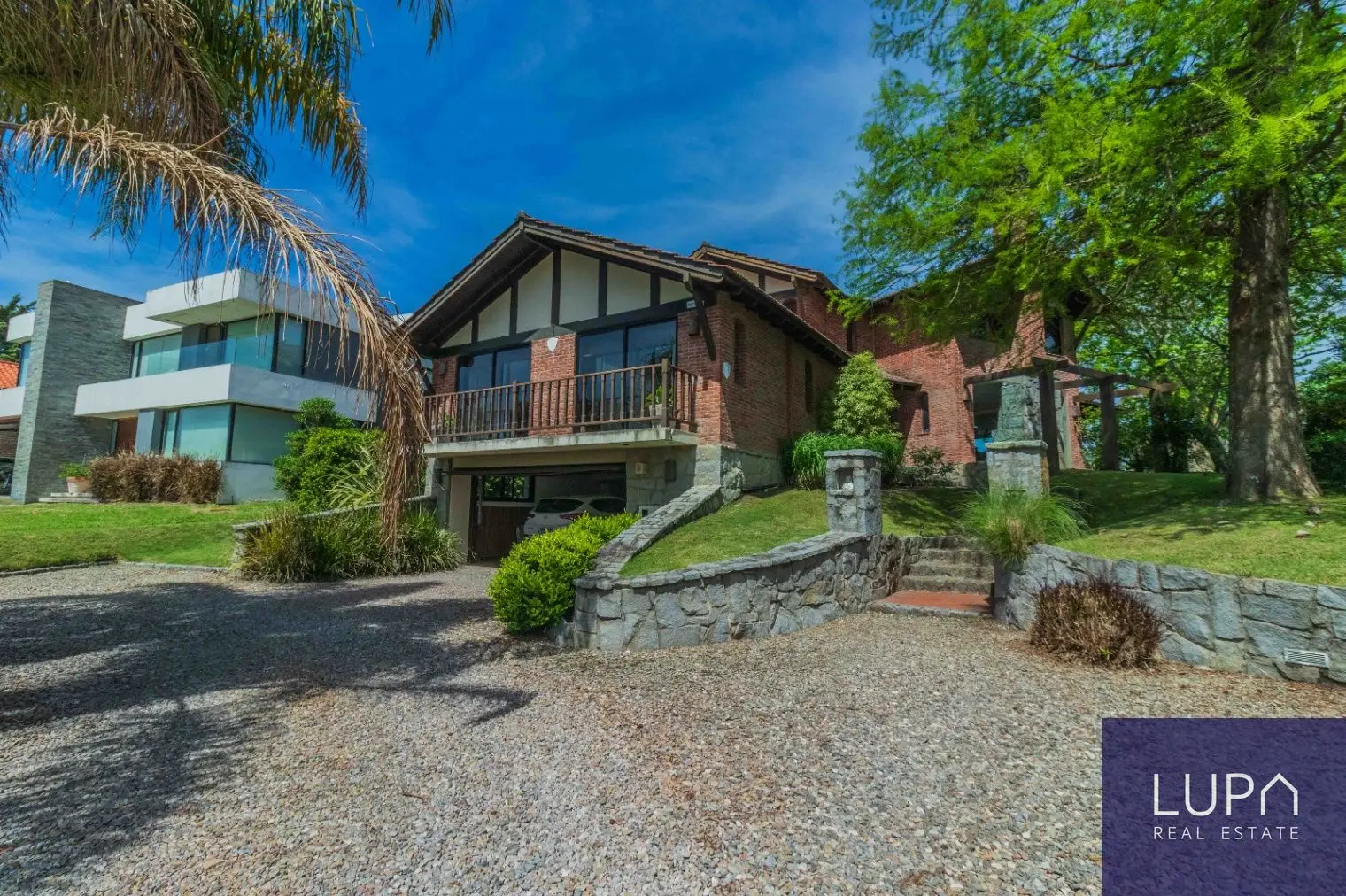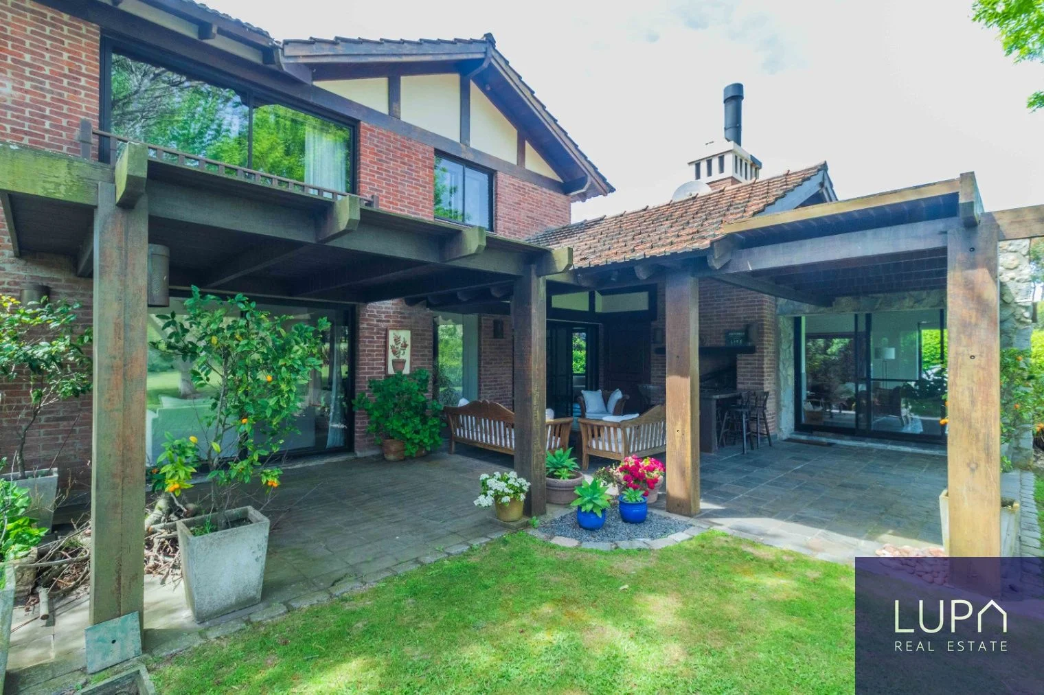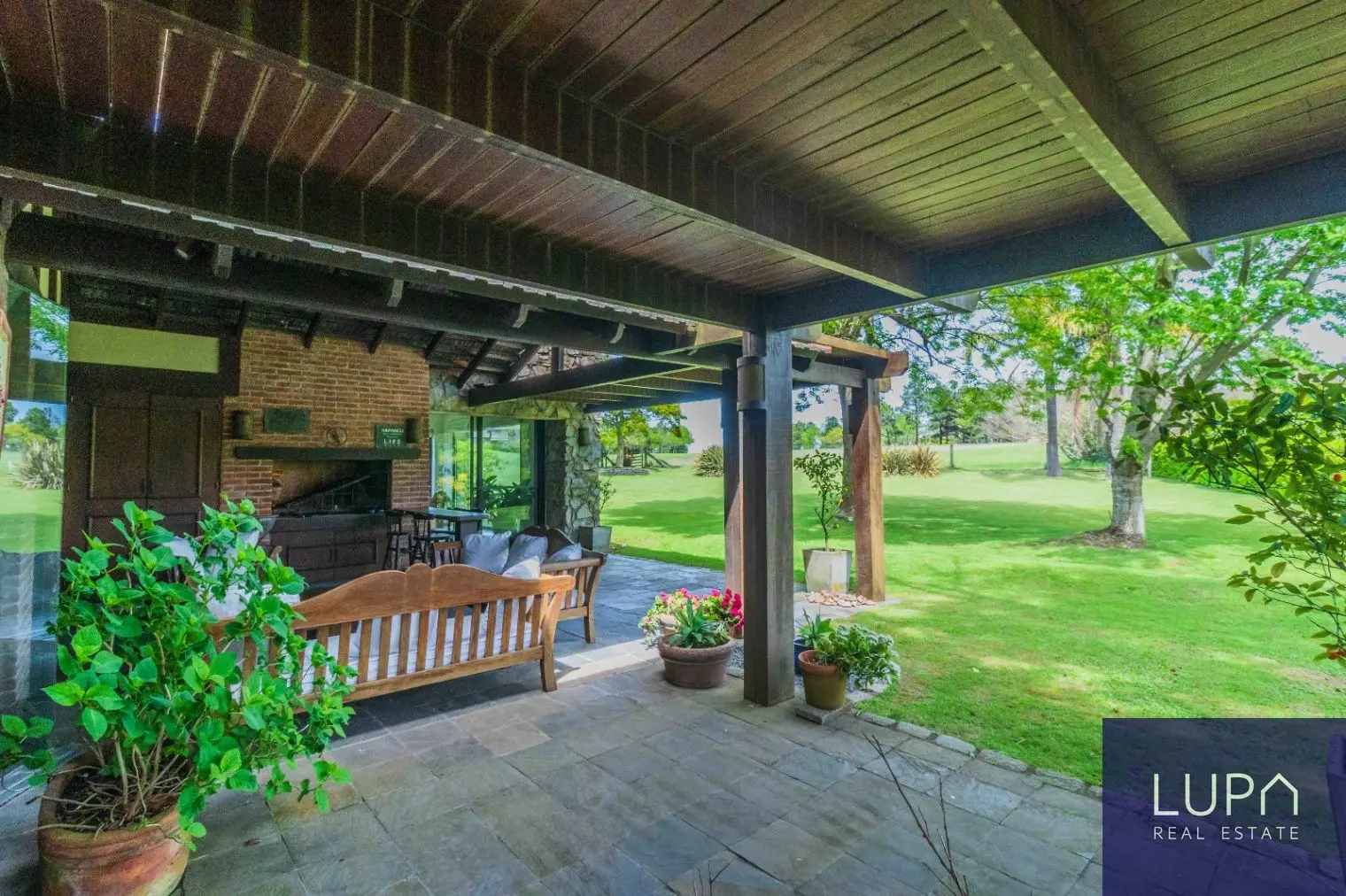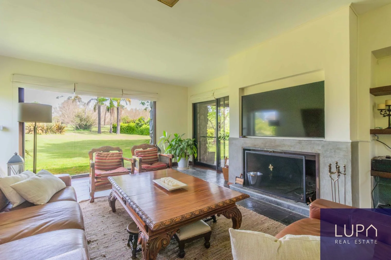 Residencia luminosa frente al golf. Casa de 400 m² en lote de 1.300 m², con construcción sólida, amplios ventanales y privacidad. Dispone de living-comedor, barbacoa techada, cocina con acceso a planta baja (área de servicio y garage doble), 2 dormitorios, baño completo y suite principal en planta alta con espacio extra. Detalles: Calefacción por losa, riego, ventanas dobles, aire acondicionado y cercado completo.