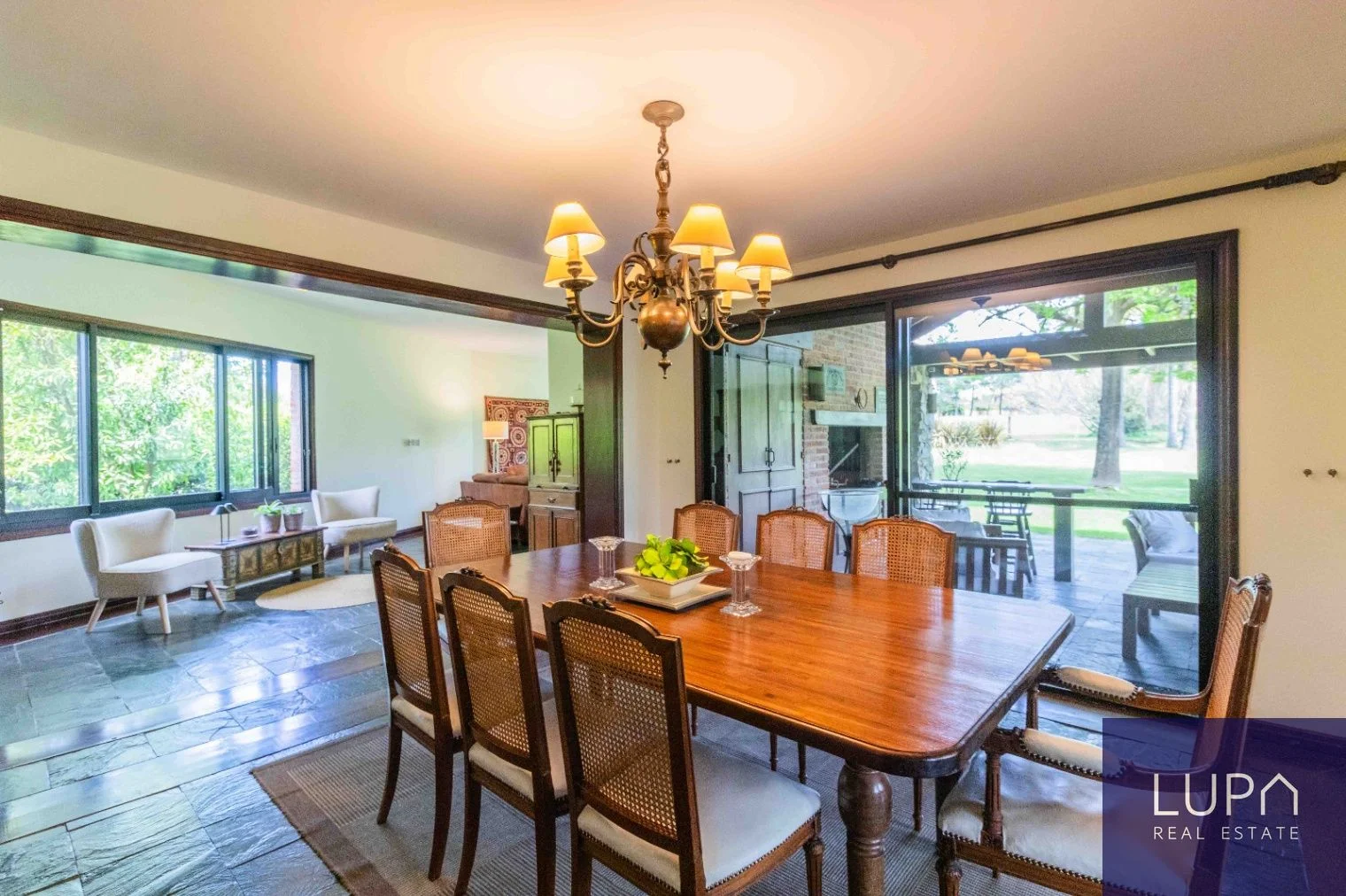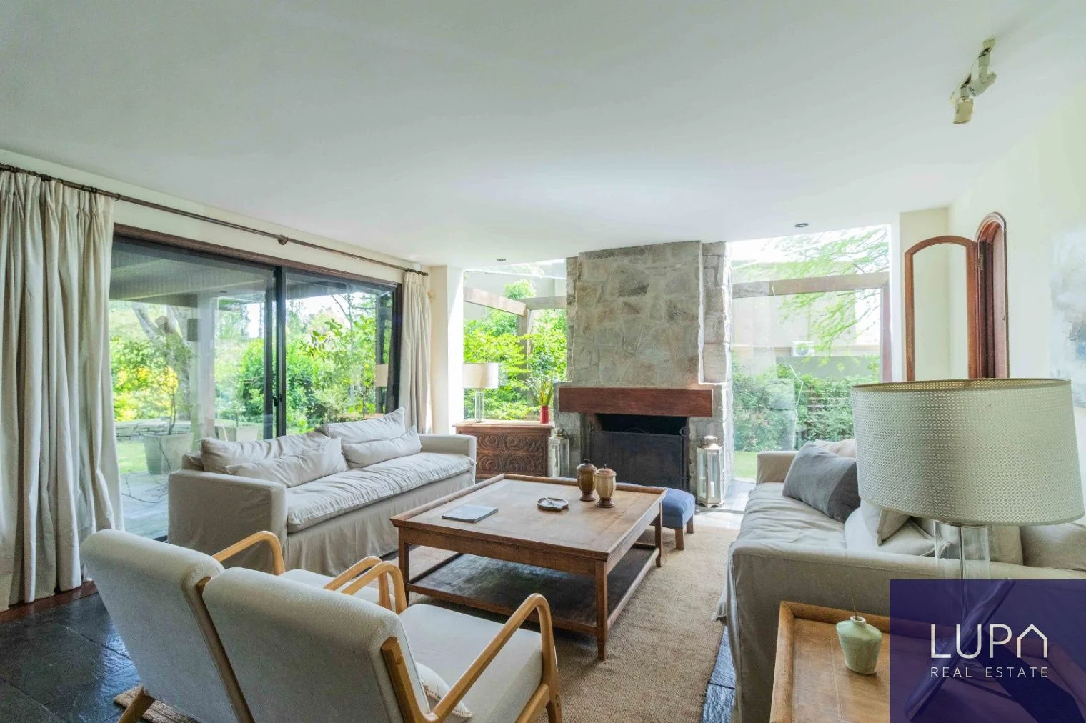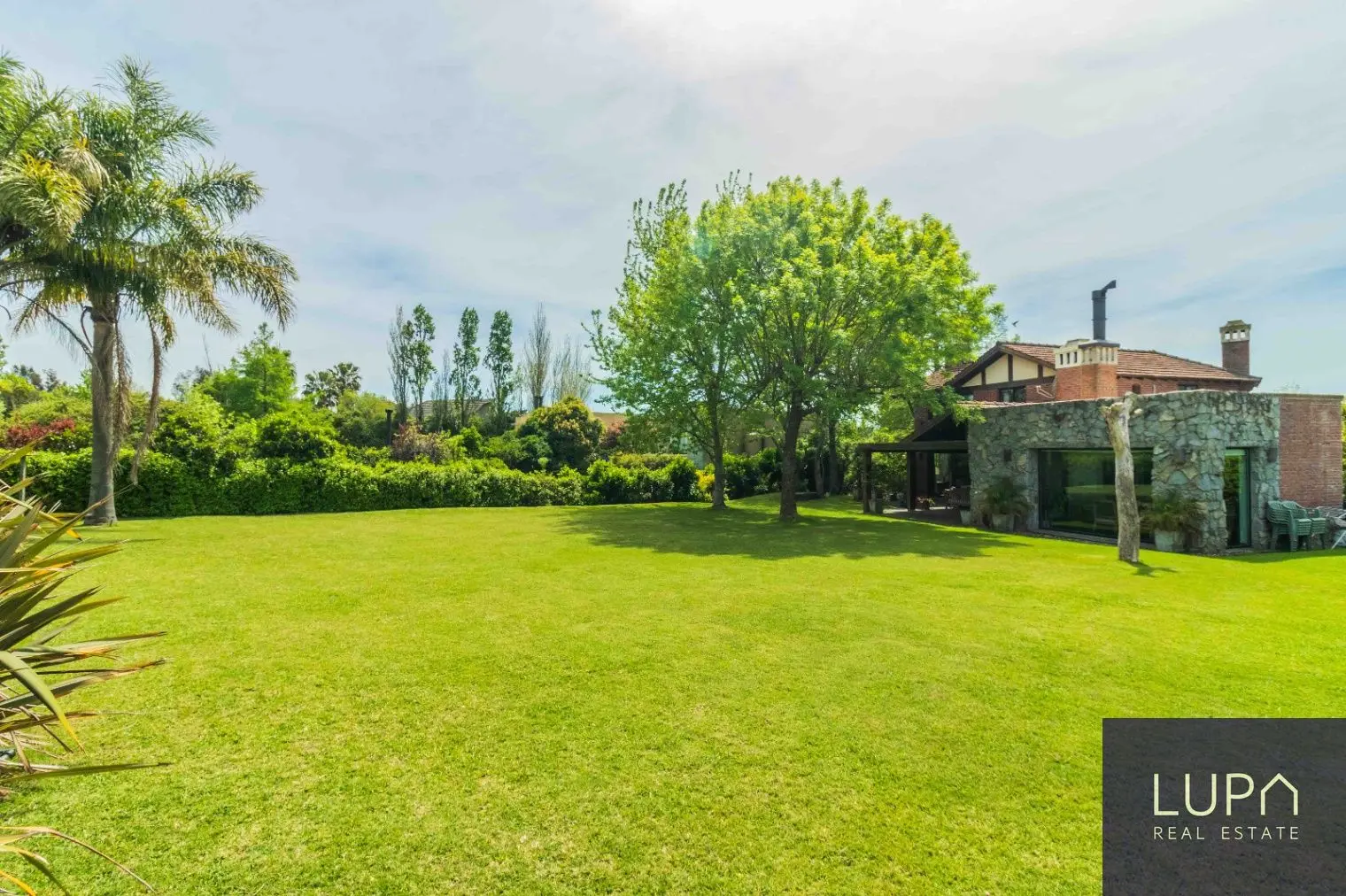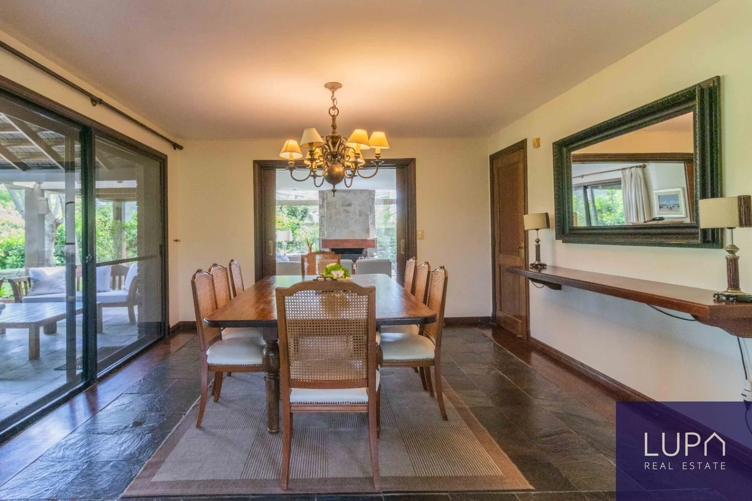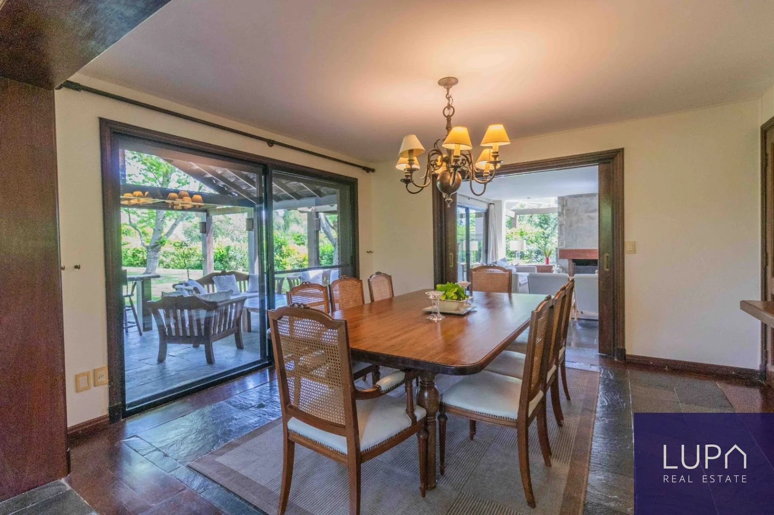Residencia luminosa frente al golf. Casa de 400 m² en lote de 1.300 m², con construcción sólida, amplios ventanales y privacidad. Dispone de living-comedor, barbacoa techada, cocina con acceso a planta baja (área de servicio y garage doble), 2 dormitorios, baño completo y suite principal en planta alta con espacio extra. Detalles: Calefacción por losa, riego, ventanas dobles, aire acondicionado y cercado completo.