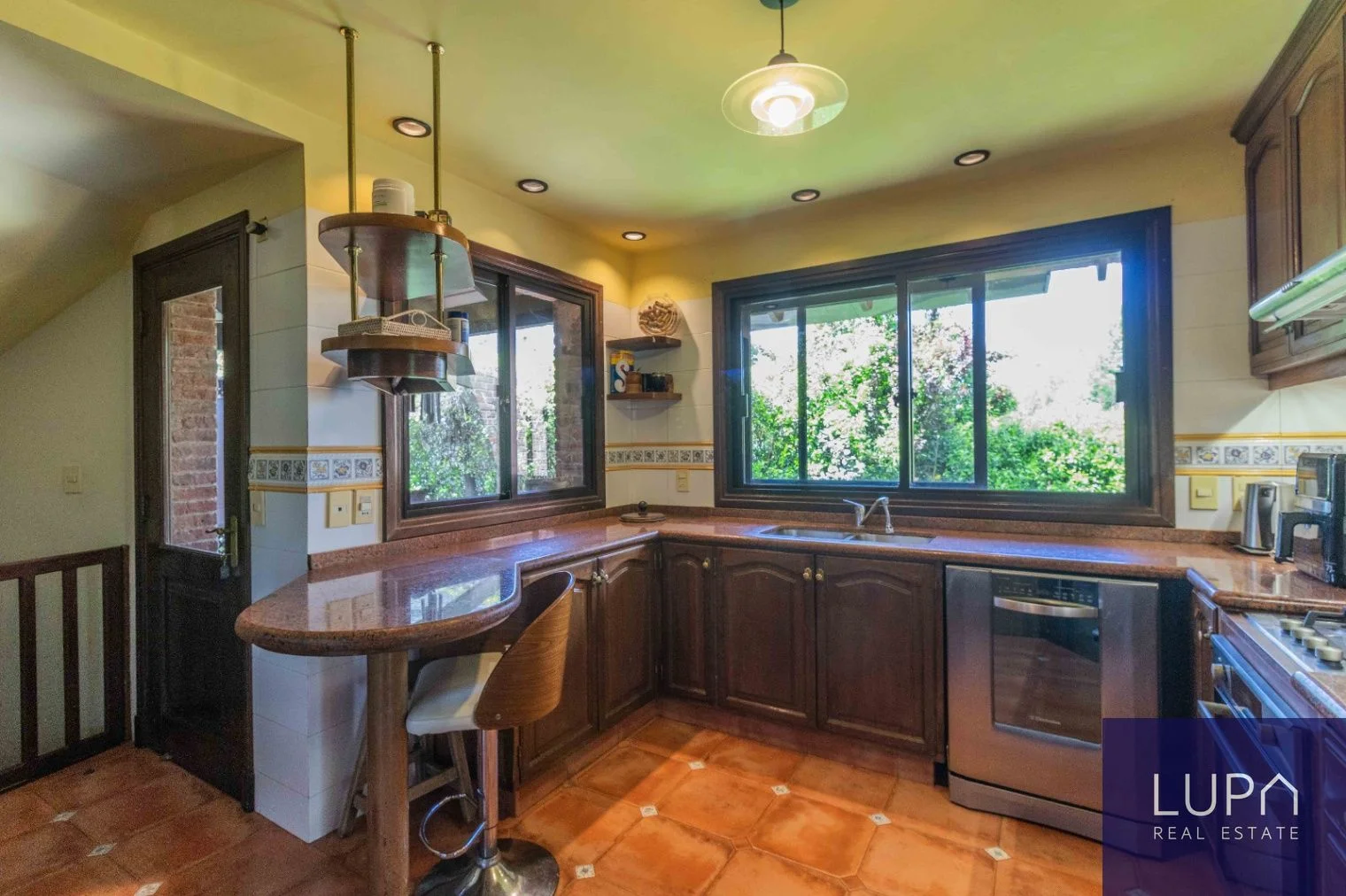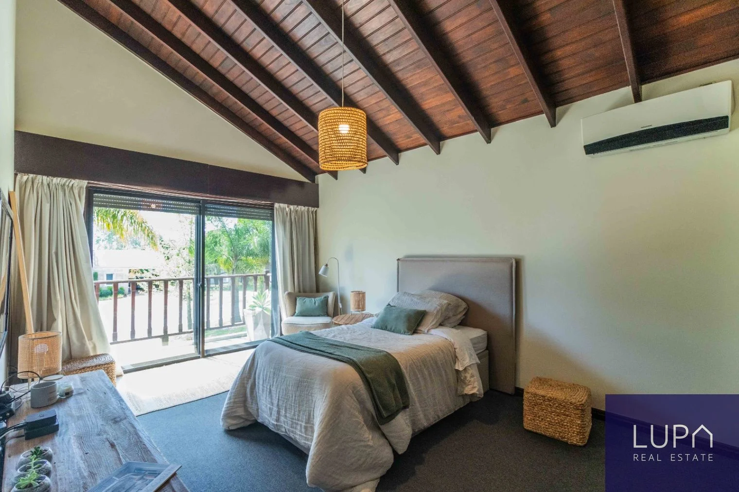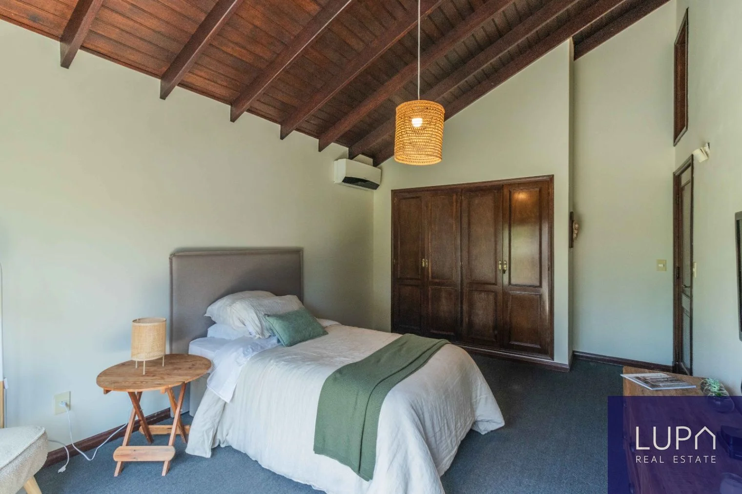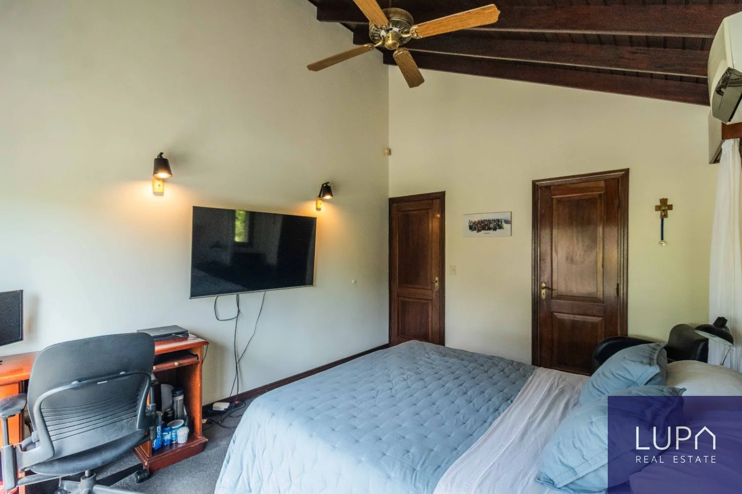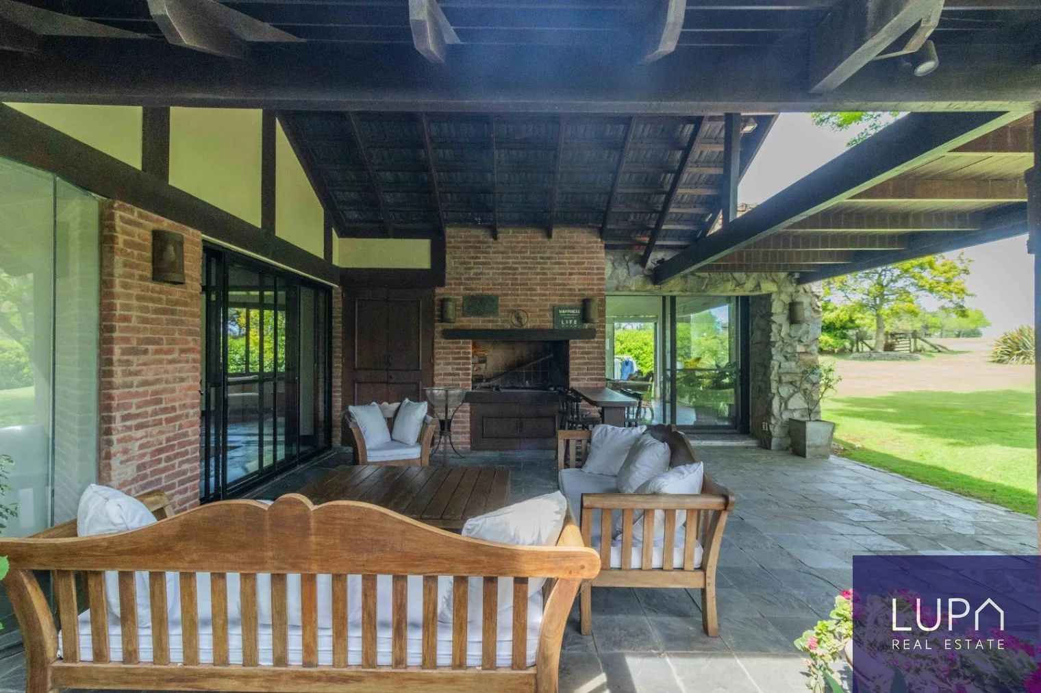 Residencia luminosa frente al golf. Casa de 400 m² en lote de 1.300 m², con construcción sólida, amplios ventanales y privacidad. Dispone de living-comedor, barbacoa techada, cocina con acceso a planta baja (área de servicio y garage doble), 2 dormitorios, baño completo y suite principal en planta alta con espacio extra. Detalles: Calefacción por losa, riego, ventanas dobles, aire acondicionado y cercado completo.
