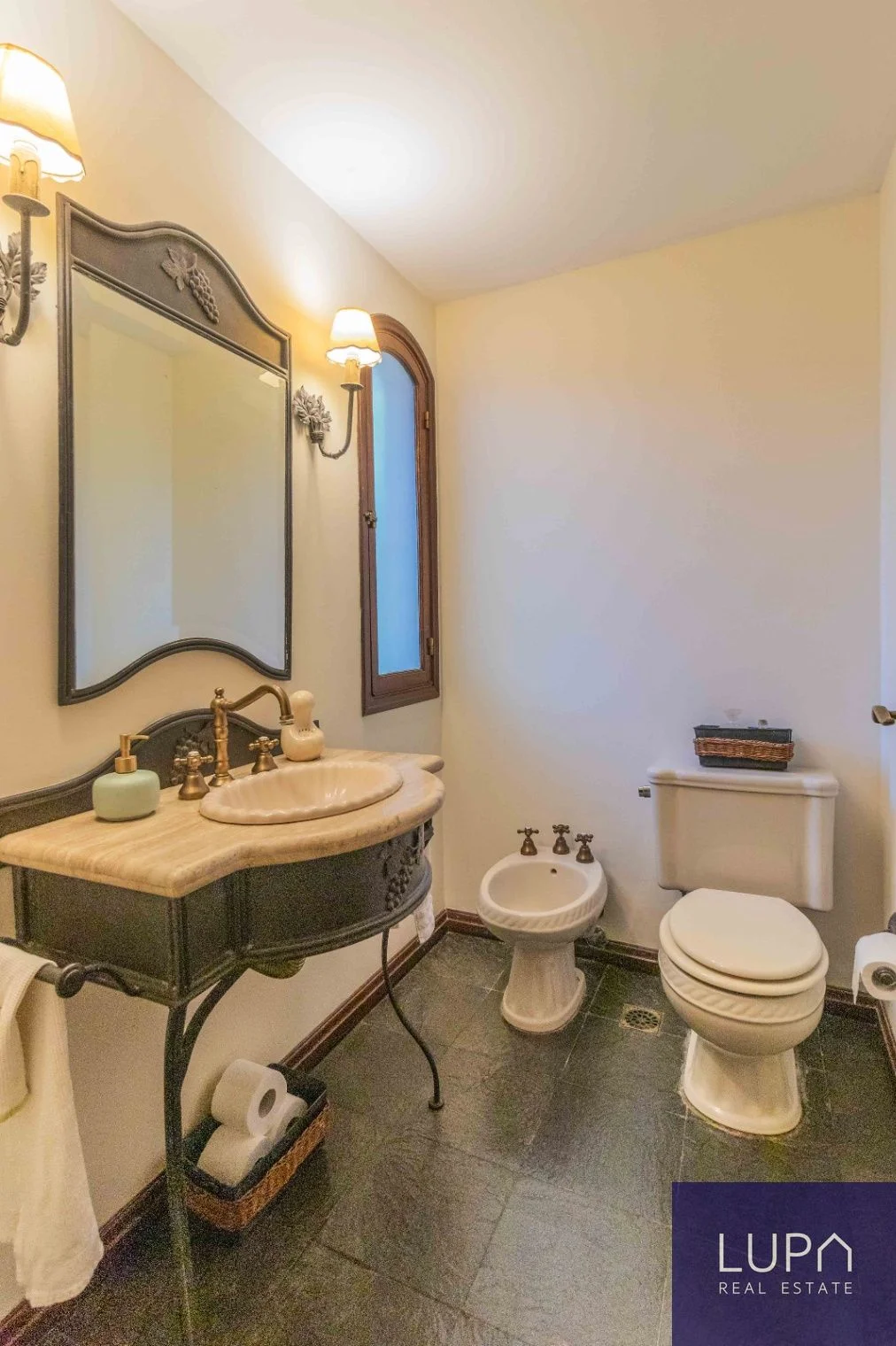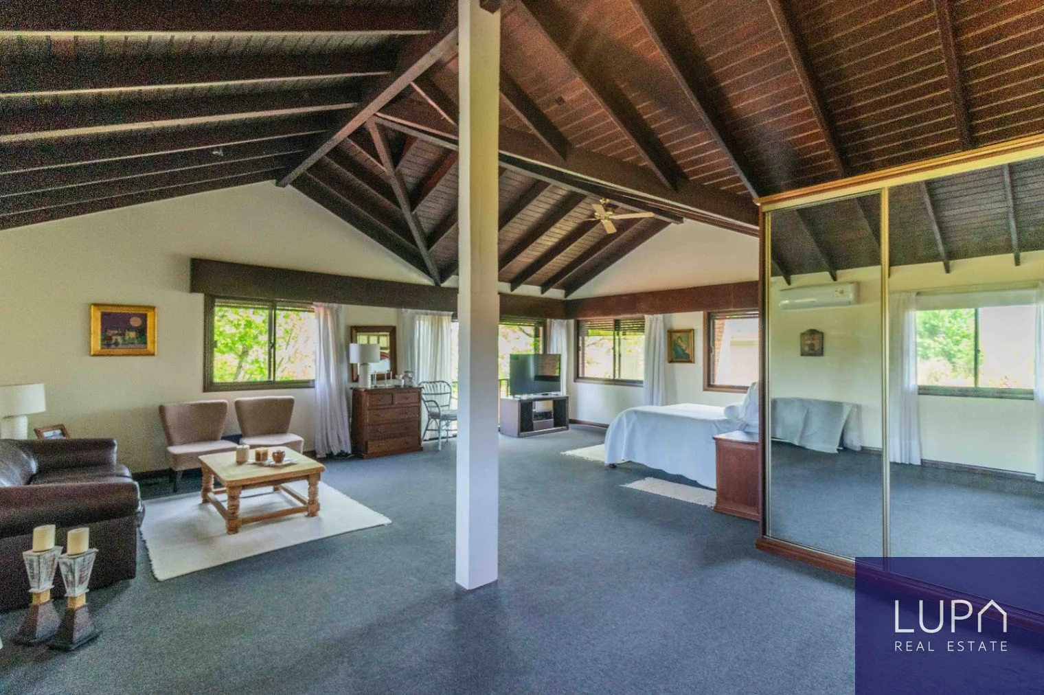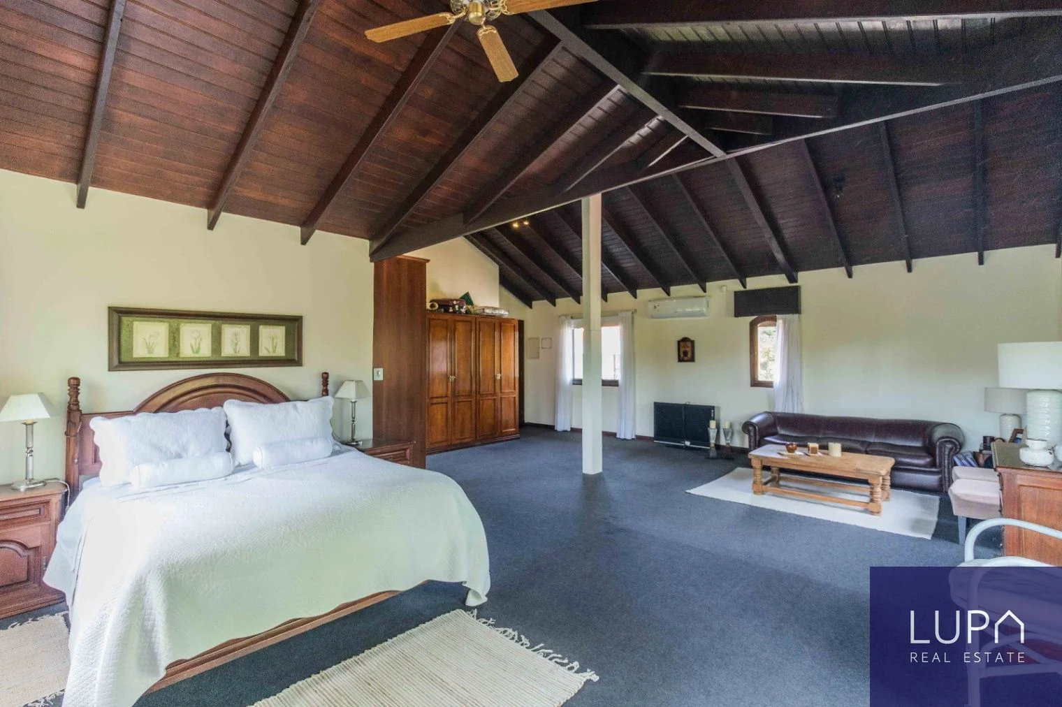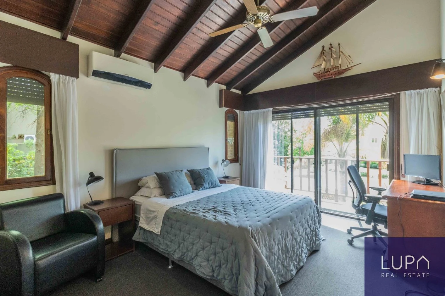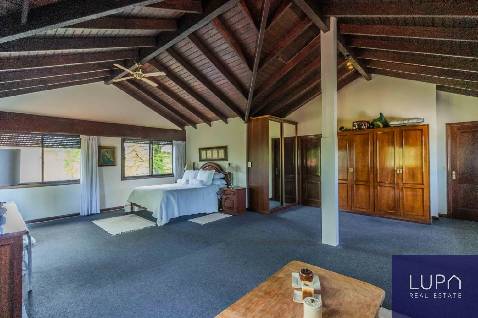 Residencia luminosa frente al golf. Casa de 400 m² en lote de 1.300 m², con construcción sólida, amplios ventanales y privacidad. Dispone de living-comedor, barbacoa techada, cocina con acceso a planta baja (área de servicio y garage doble), 2 dormitorios, baño completo y suite principal en planta alta con espacio extra. Detalles: Calefacción por losa, riego, ventanas dobles, aire acondicionado y cercado completo.