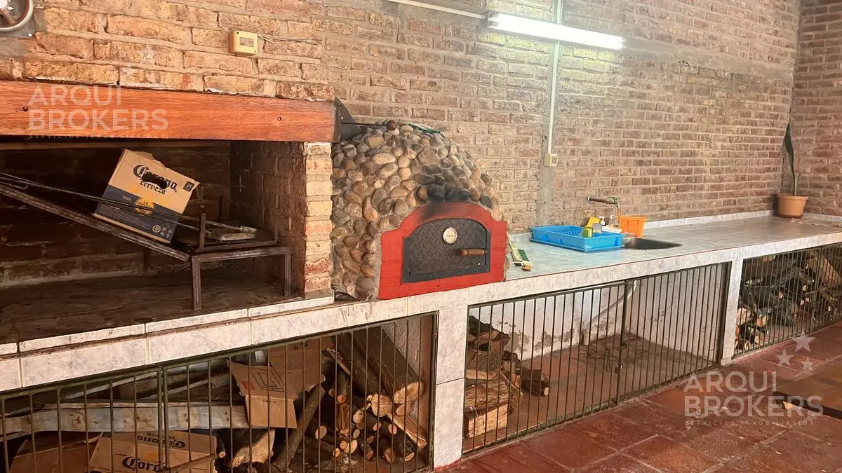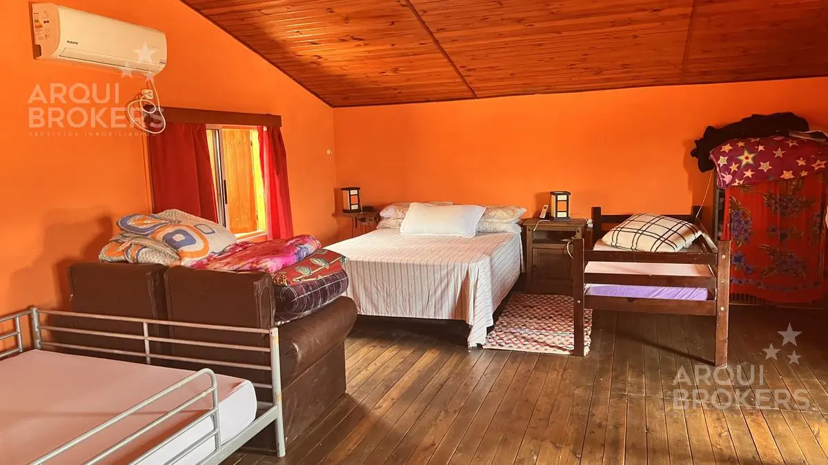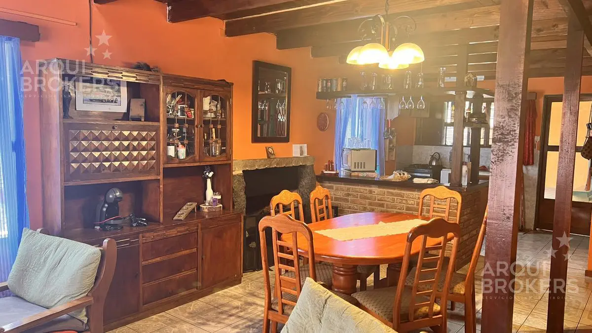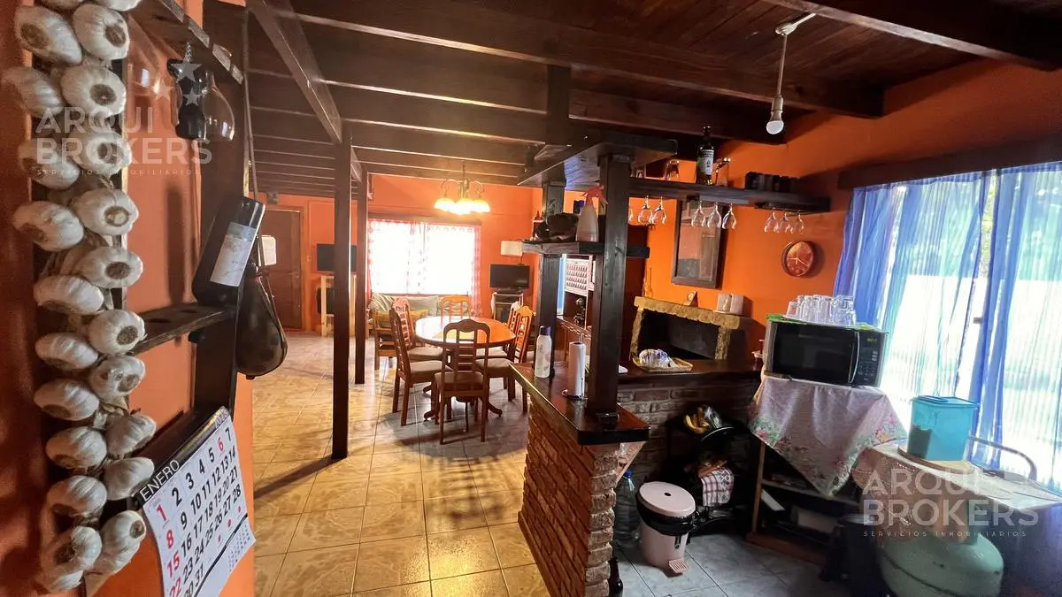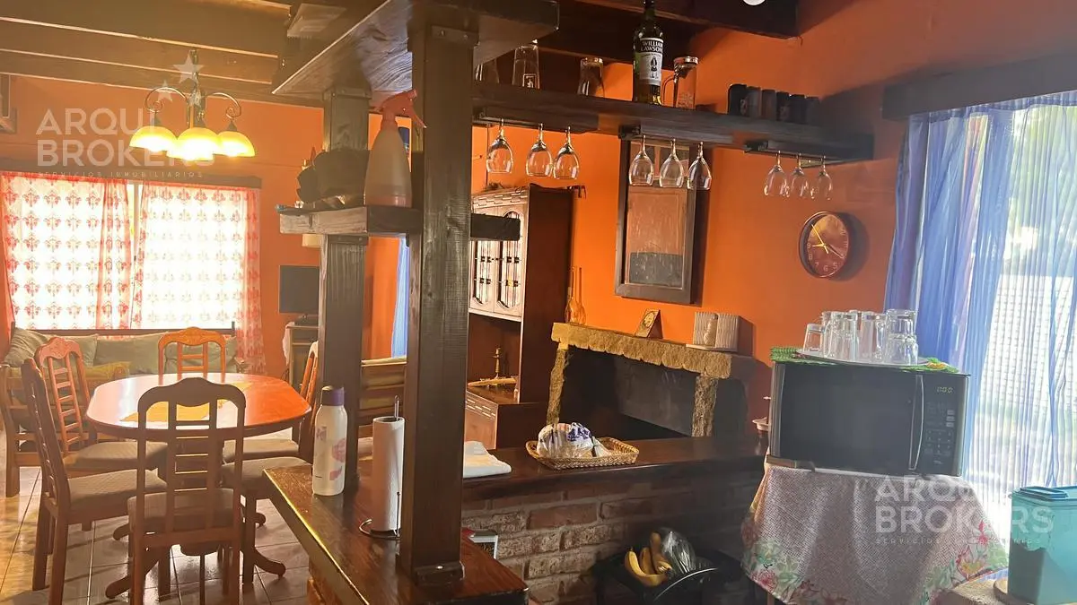 Planta baja Living comedor super amplio. Con sillones de madera muy cómodos estufa a leña con buen tiraje. Cocina integrada con barra amplia cómoda. Con salida a la barbacoa super amplia, techada, con parrillero, horno de pan y amplio espacio de guardado. Habitación amplia independiente de la casa podriá ser otro dormitorio de huespedes.