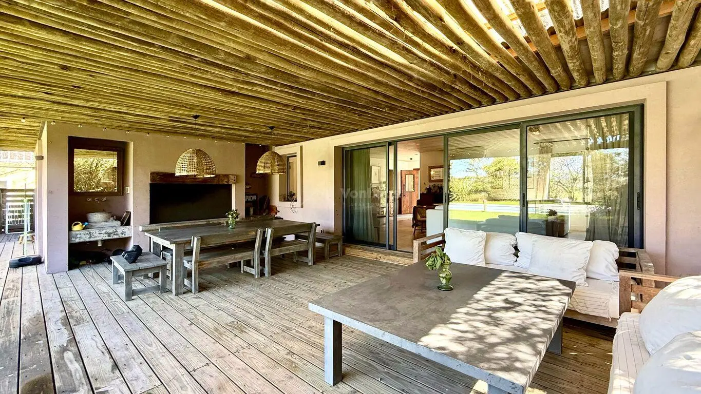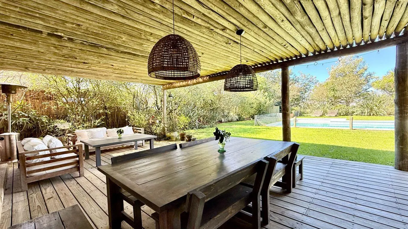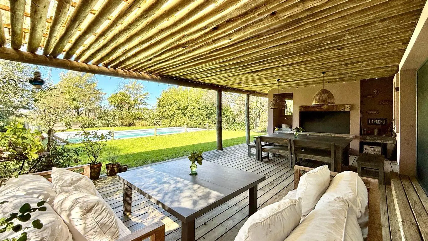 Galeria techada amplia con deck, parrillero y espacio para comedor y living.