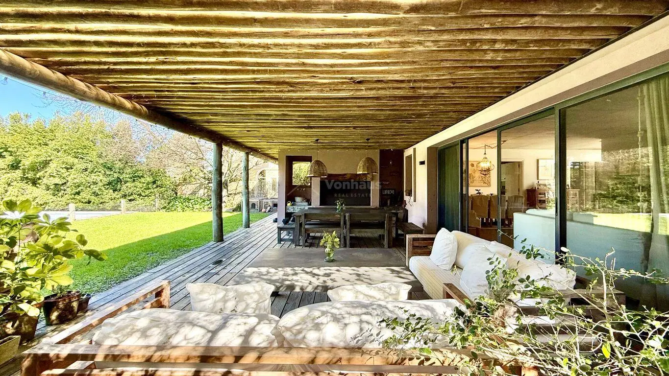 Entrada con lindo paisajismo generando privacidad, living exterior, cochera techada para 2 autos.