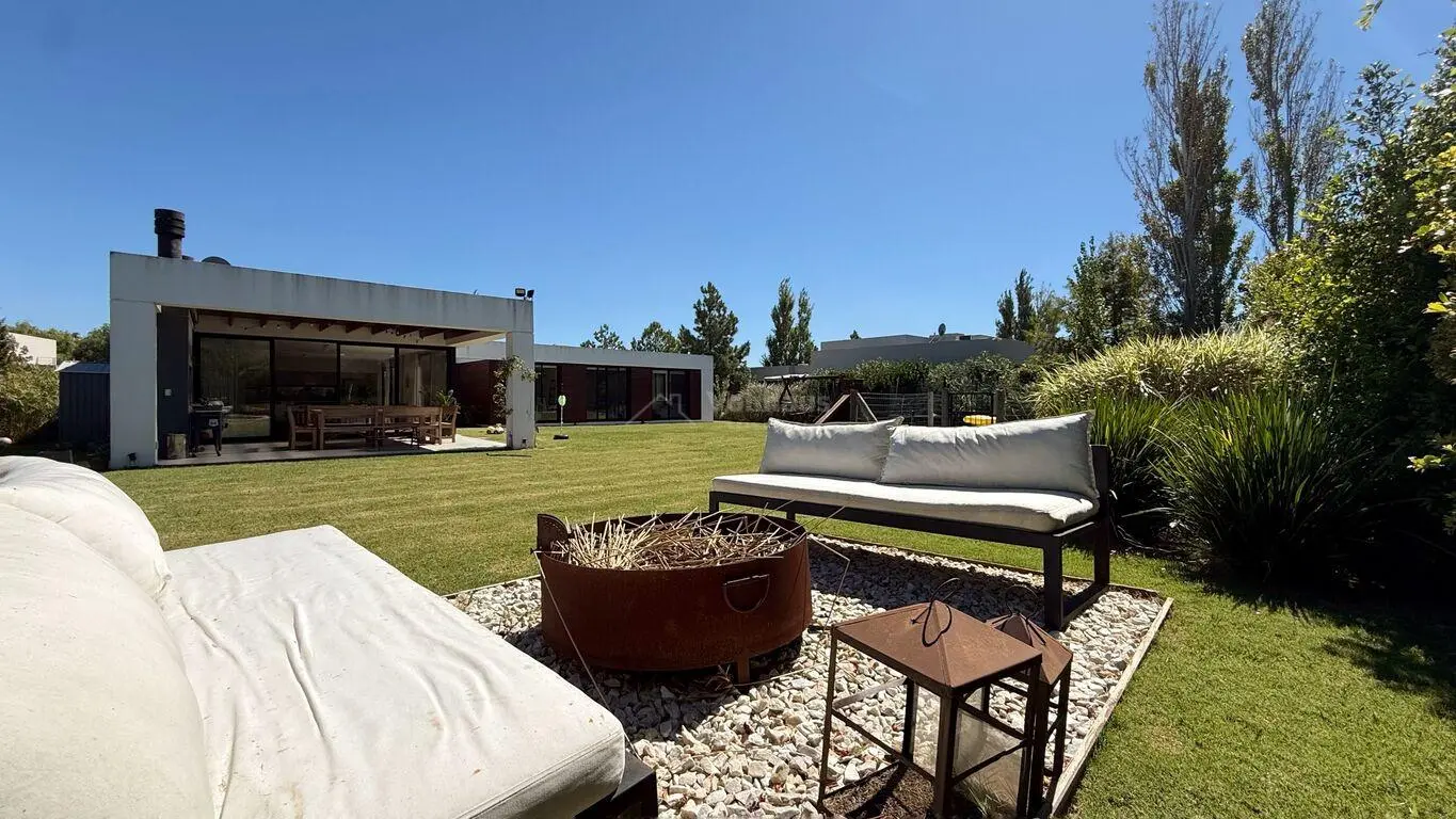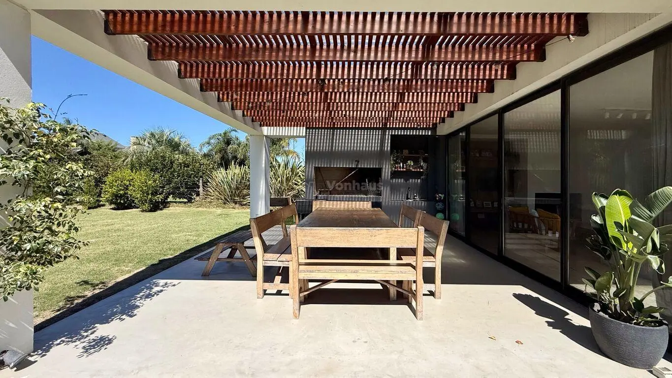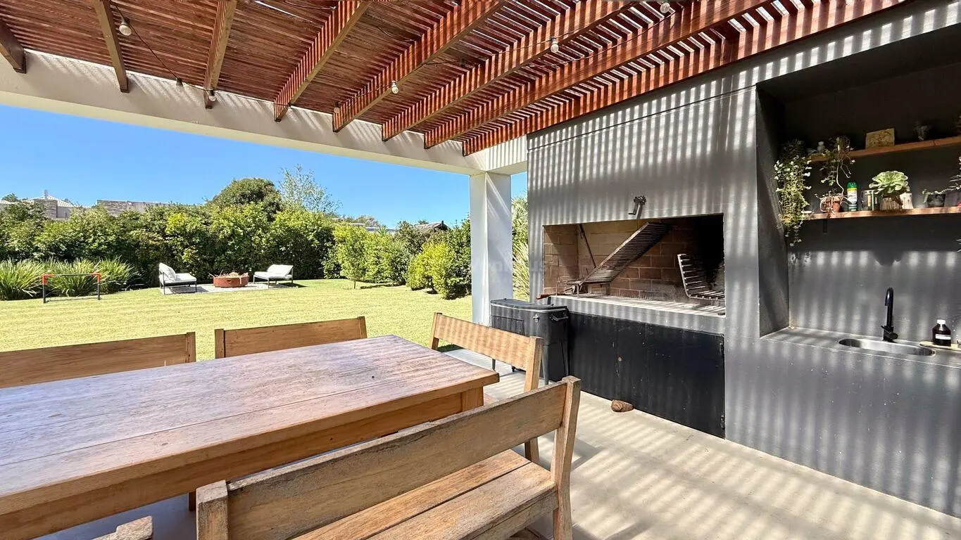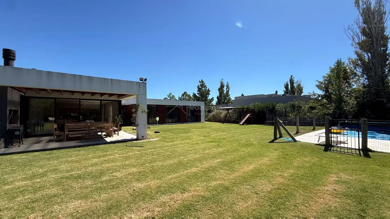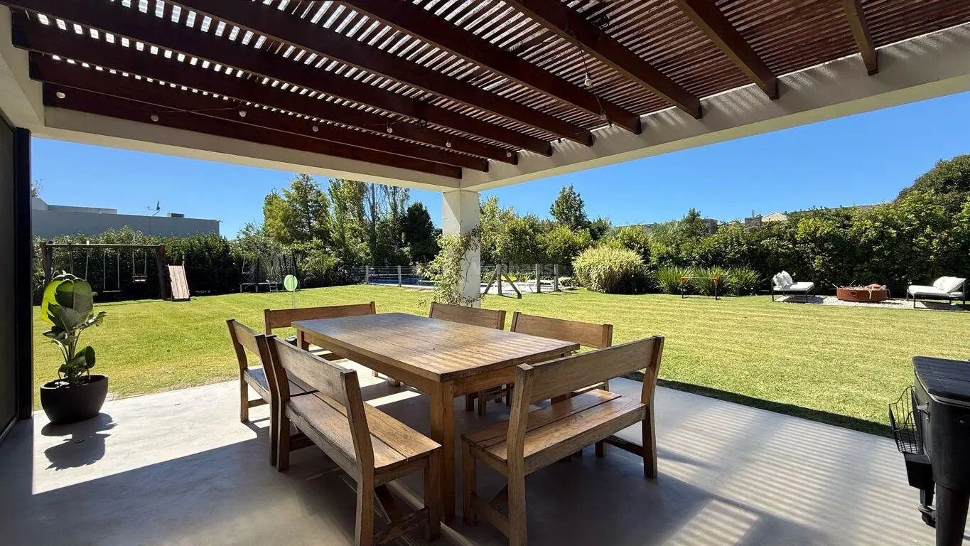 Area exterior con pergola techada con parrillero, piscina climatizada y area de fogon. Jardin muy grande con espacio para juegos de niños, cancha de futbol, etc.