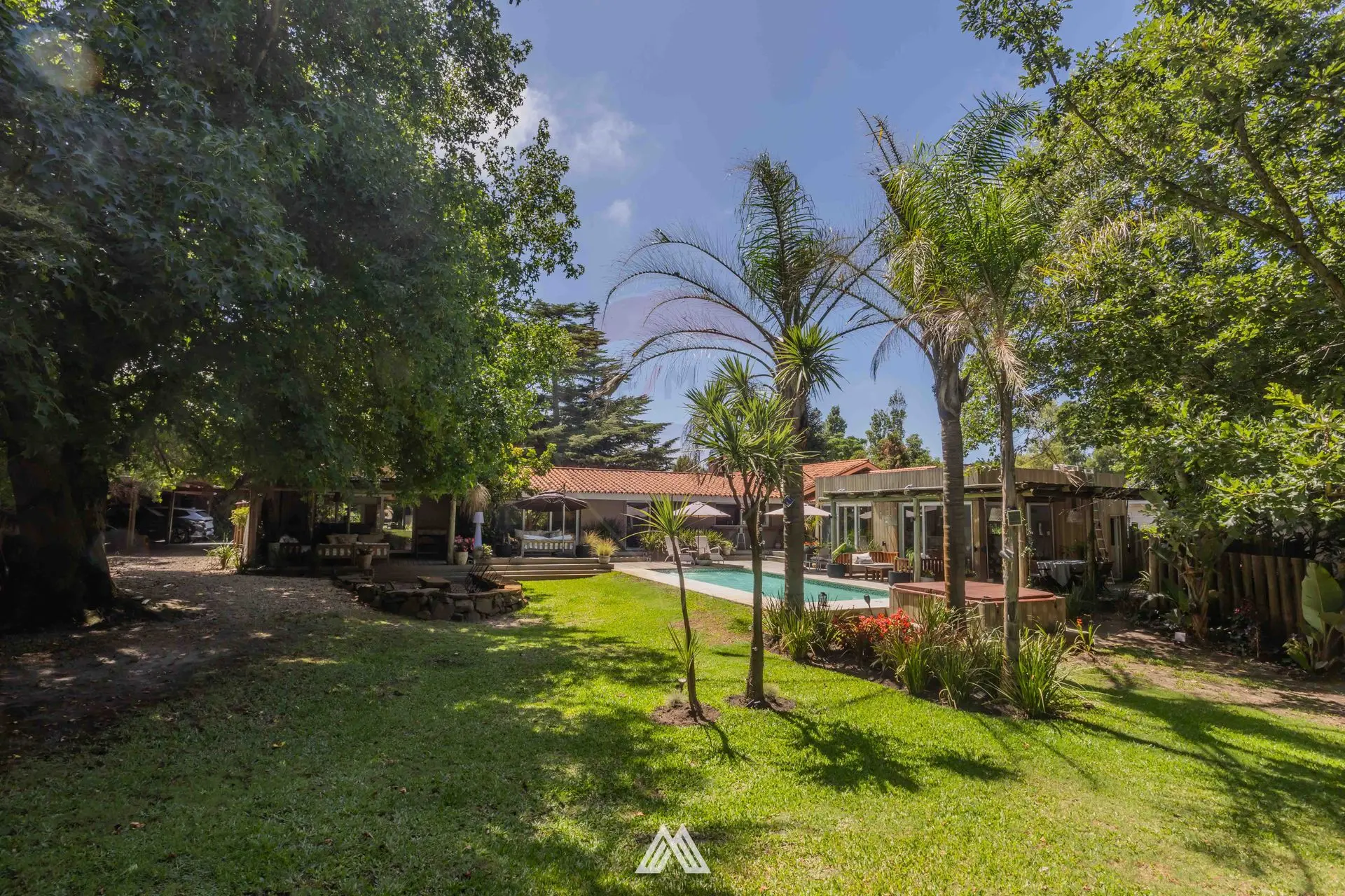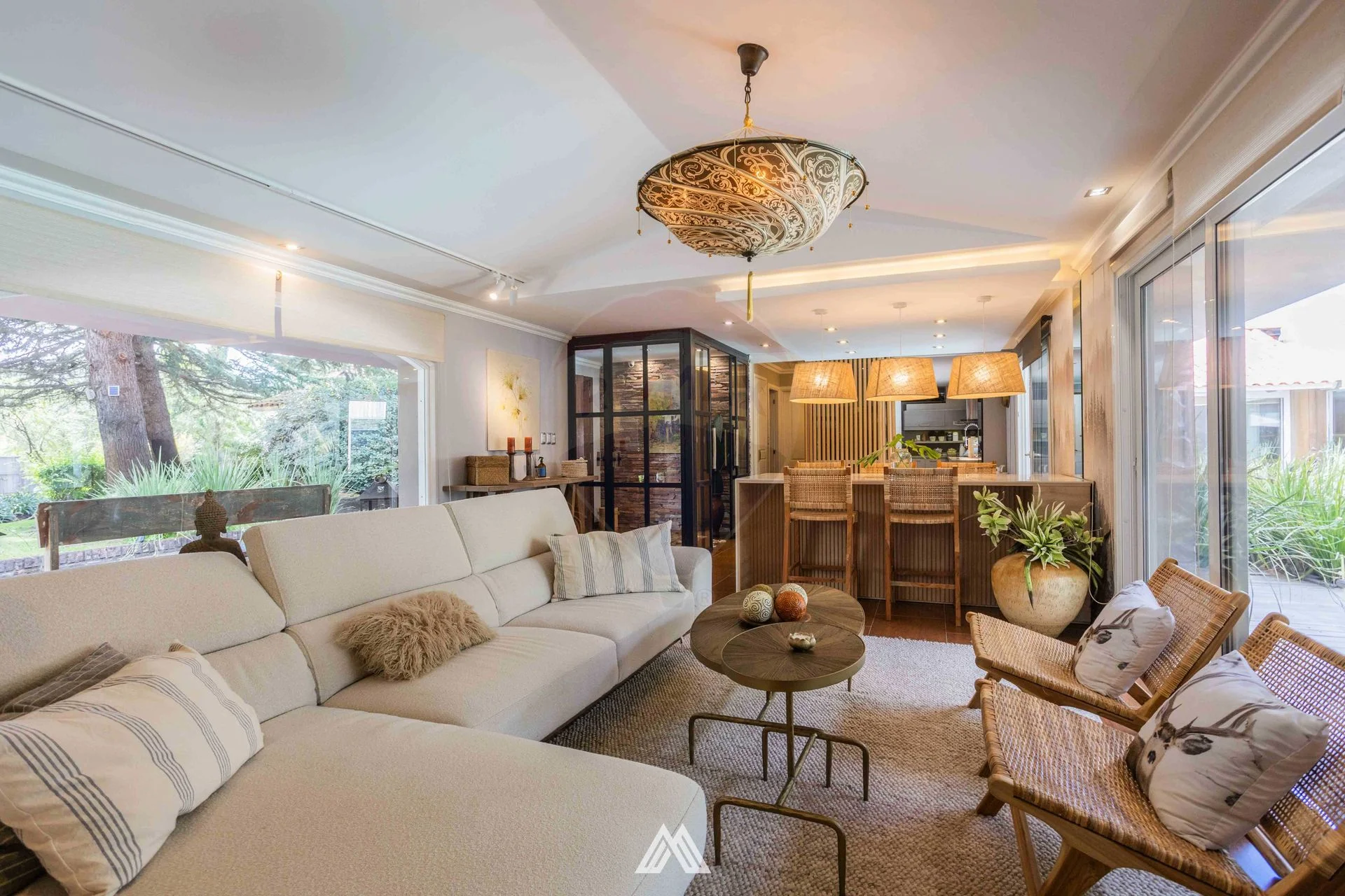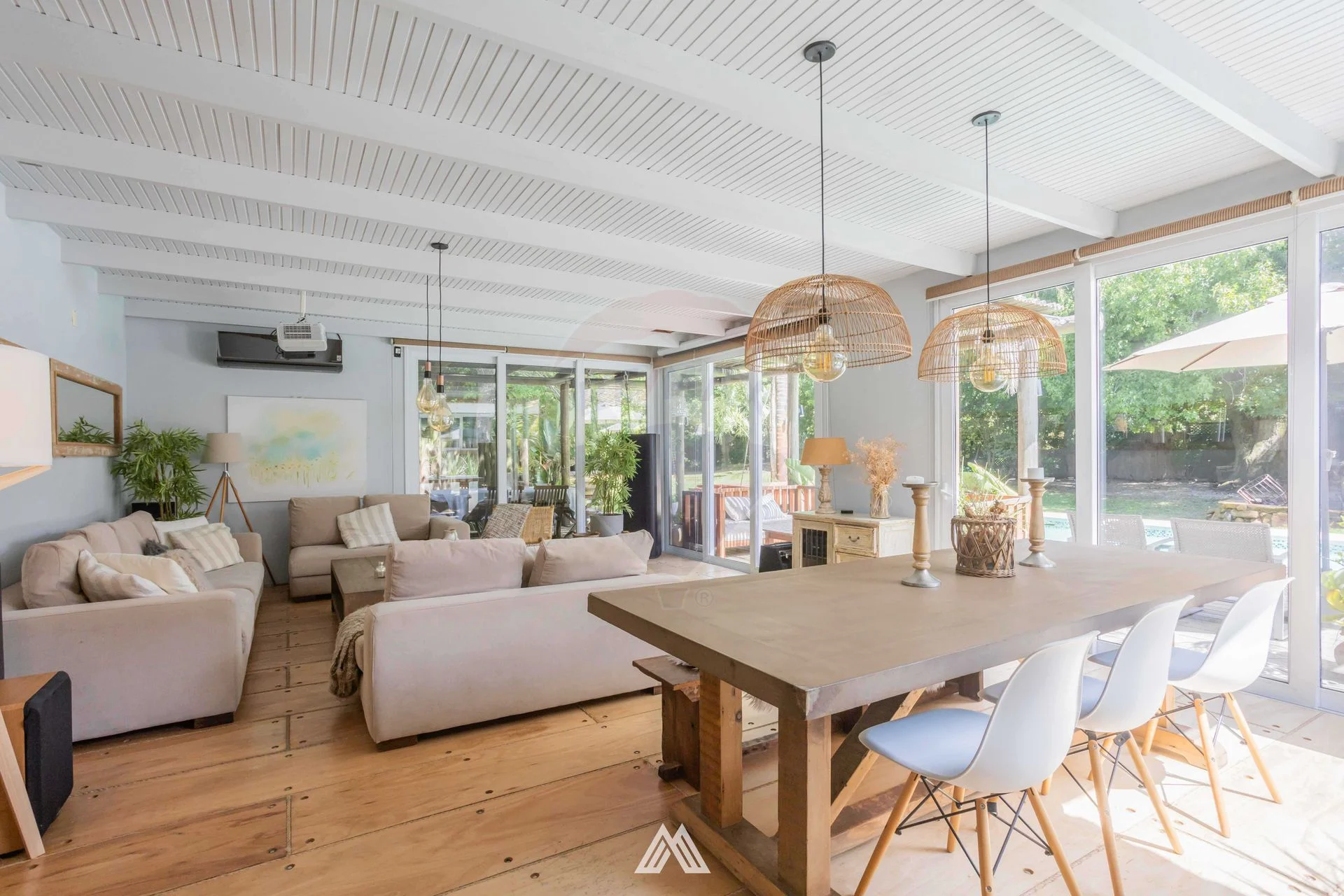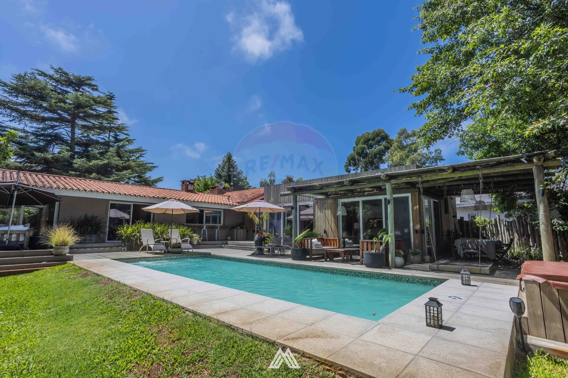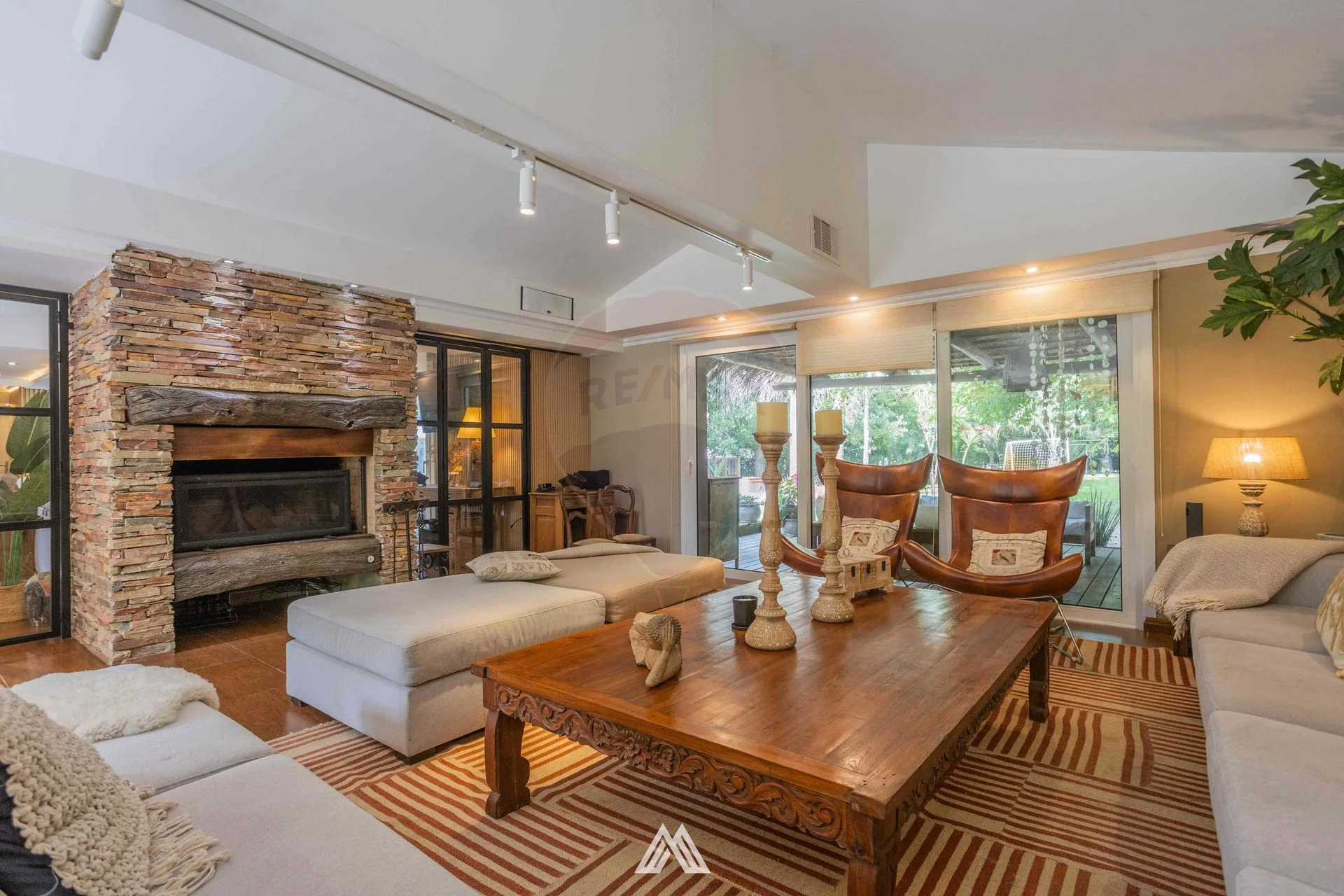 Se ingresa por puerta principal a recibidor con sala de estar comunicada a living comedor con estafua a leña con puerta ventana a hermoso jardin parquizado con 53m2 de pérgolas, fogón, piscina climatizada de 54 m2 y jacuzzi exterior.