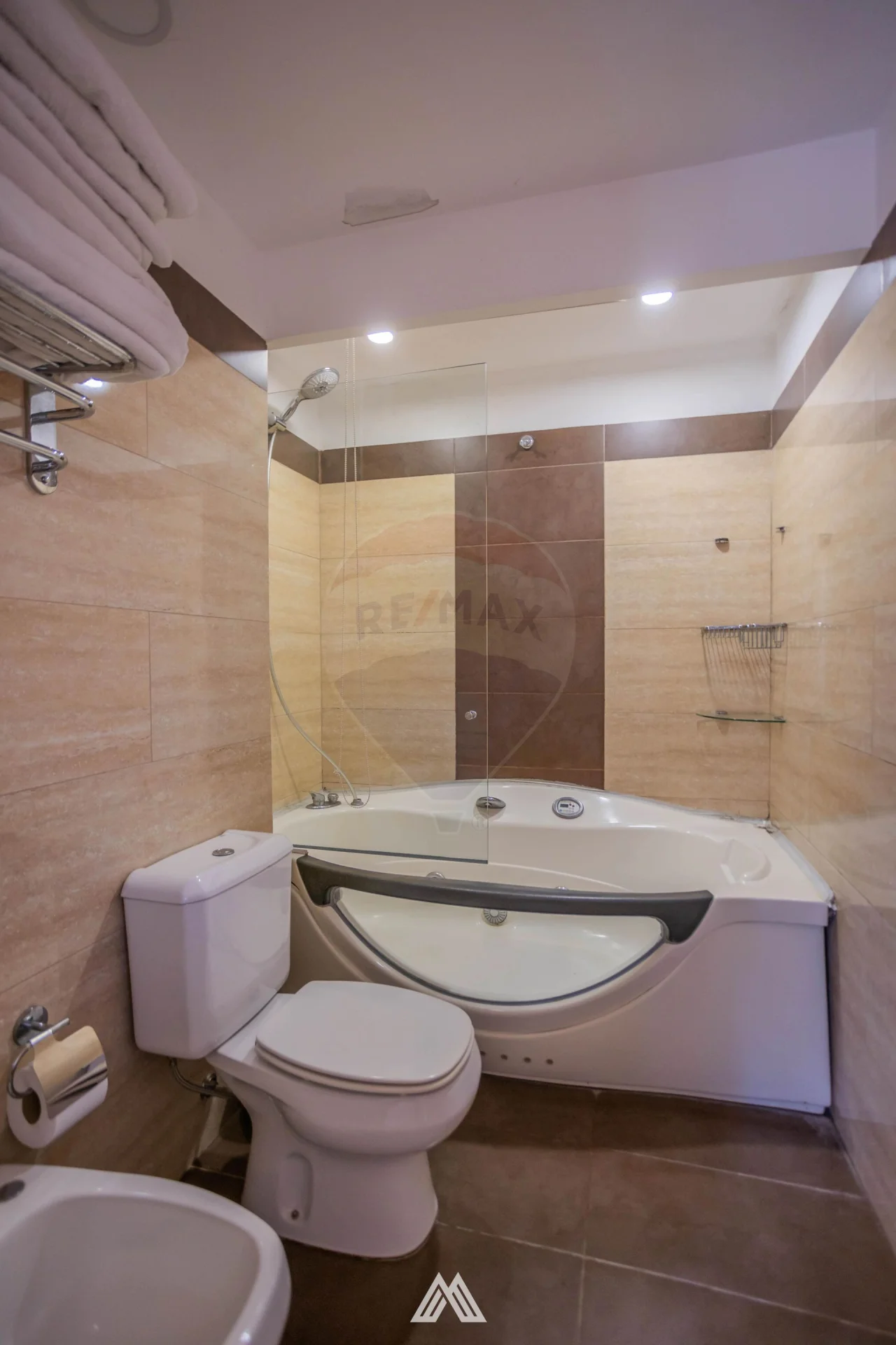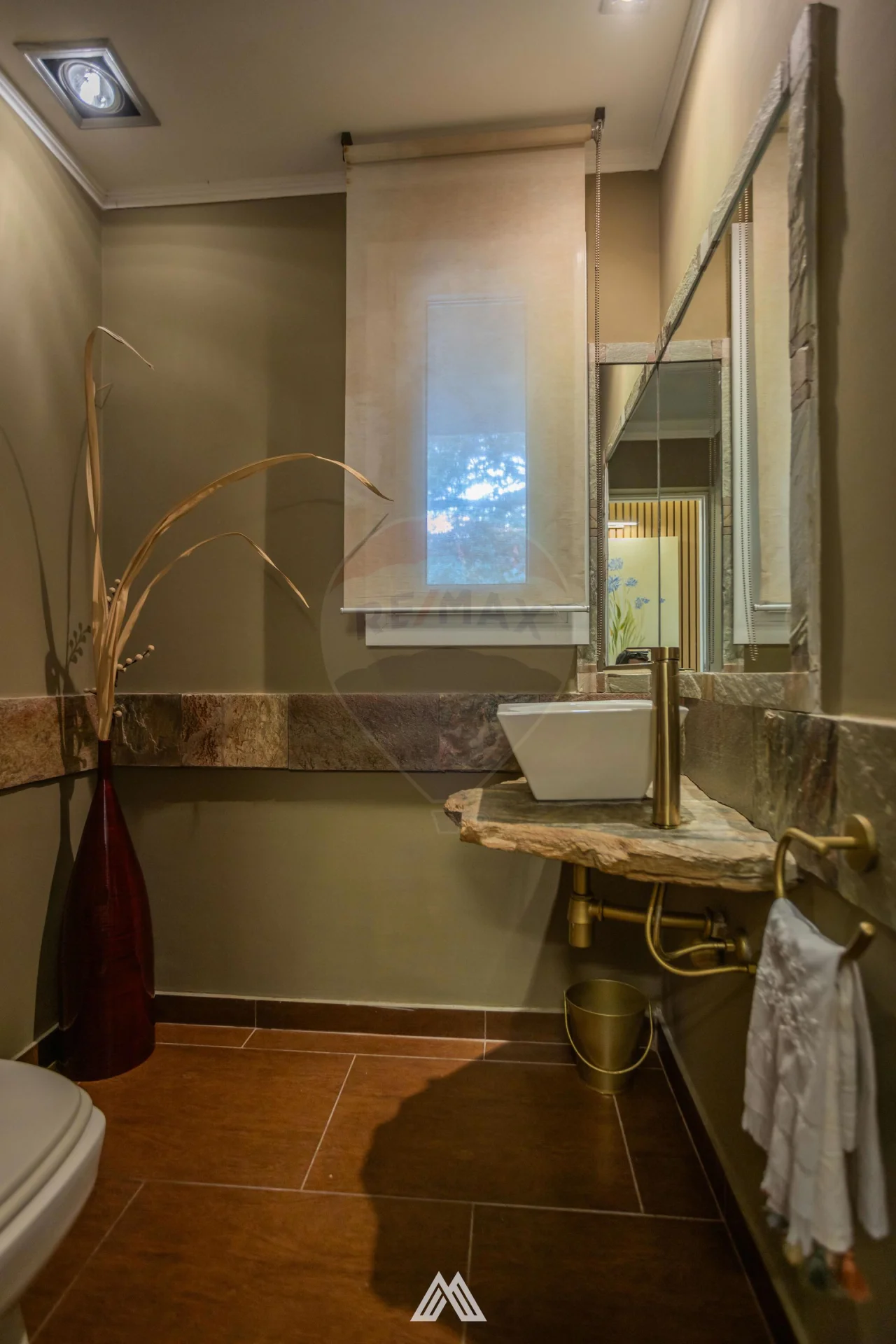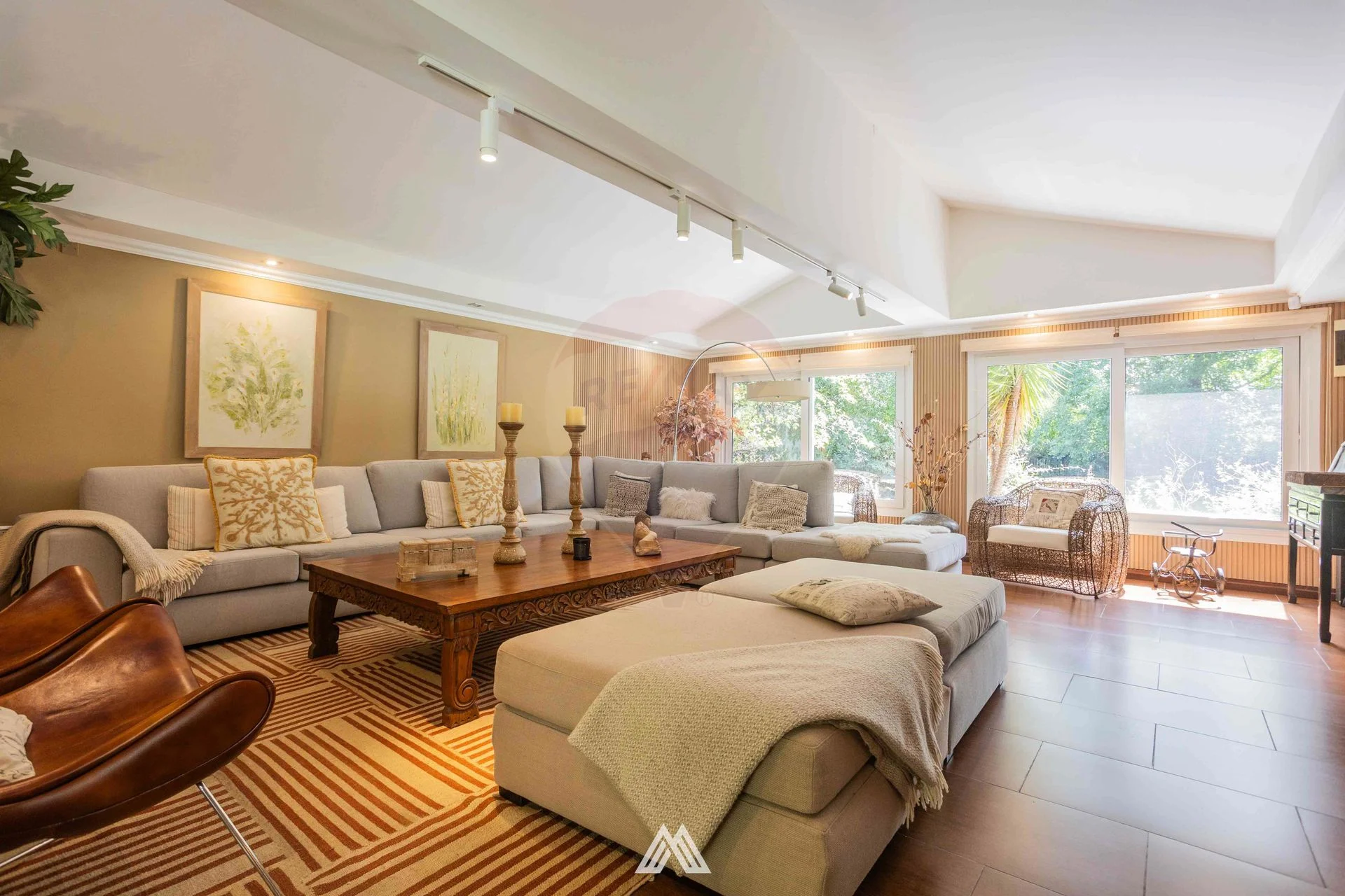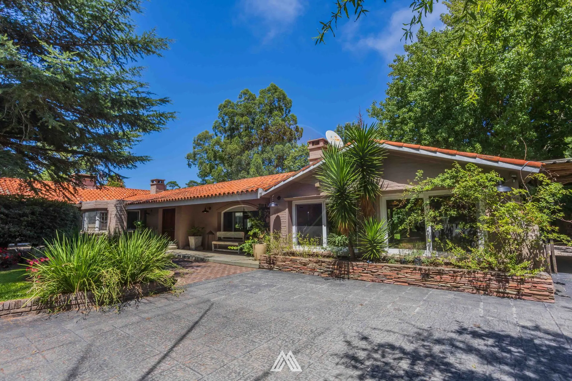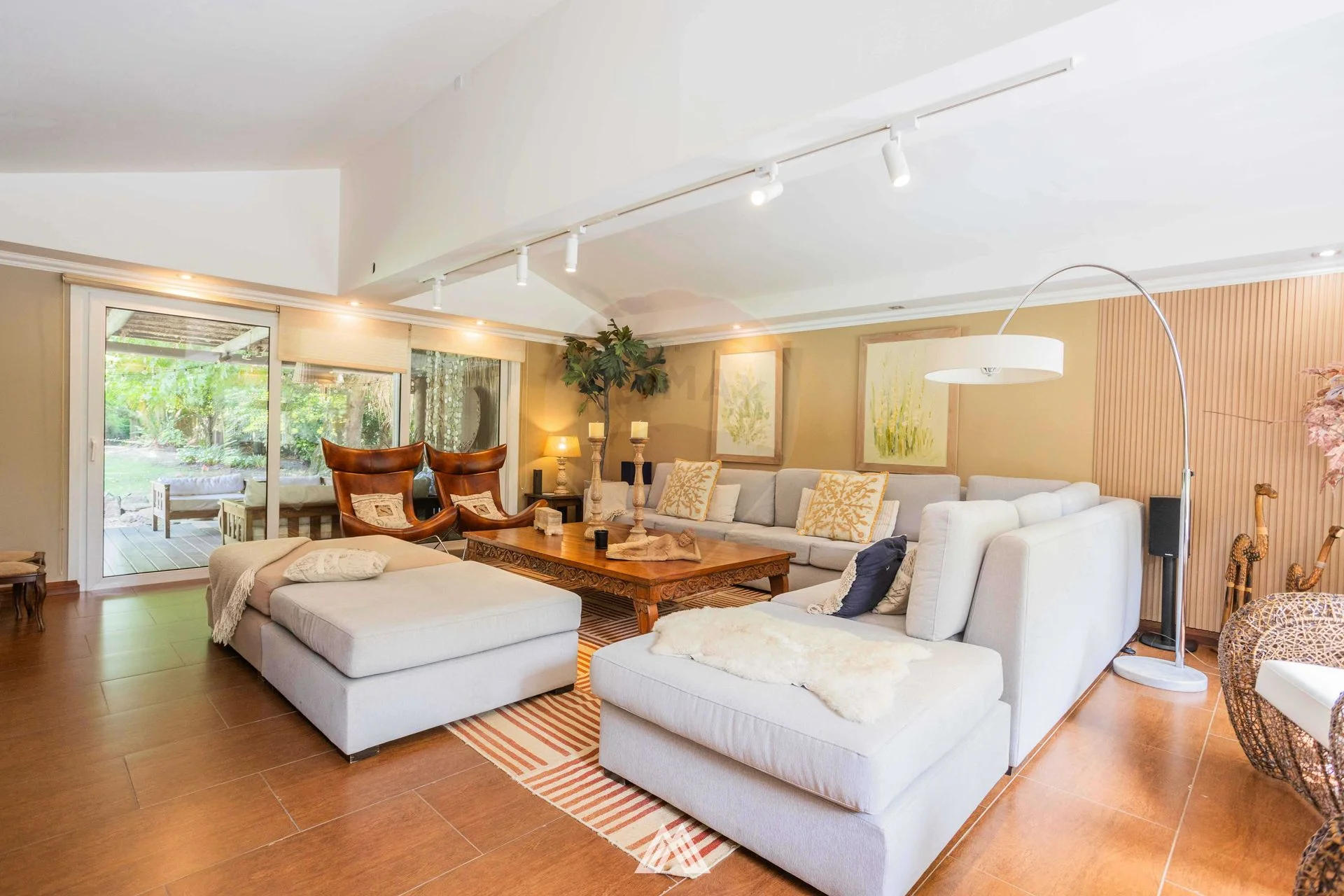 Se ingresa por puerta principal a recibidor con sala de estar comunicada a living comedor con estafua a leña con puerta ventana a hermoso jardin parquizado con 53m2 de pérgolas, fogón, piscina climatizada de 54 m2 y jacuzzi exterior.