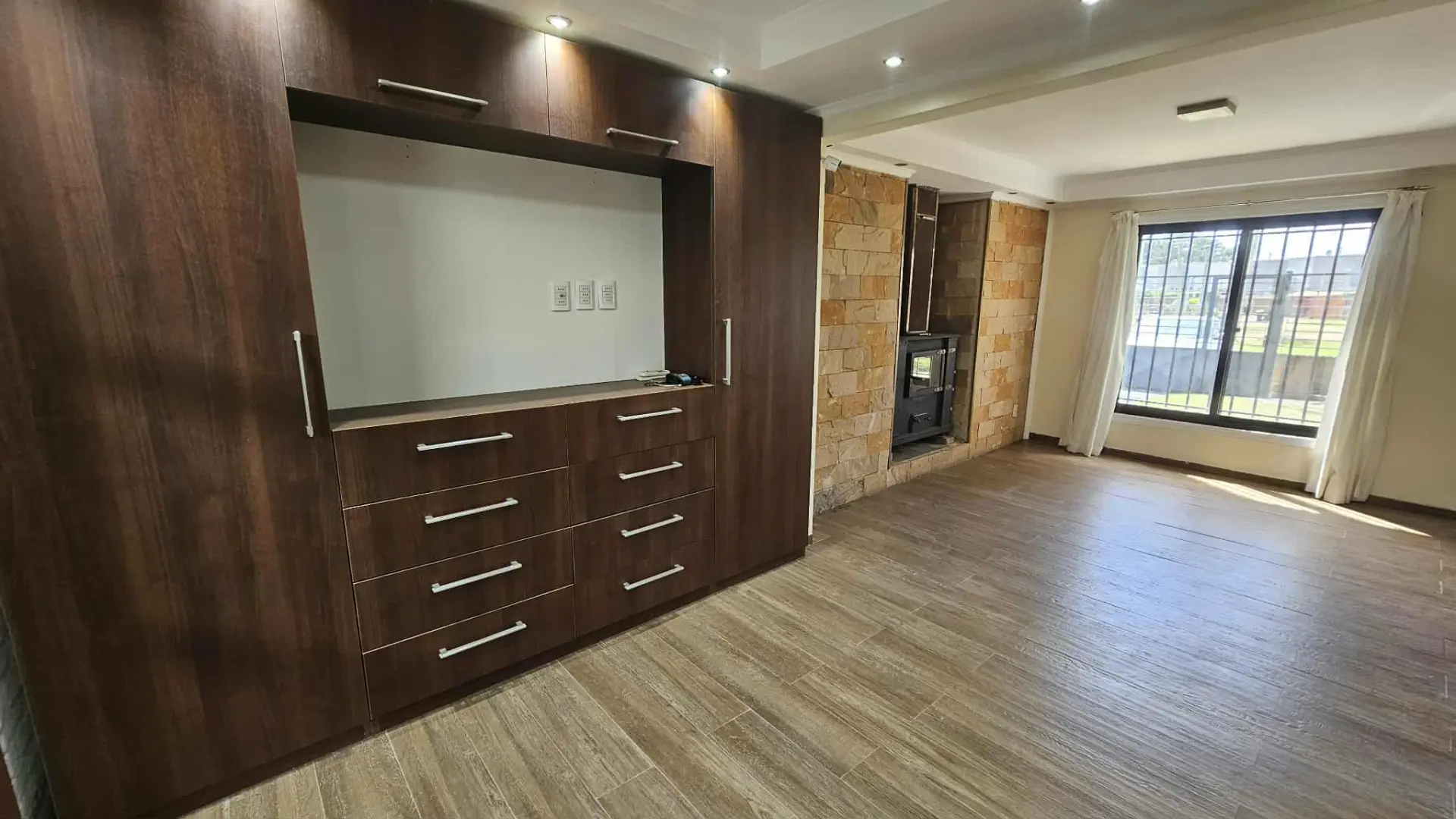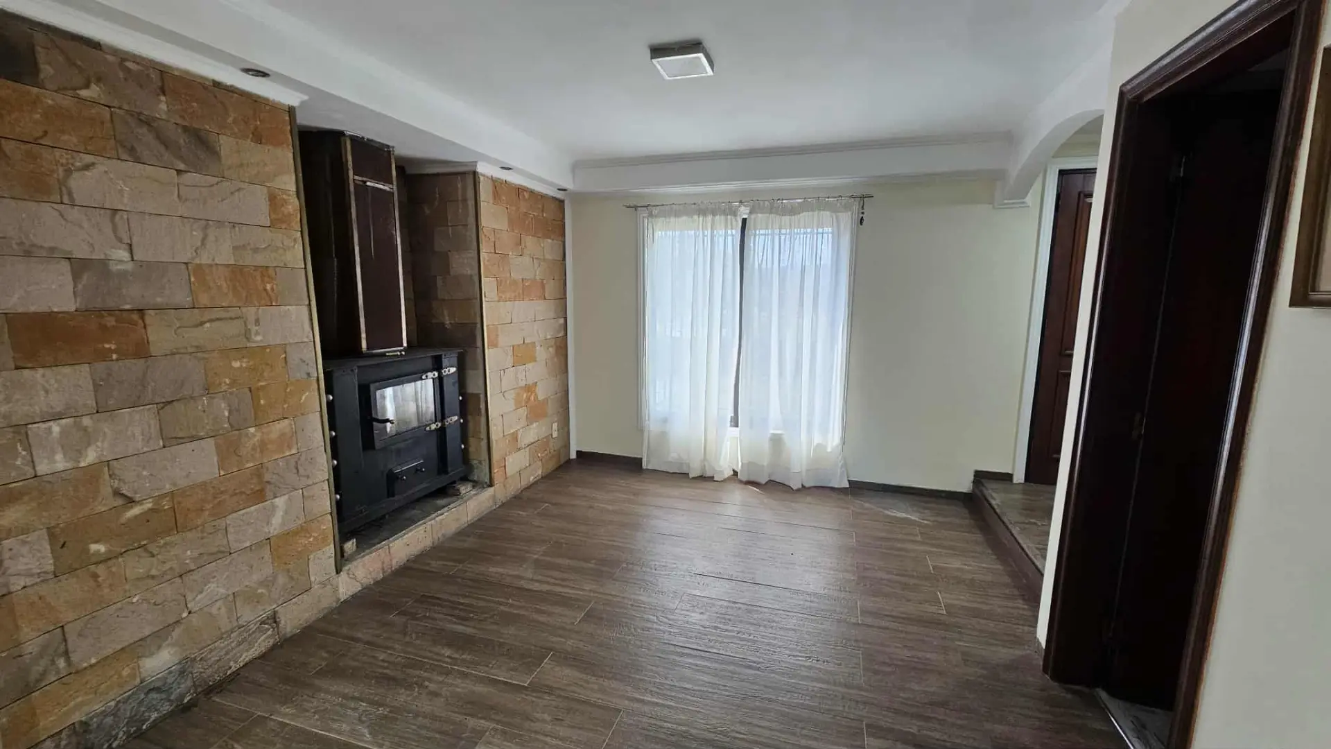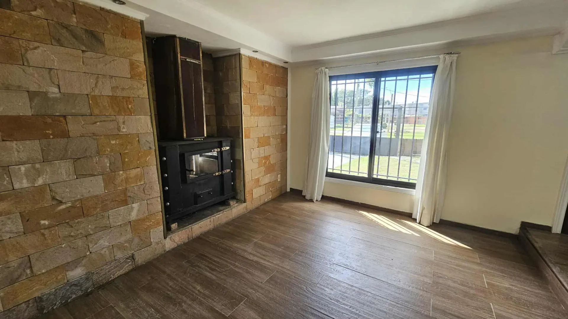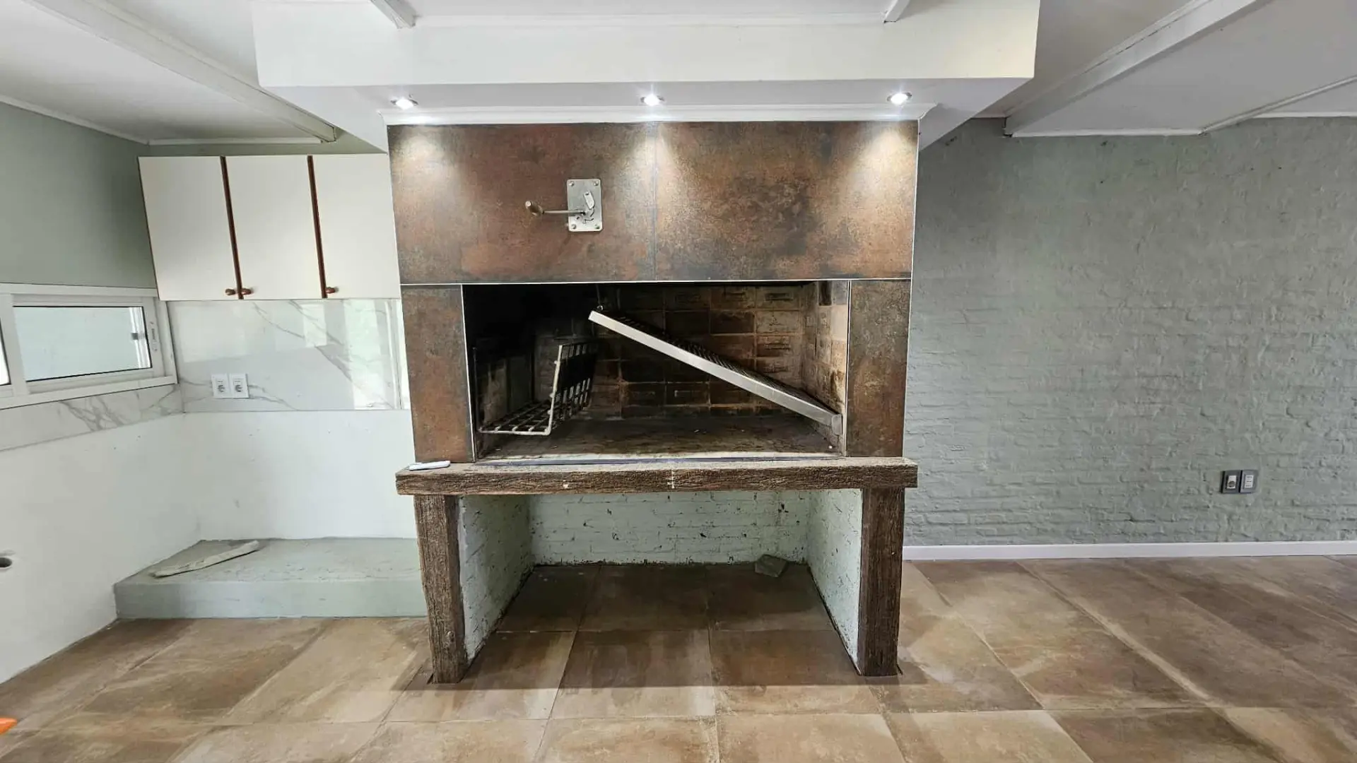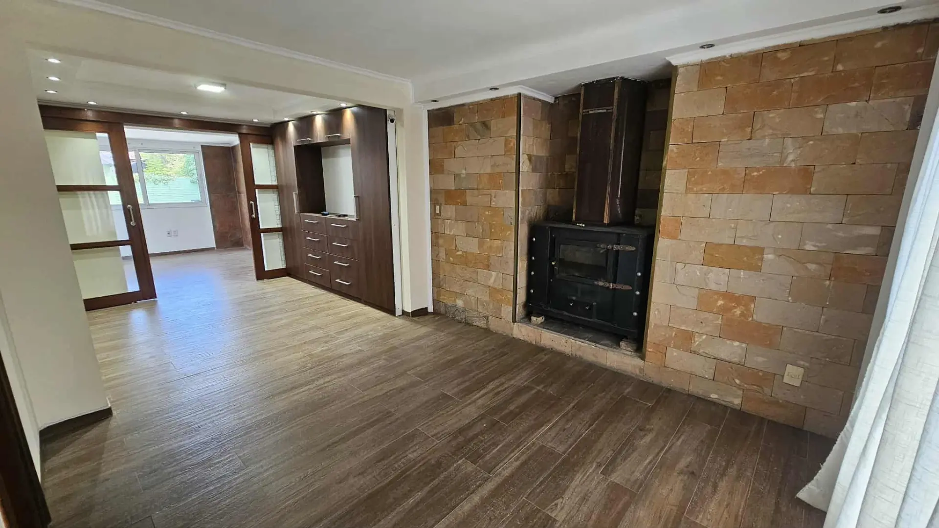 Gran Area social con calefactor a leña, enductado hacia planta alta.