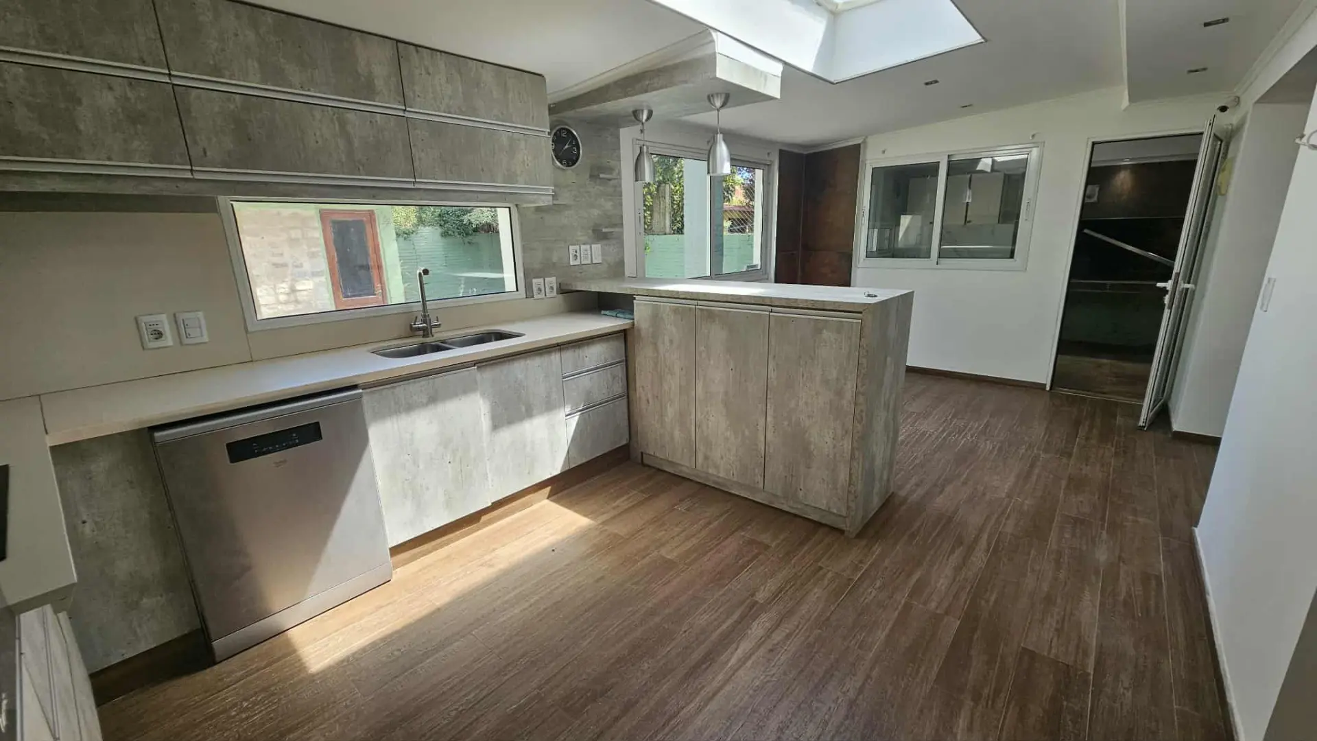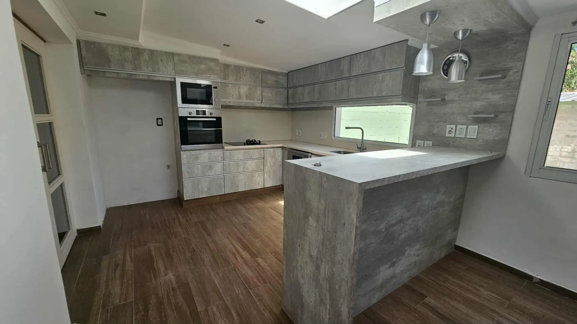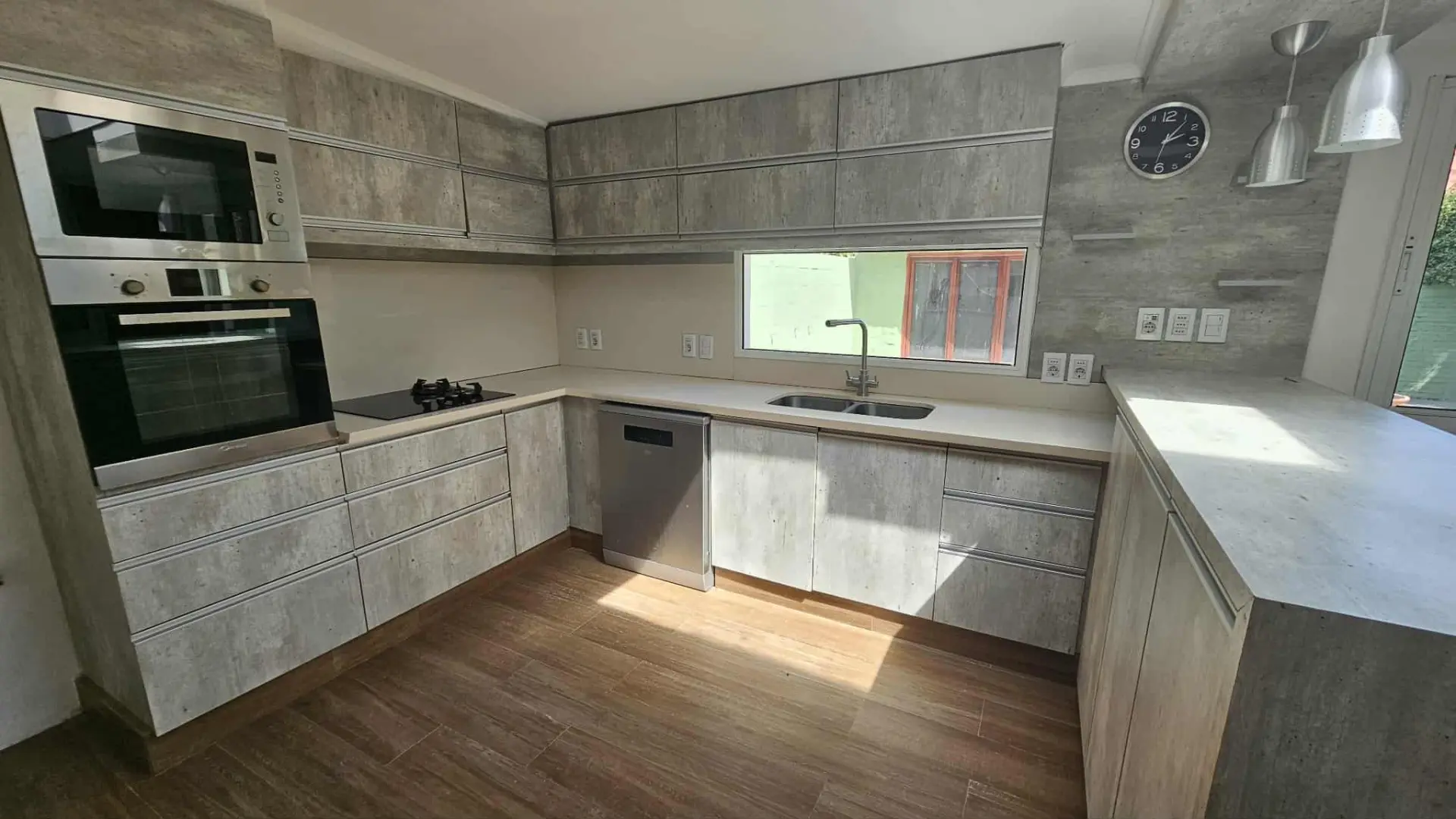 Cocina comedor totalmente equipada y nueva con gran profusión de placares, anafe, horno empotrado, lavavajillas y microondas.