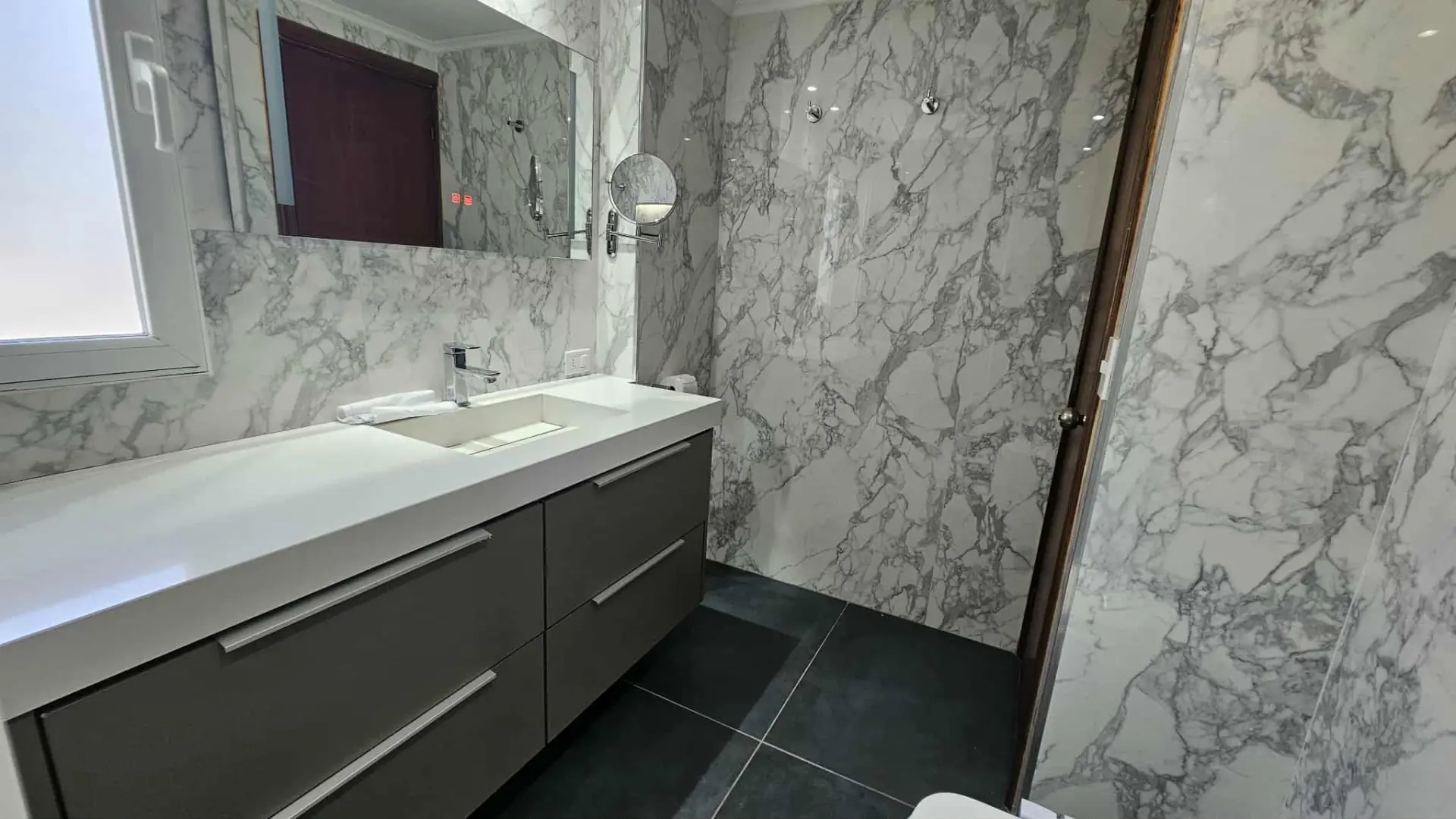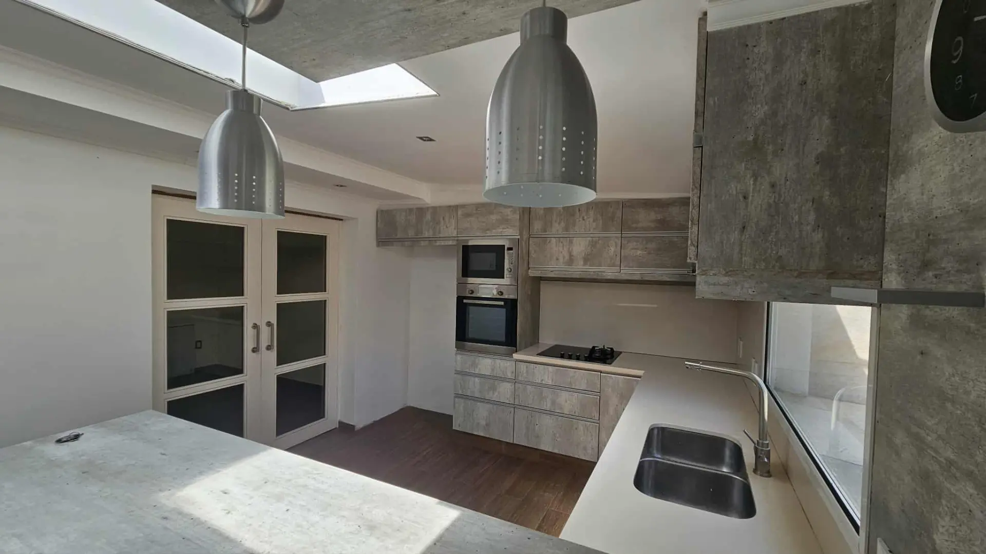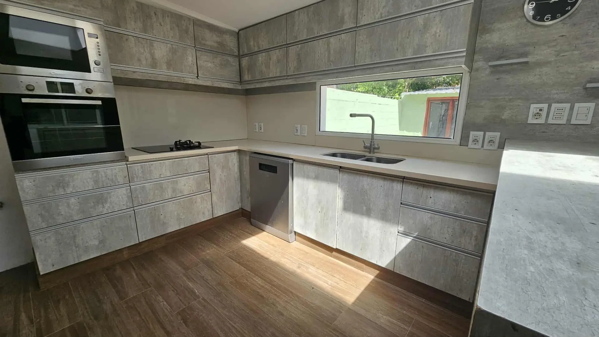 Cocina comedor totalmente equipada y nueva con gran profusión de placares, anafe, horno empotrado, lavavajillas y microondas.
