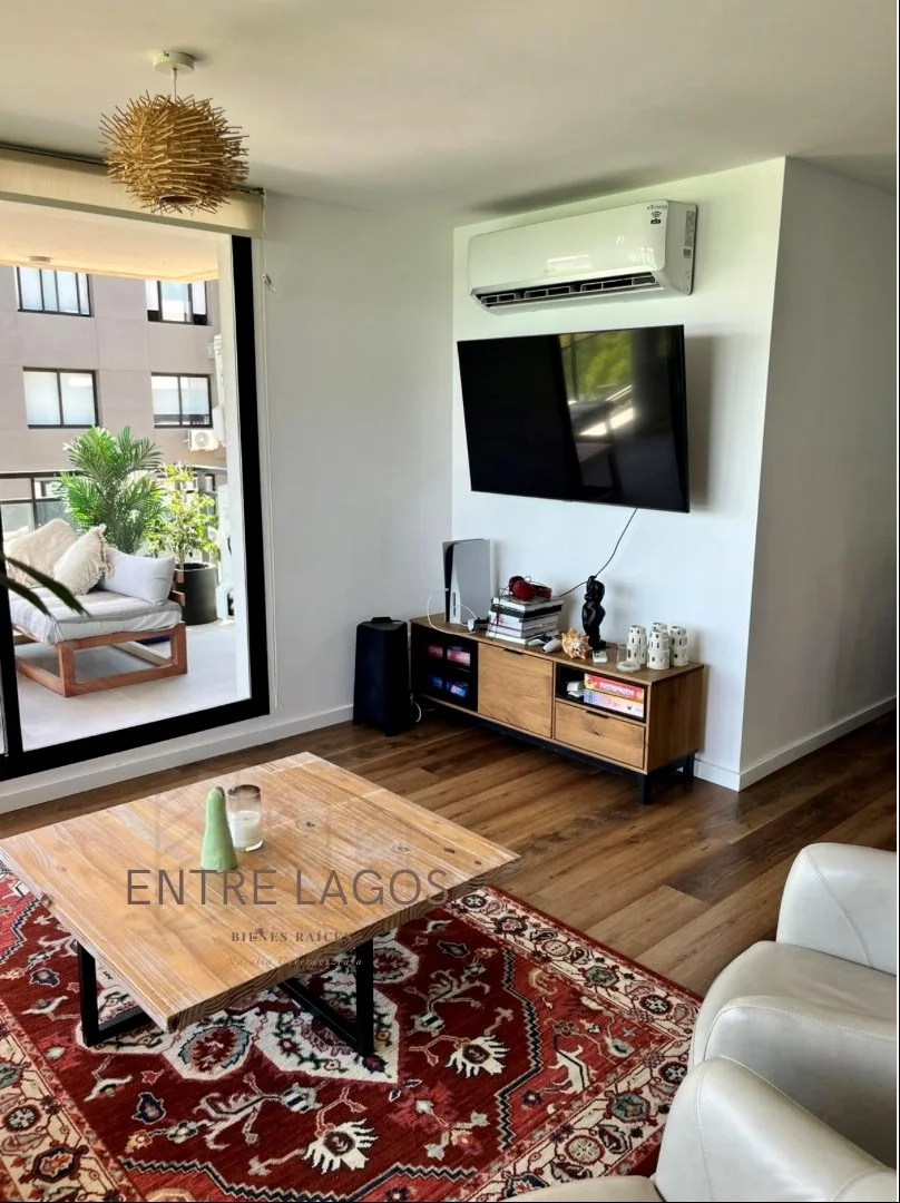 Living comedor con salida a amplio balcón en L con parrillero y aire acondicionado.