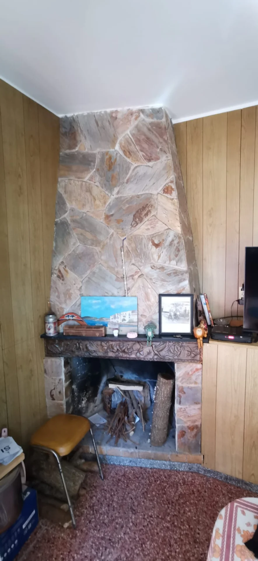 Interior con living comedor, cocina amplia con estufa a leña, baño con mampara y dos dormitorios, uno de ellos con aire acondicionado.
