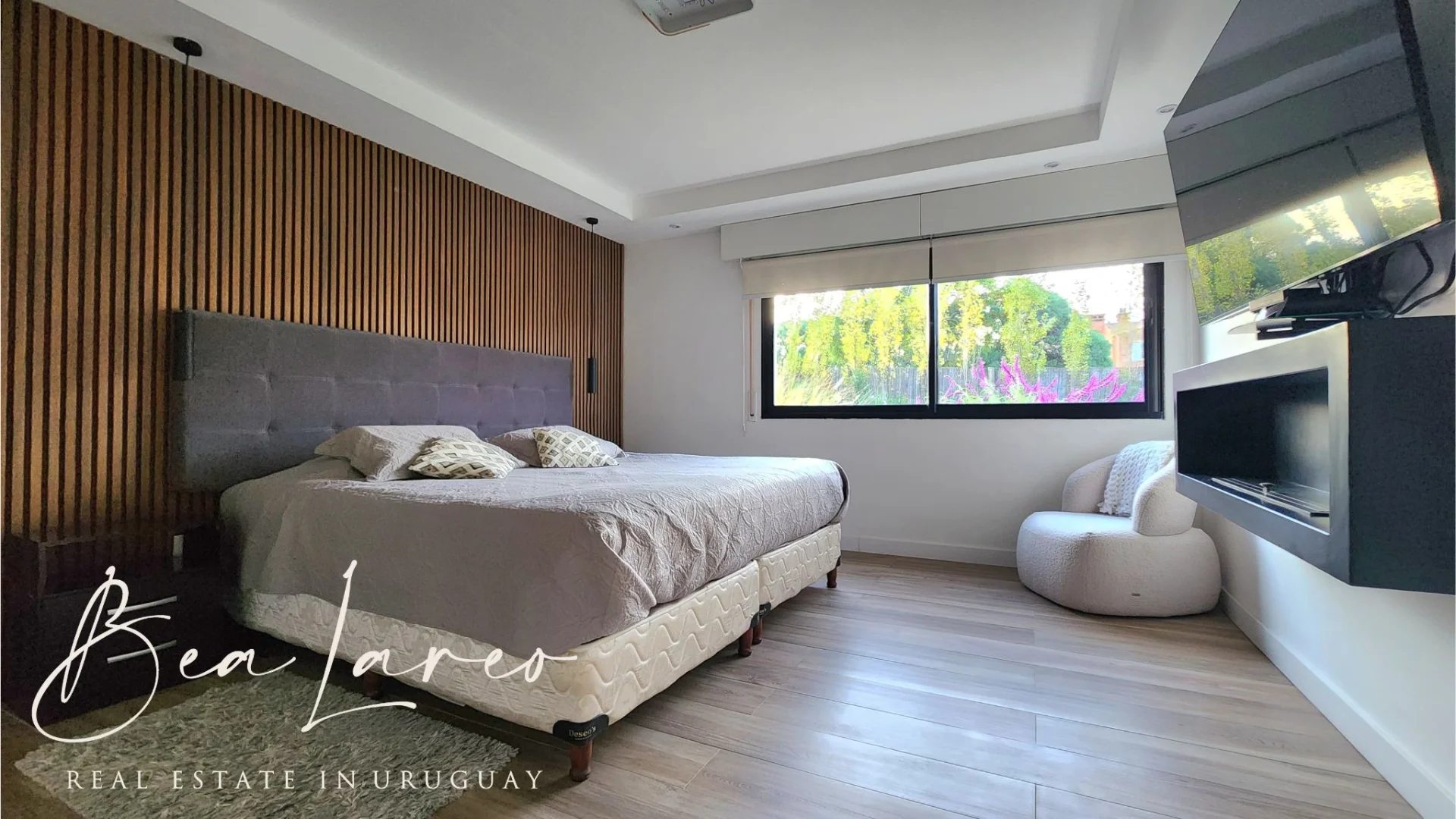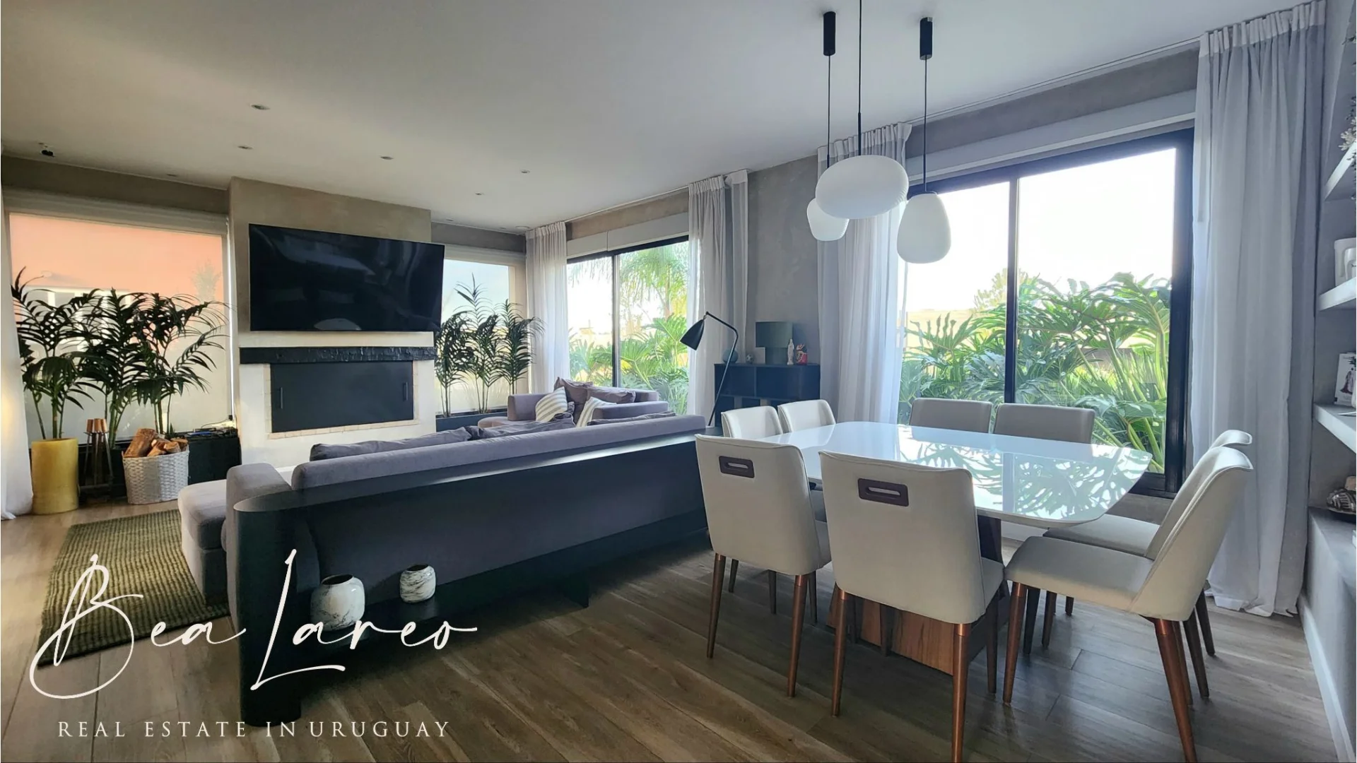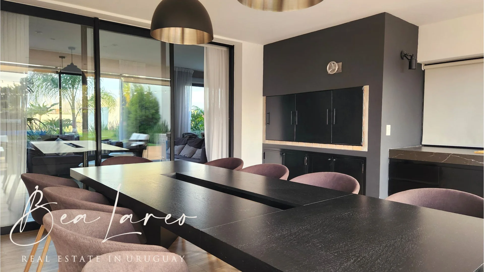Dispone de un agradable living comedor con estufa a leña, moderna cocina semi integrada con puertas francesas conectada con la terraza, y toilette. Espectacular barbacoa con parrillero integrada al espacio interior de la casa. Lavadero. En el área intima dispone de 3 amplios dormitorios en suite, el principal con un gran vestidor.