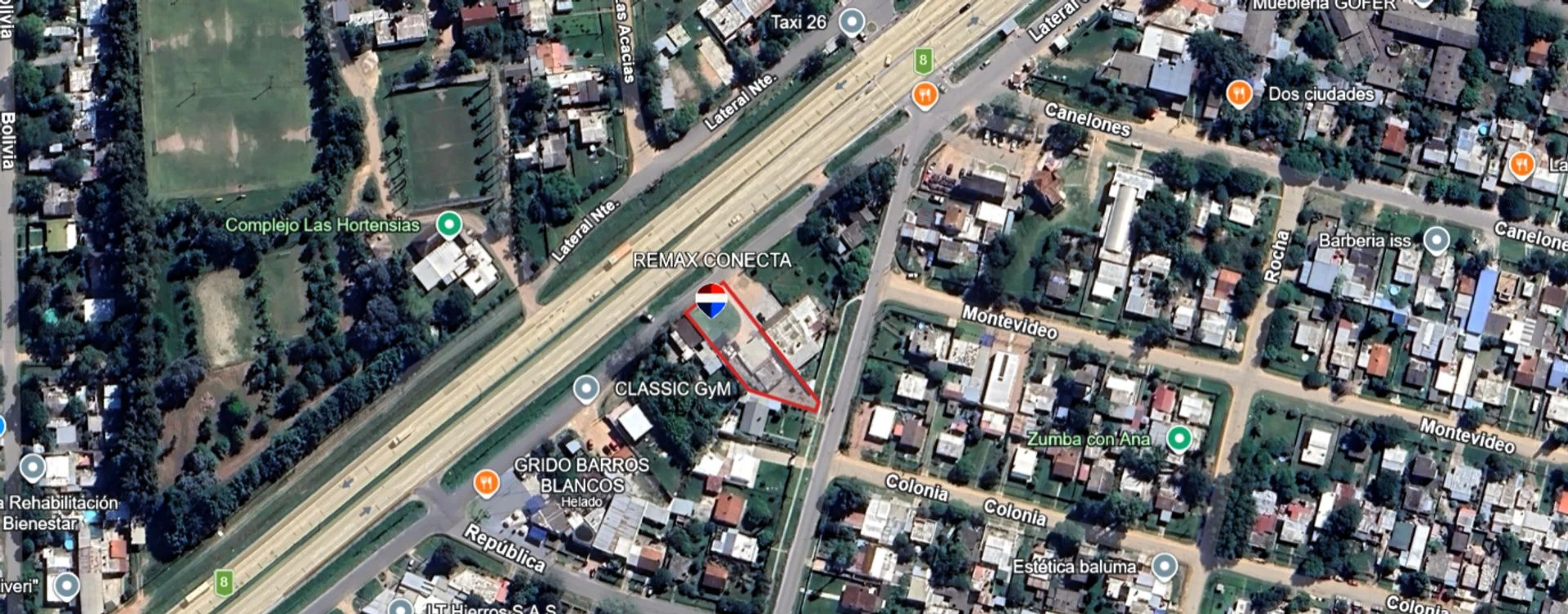 Terreno comercial estratégicamente ubicado sobre Ruta 8 y Camino Lorenzo Ventura en Barros Blancos, Canelones, con potencial de desarrollo inmobiliario y comercial. La propiedad abarca una superficie total de 680 m², de los cuales 216 m² ya presentan construcciones existentes, ofreciendo múltiples alternativas de inversión.