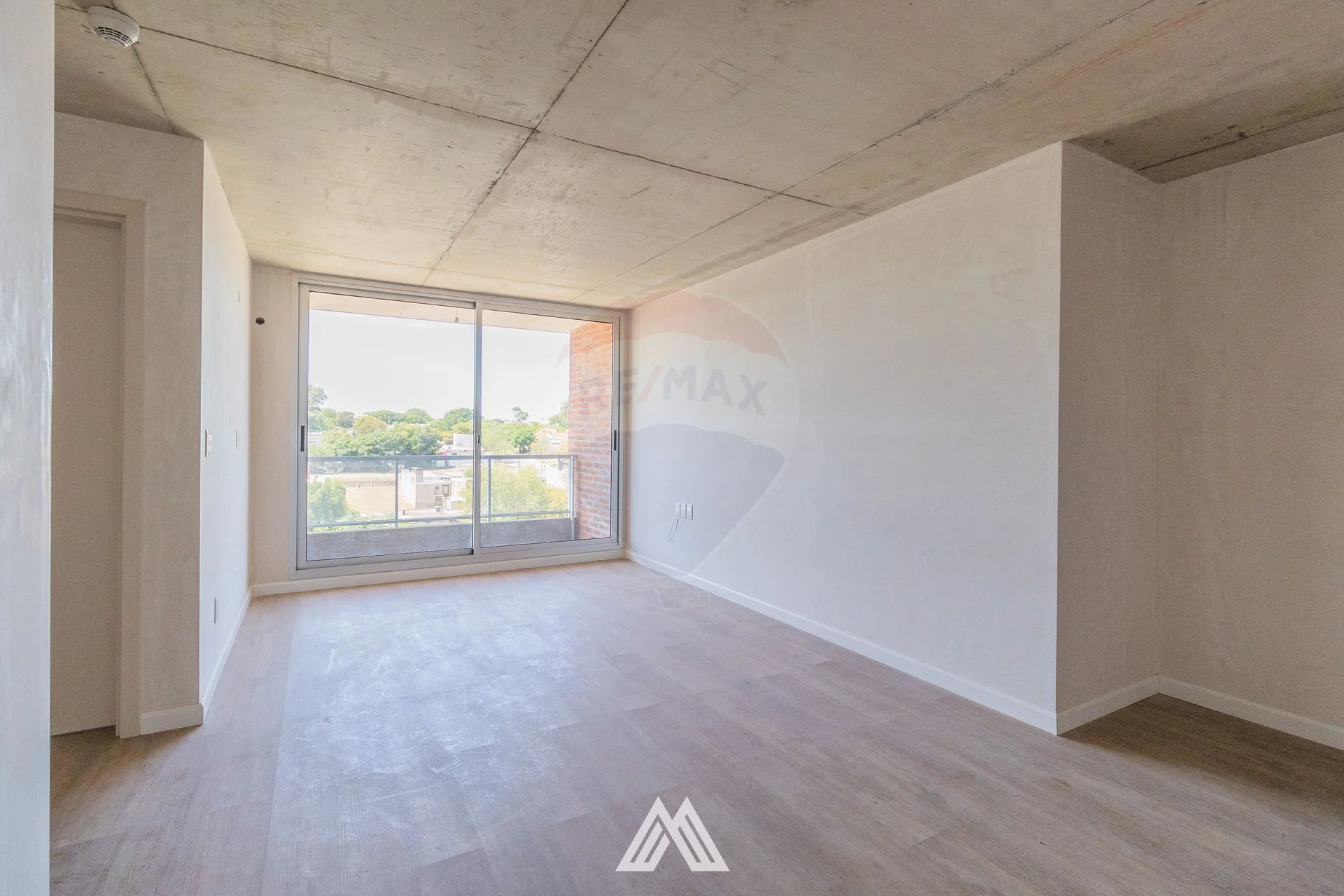 Cocina integrada con living comedor y acceso al balcón con ventanal de techo a piso.