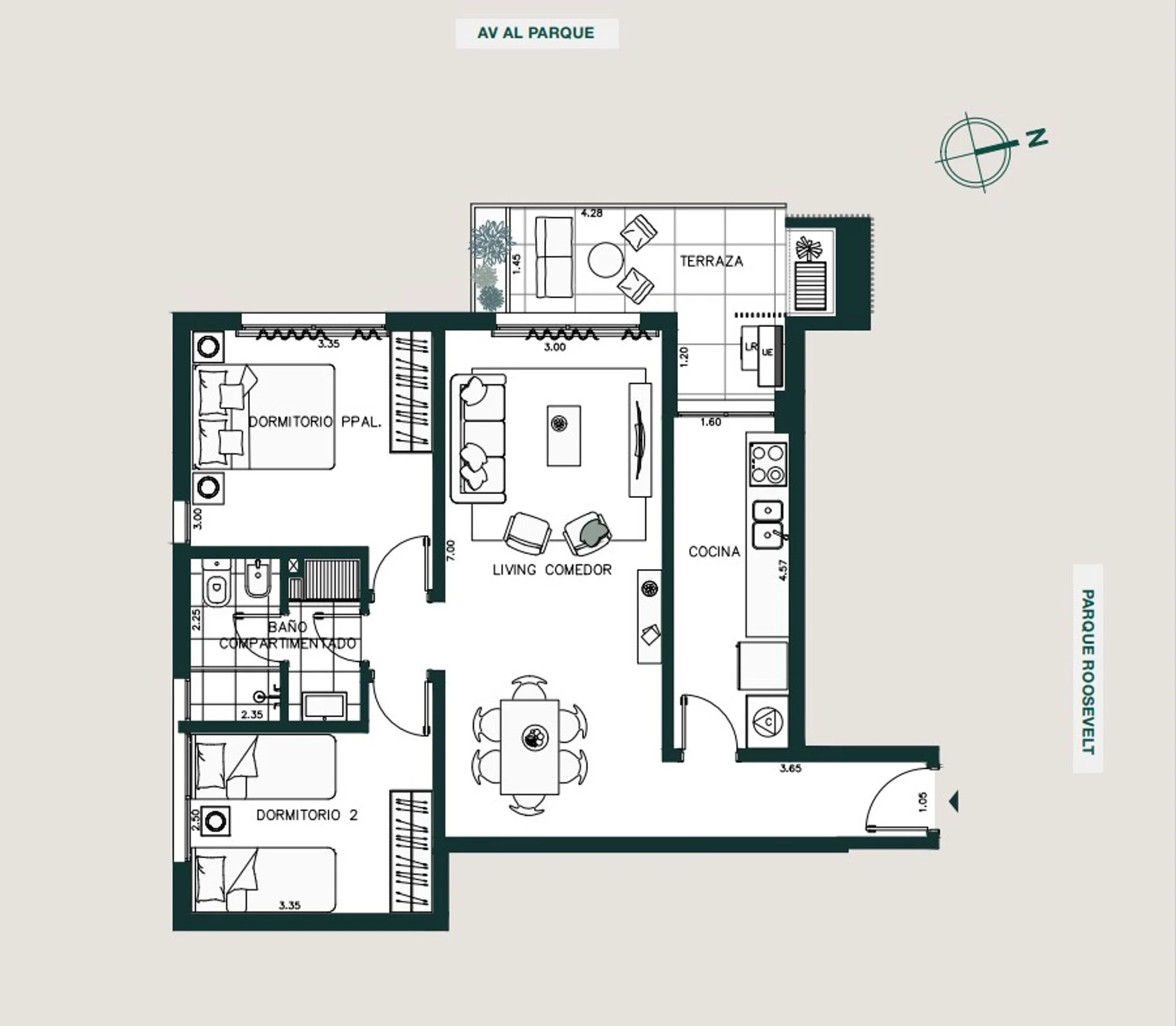 Unidad 201: cuenta con living-comedor, cocina definida, ambos con salida al balcón de 10,27m² con parrillero. 2 dormitorios con placard y baño. Aire acondicionado multi-split en livings y dormitorios y Horno eléctrico, anafe y campana extractora en cocinas. Doble vidrio en living comedor y cortinas de enrollar en dormitorios.