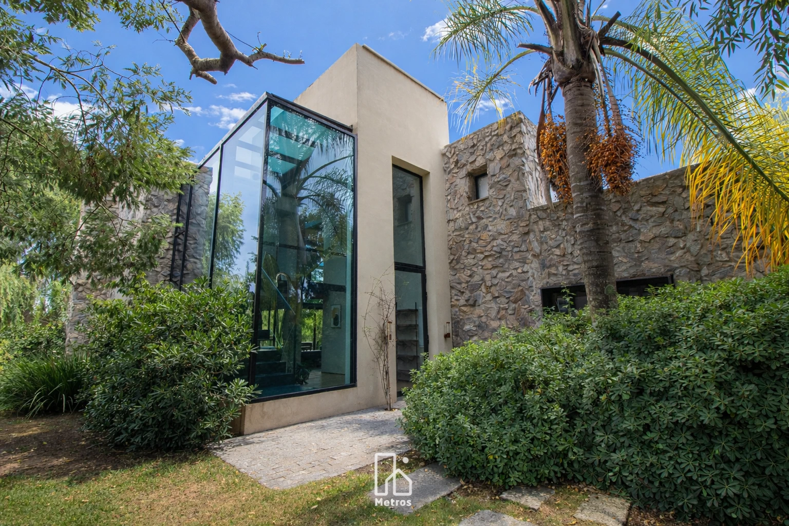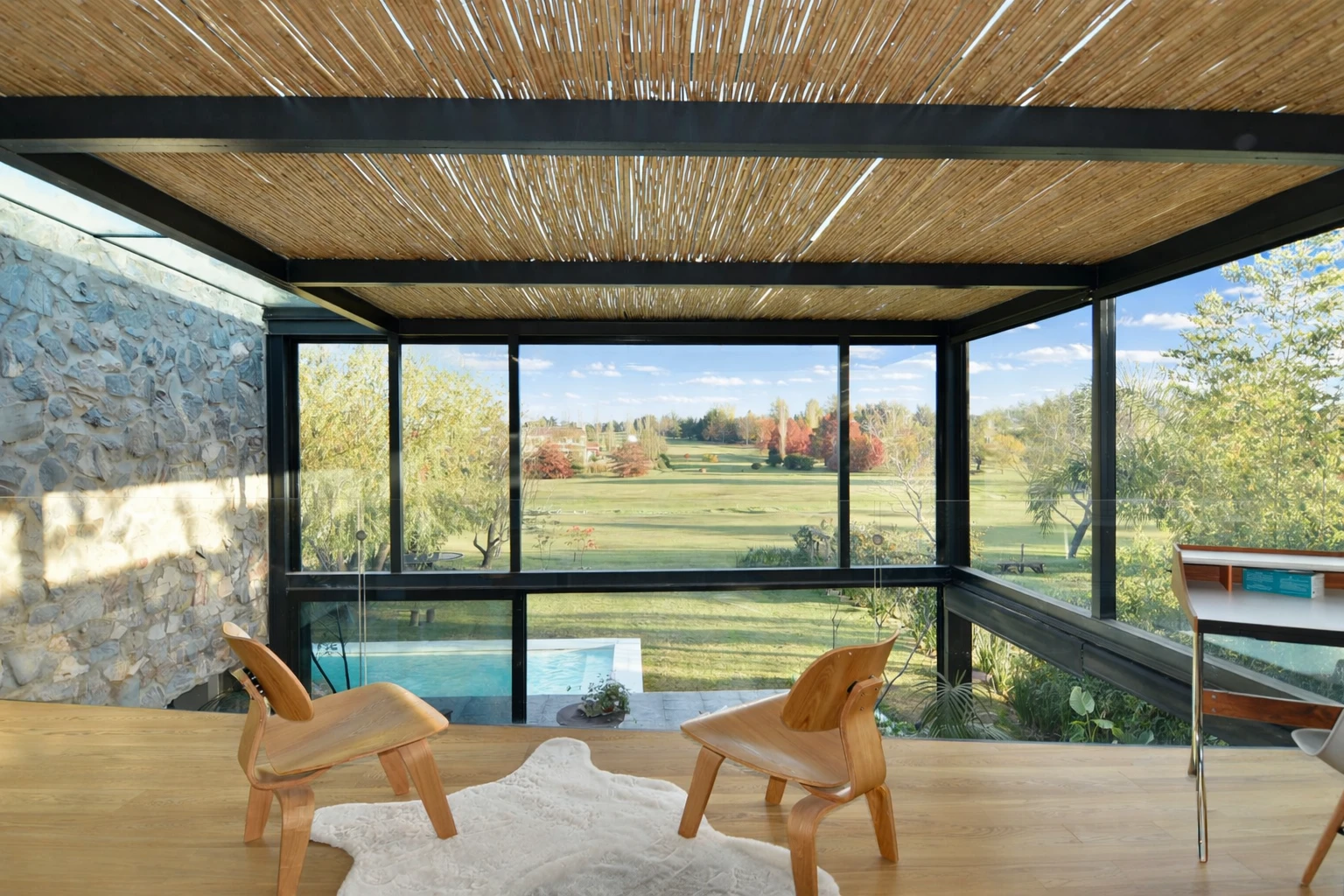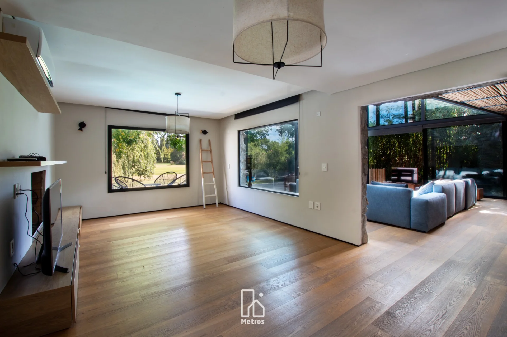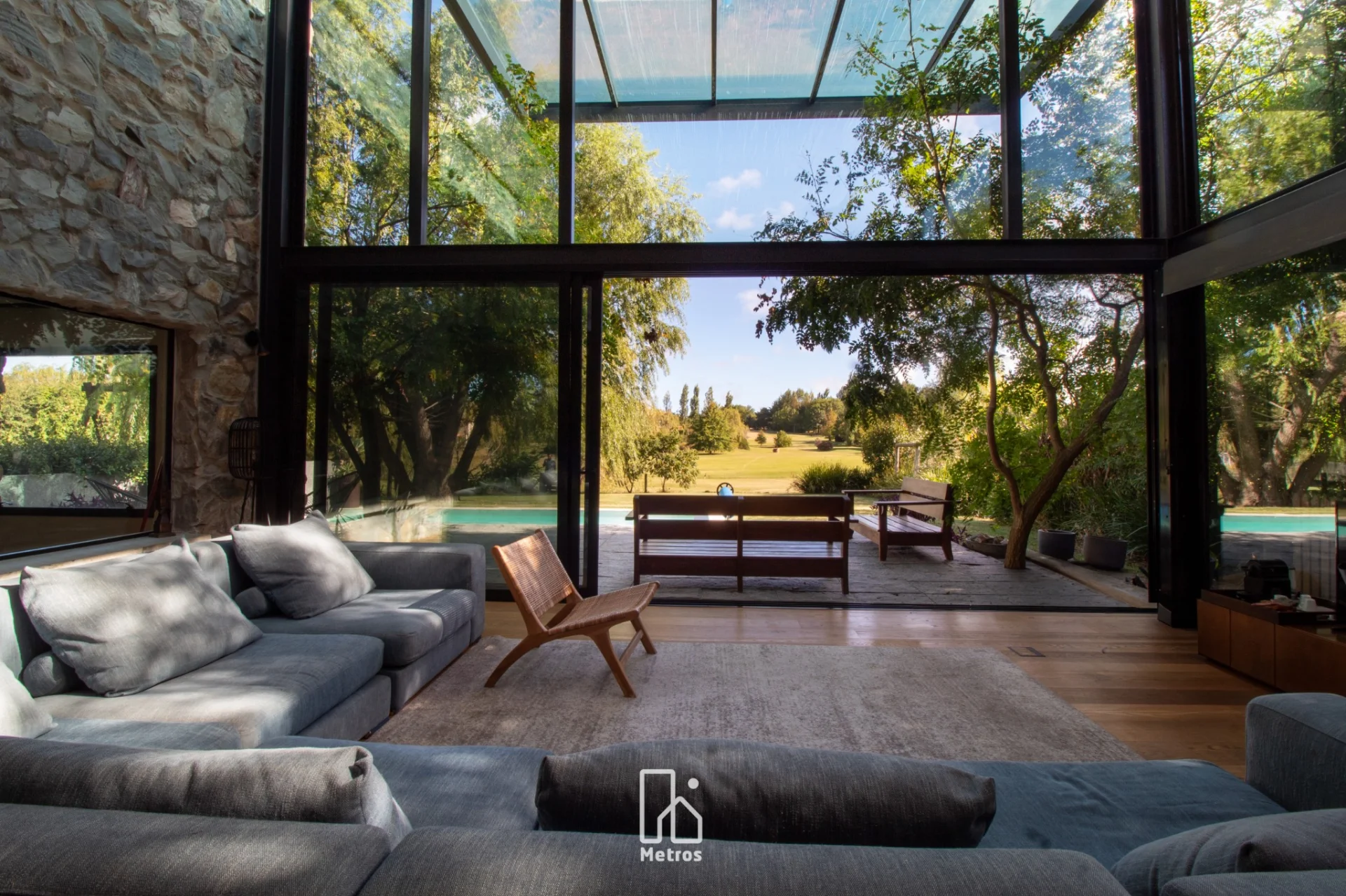 Se encuentra un estar con estufa a leña y un amplio living principal de doble altura. Las grandes aberturas de piso a techo permiten integrar completamente el interior con el deck exterior en piedra natural, donde se ubican la piscina climatizada con cascada y el jardín con una amplia vista verde de los campos de golf.