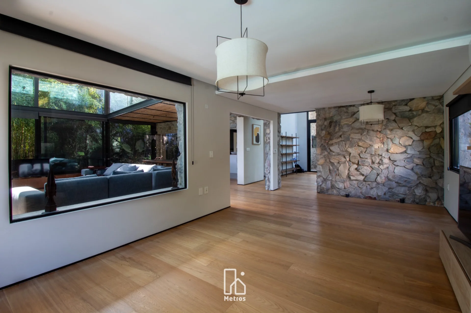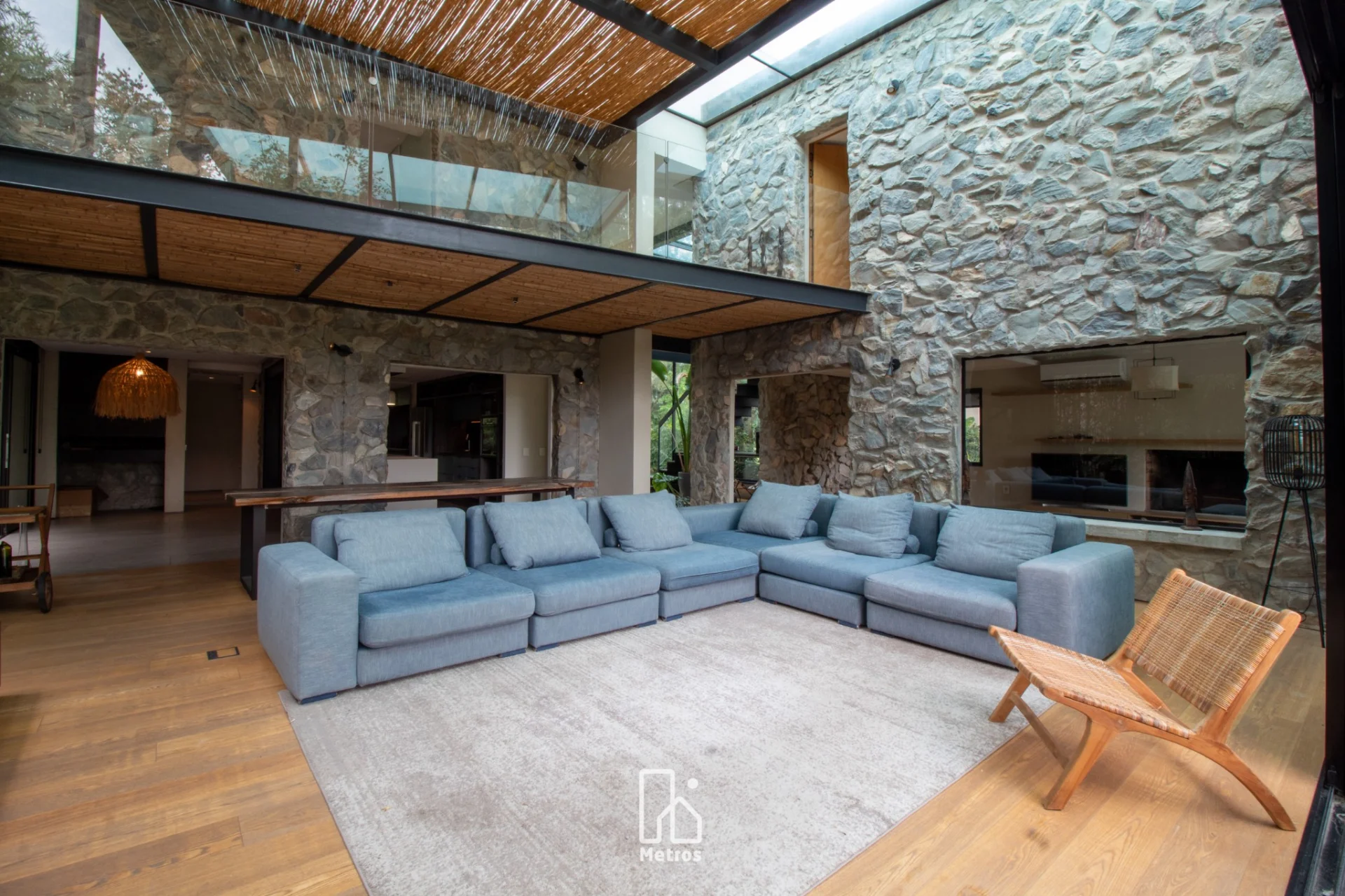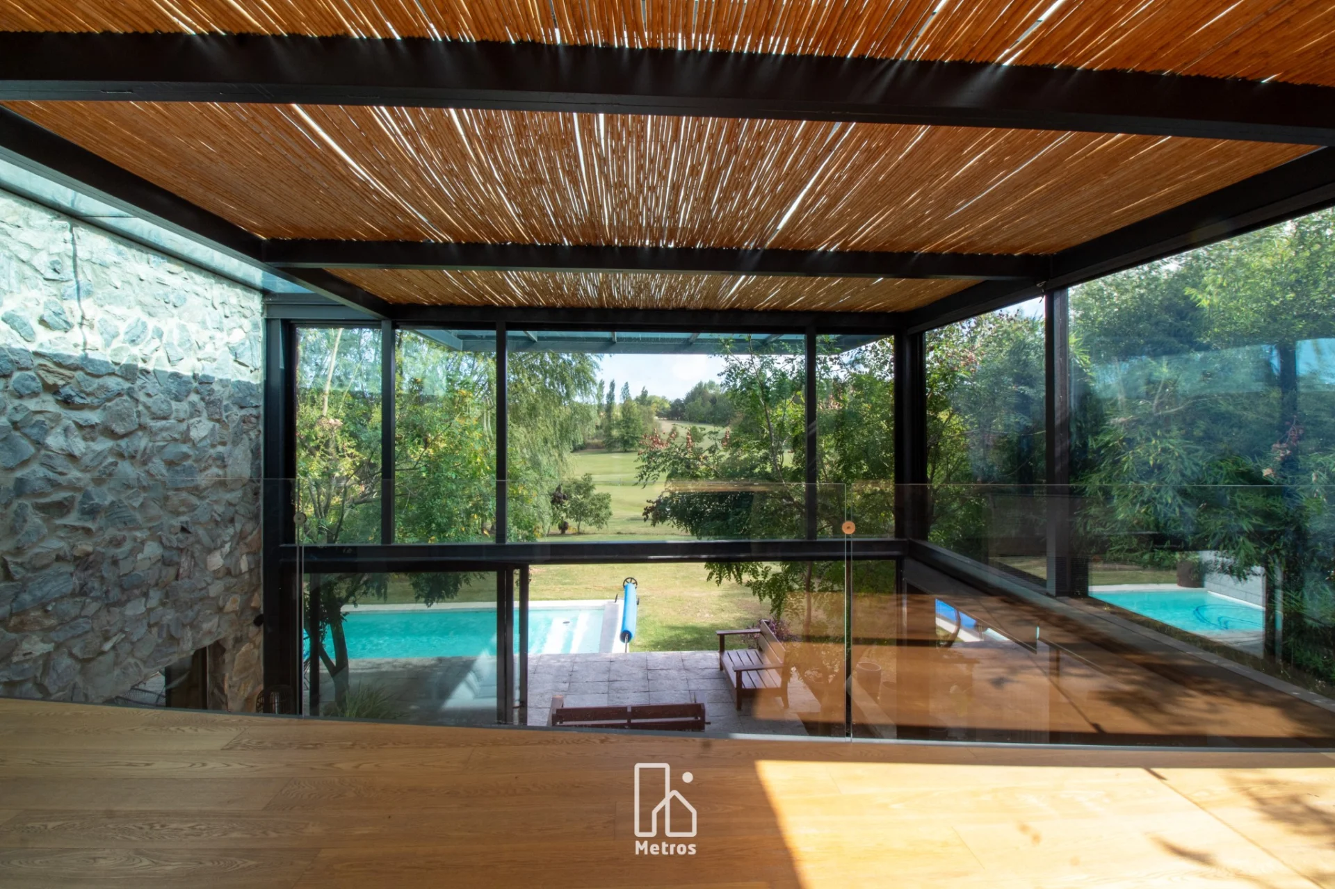 Se encuentra un estar con estufa a leña y un amplio living principal de doble altura. Las grandes aberturas de piso a techo permiten integrar completamente el interior con el deck exterior en piedra natural, donde se ubican la piscina climatizada con cascada y el jardín con una amplia vista verde de los campos de golf.
