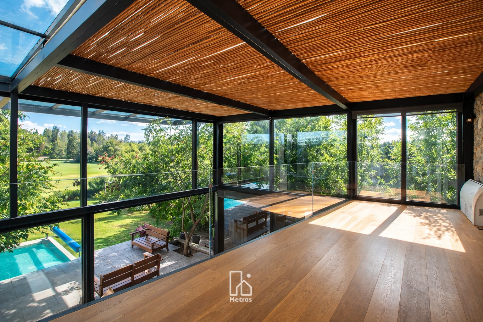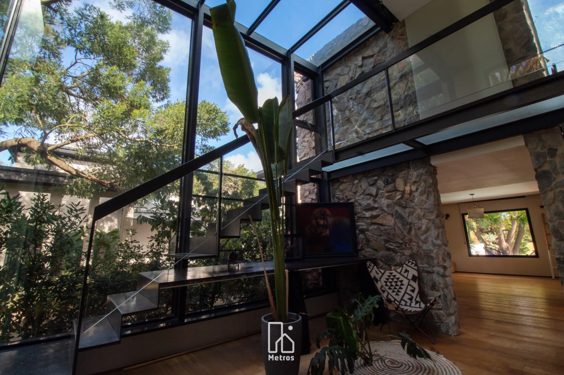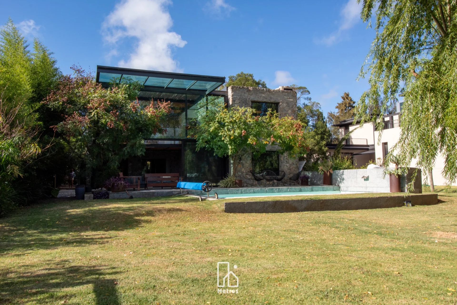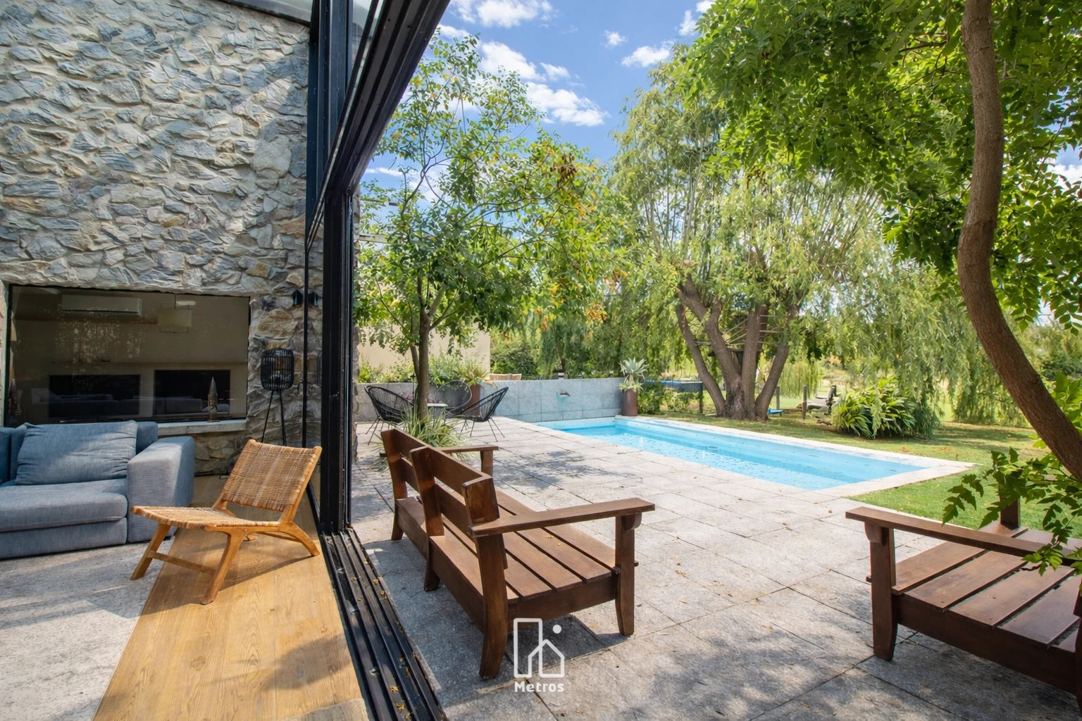 Se encuentra un estar con estufa a leña y un amplio living principal de doble altura. Las grandes aberturas de piso a techo permiten integrar completamente el interior con el deck exterior en piedra natural, donde se ubican la piscina climatizada con cascada y el jardín con una amplia vista verde de los campos de golf.