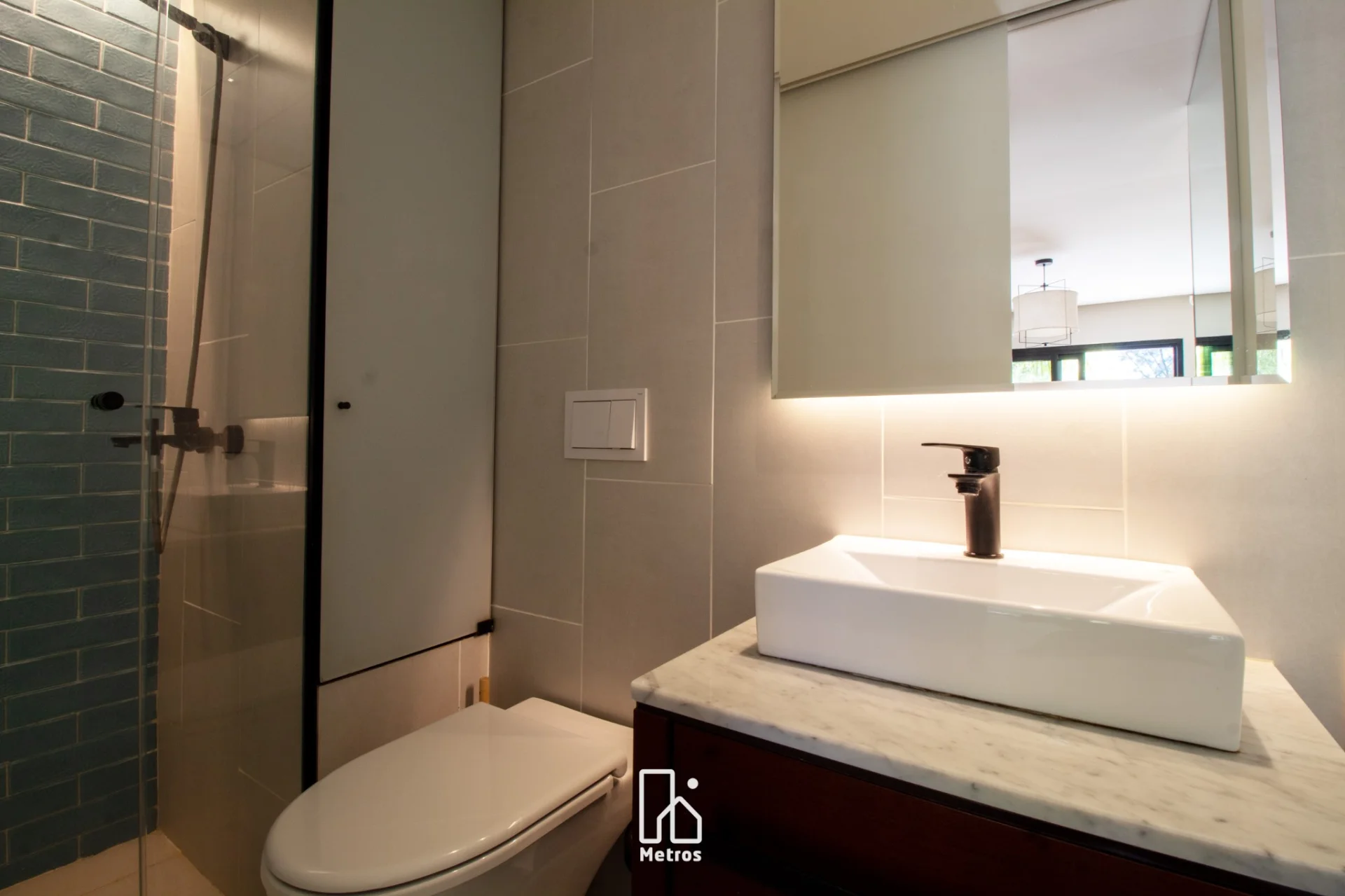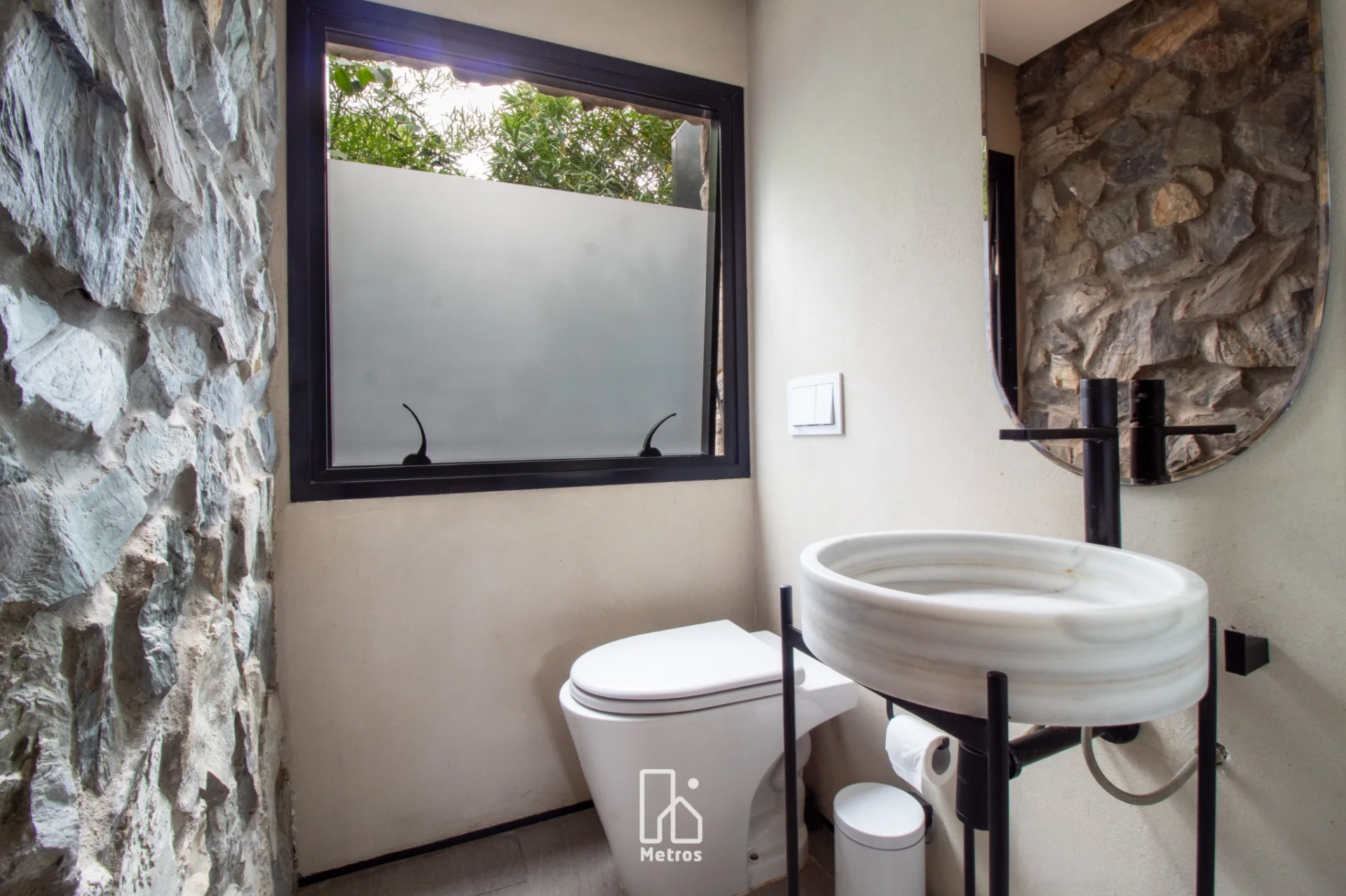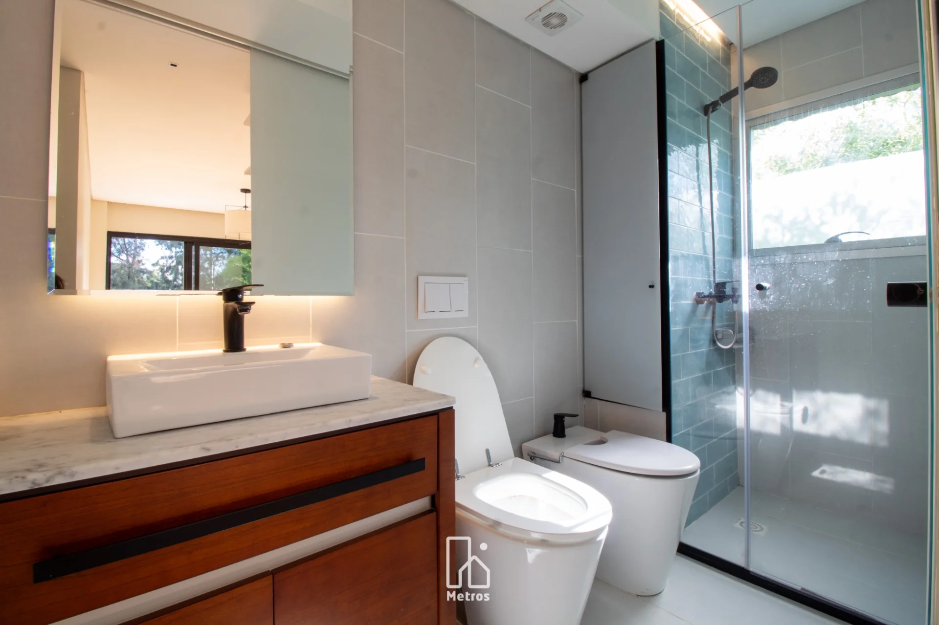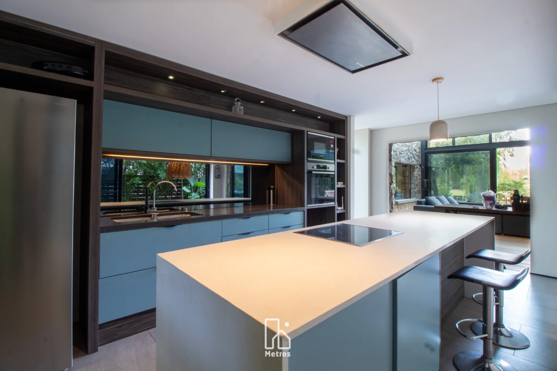 La cocina, de estilo contemporáneo, cuenta con isla central, parrillero interior y área de comedor, generando un espacio muy funcional para la vida diaria y reuniones. En este sector también se ubican el lavadero y el área de servicio con un baño completo.