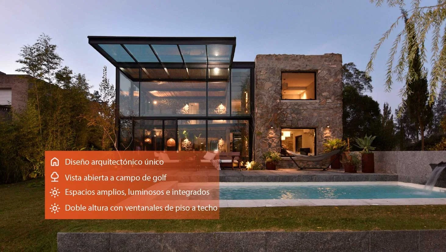 Vista abierta privilegiada al campo de golf • Gran living doble altura con ventanales de piso a techo • Espacios Integrados • Conexión con la naturaleza • Diseño arquitectónico único • 3 dormitorios en suite • Piscina climatizada • Eficiencia energética