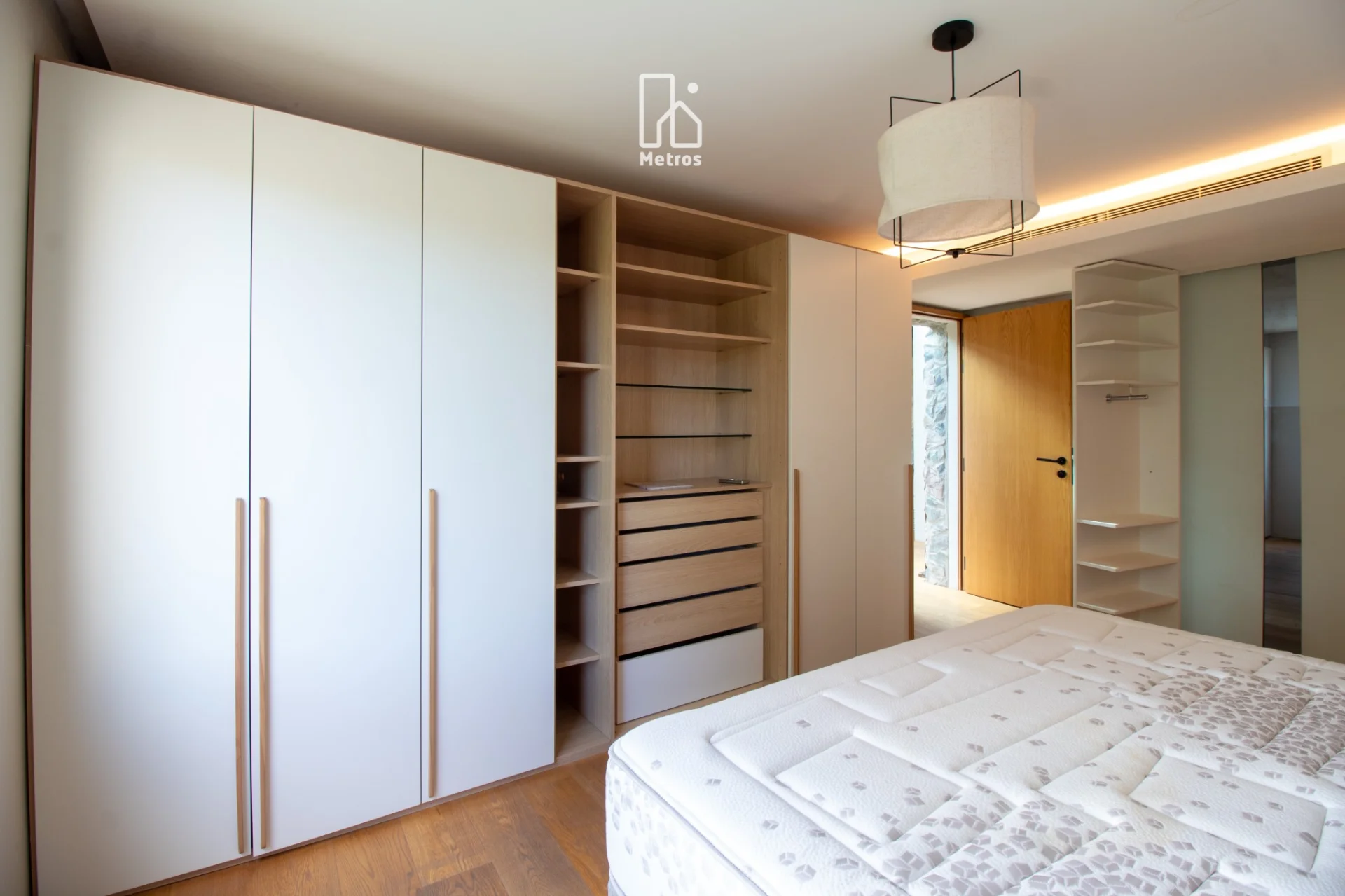 En planta alta se desarrolla un espacio de estar o escritorio con una vista abierta privilegiada hacia el golf. Desde allí se accede a los tres dormitorios en suite: la suite principal con vestidor y orientación al campo de golf, mientras que los dormitorios secundarios comparten una amplia terraza con vista al frente.