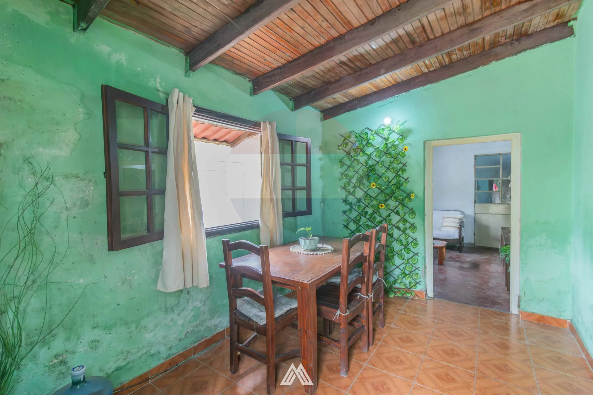 - Comedor definido, también con ventana de madera hacia el patio lateral