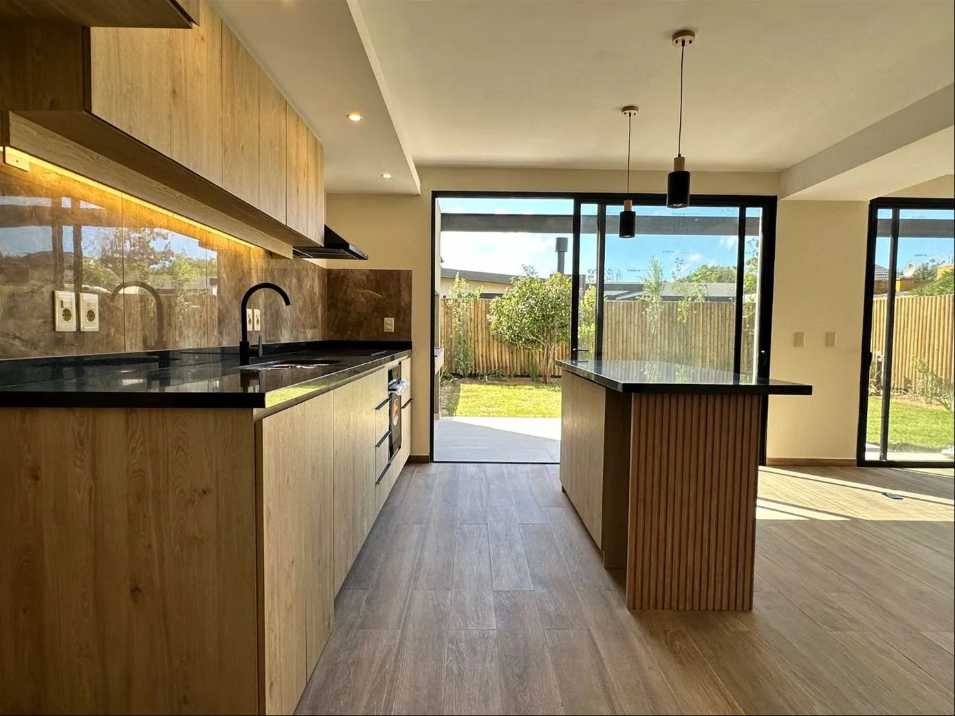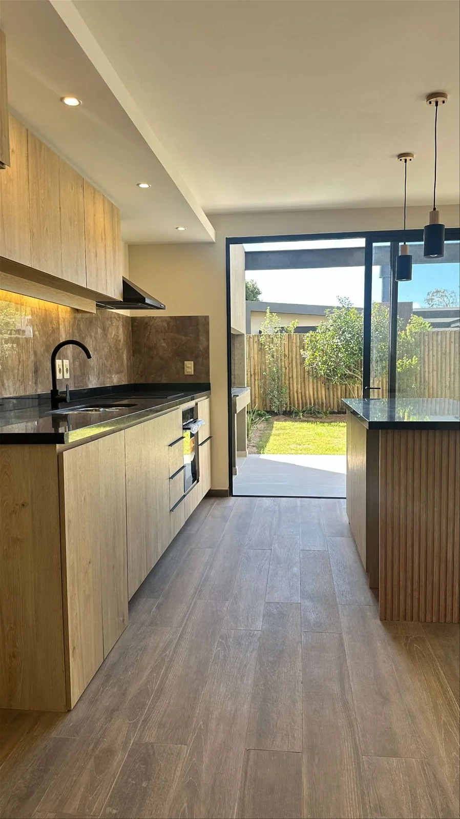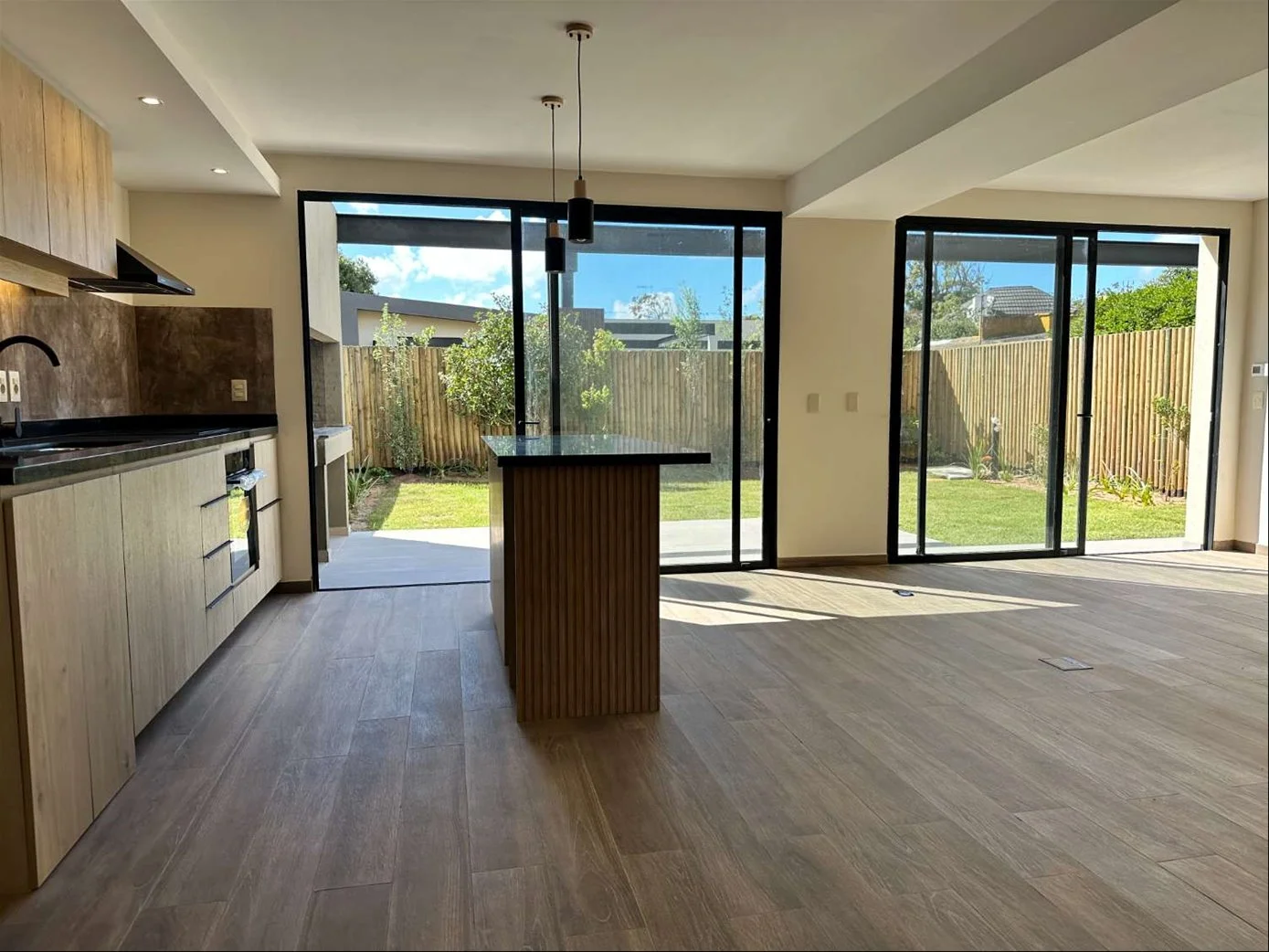 Living, comedro y cocina integrado orientado al norte, grandes ventanales que permiten el ingreso de luz natural. Cocina equipada con horno-anafe y extractor, lugar para lavaplatos. Todos los ambientes integrados a pergola con parrillero y salida a jardin.