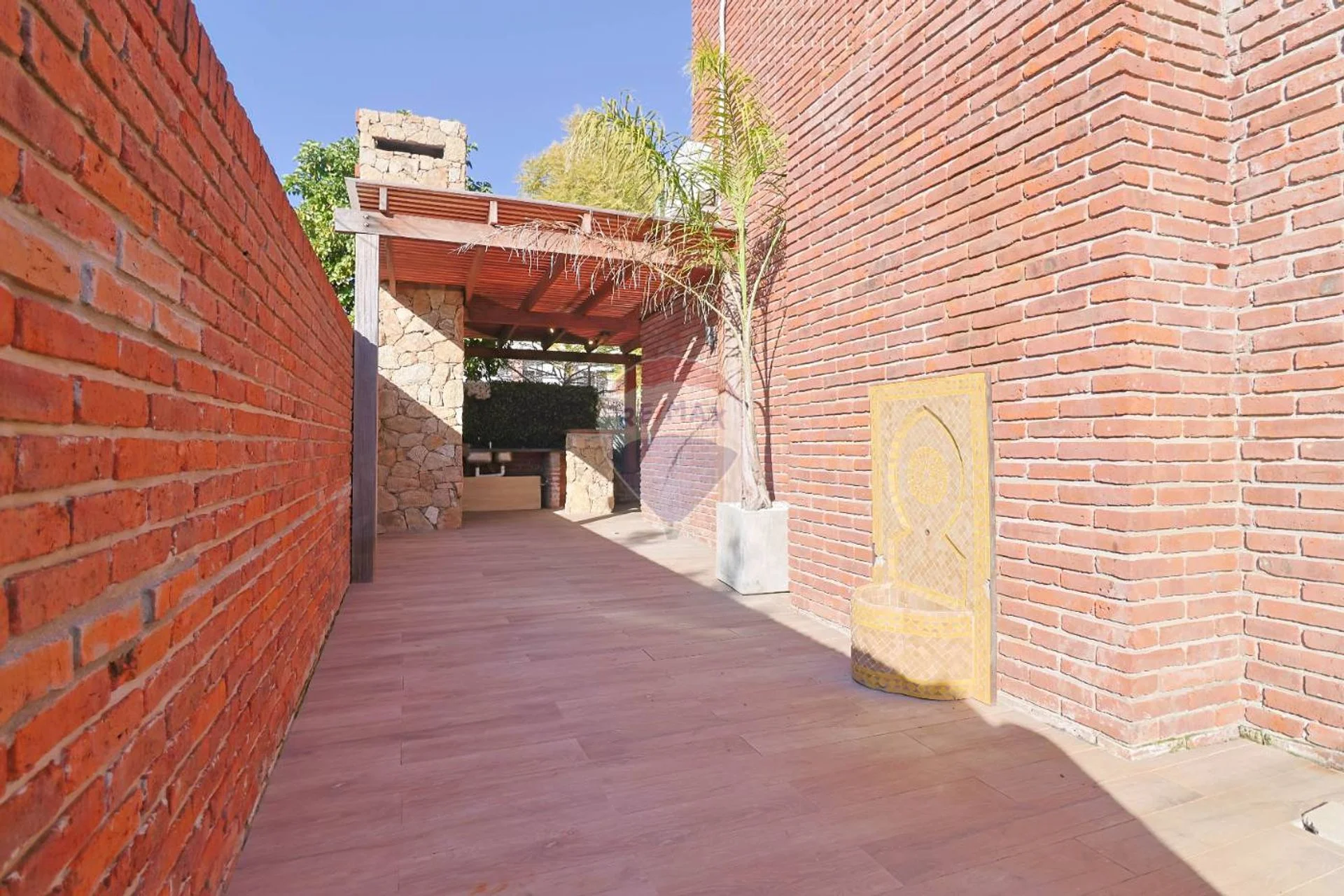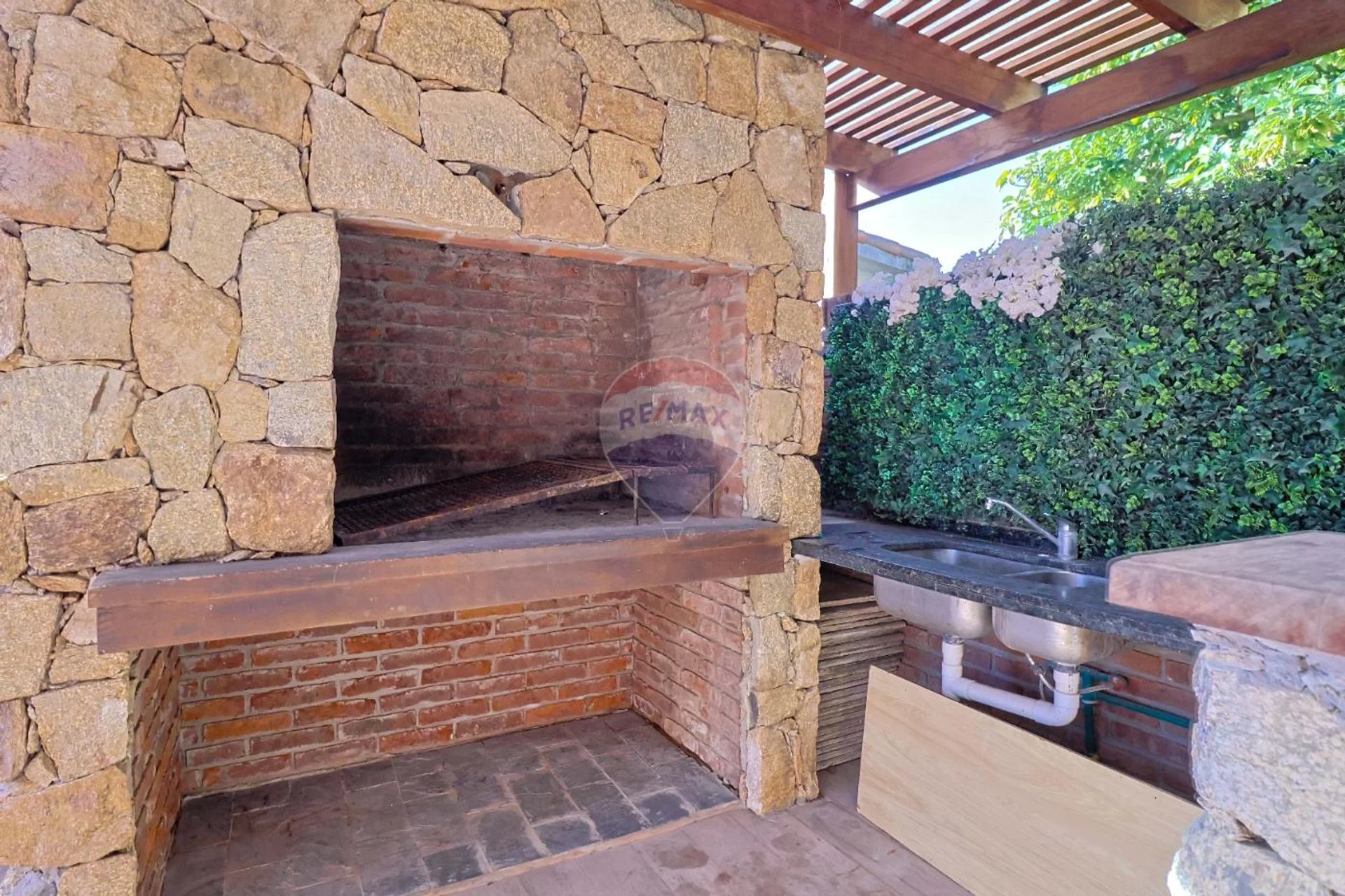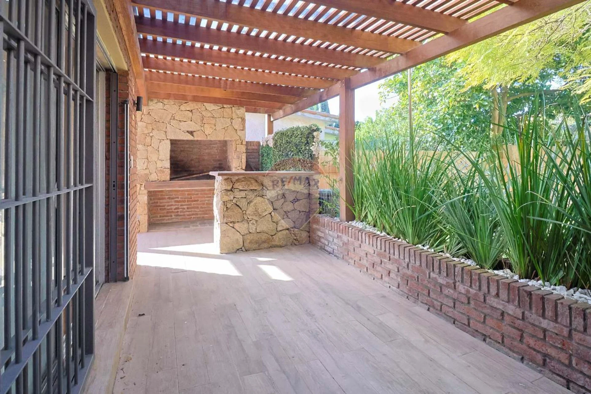 Hacia el fondo nos encontramos con un patio pergolado, manteniendo el mismo diseño interior, parrillero revestido en piedra, mesada con pileta y barra de lapacho con piedra. Los pisos son de porcelanato. Las pérgolas de toda la casa son de lapacho de la mejor calidad. Desde el parrillero accedemos a otra zona de disfrute que conecta con el jardin que da al frente.