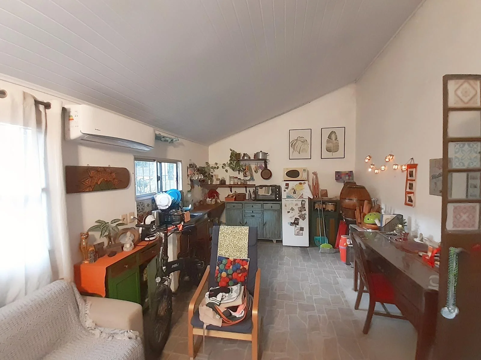 Living con cocina integrada y aire acondicionado.