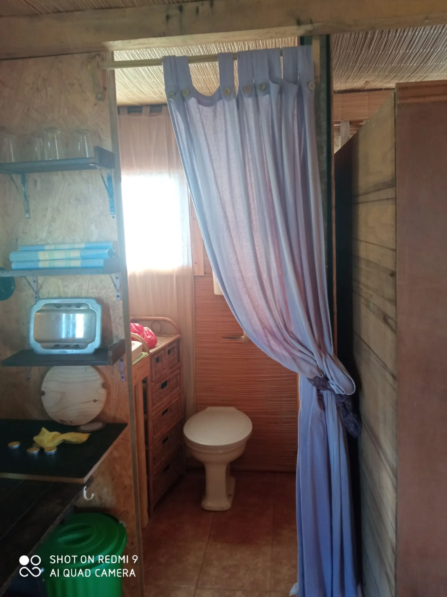 Casa terciaria estilo Cabaña en madera monoambiente, con baño, techo de chapa con membrana doble, su interior con esterillas ventanas con postigos y trancas.