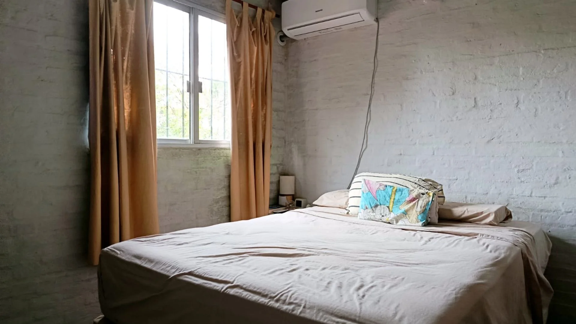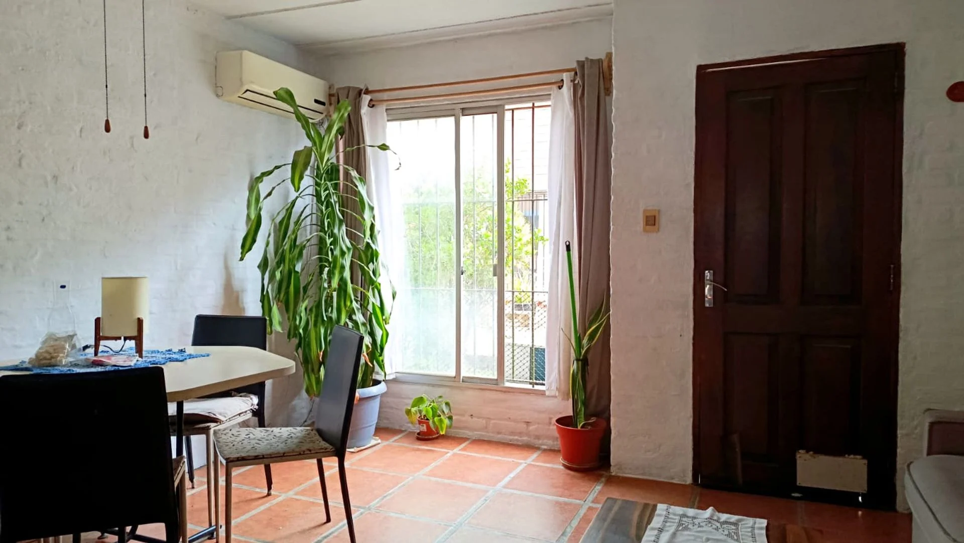 En planta baja, el living de 5 por 5 metros presenta pisos de cerámica, aire acondicionado y ventanal frontal con rejas, generando un ambiente luminoso y acogedor. Un pasillo conduce al baño completo de 3 por 2 metros, revestido íntegramente en cerámica. La cocina, de 3 por 2 metros, resulta práctica y equipada con mesada de mármol, campana extractora y ventilación natural.