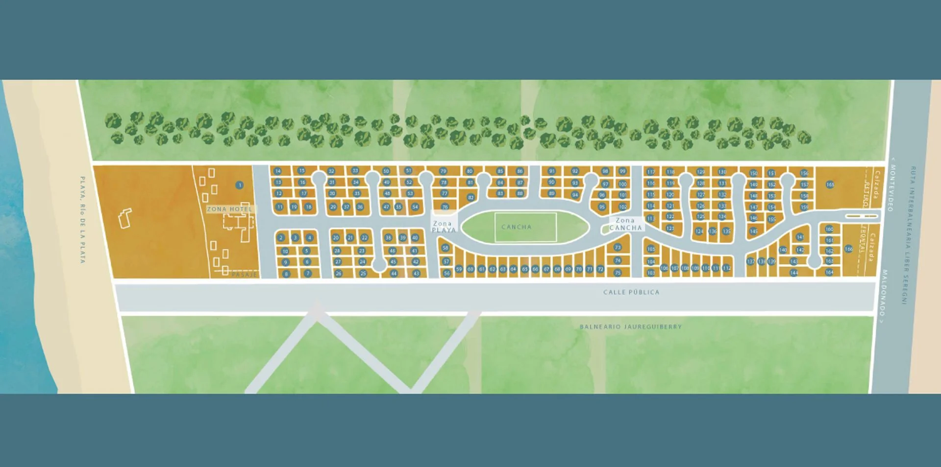 Complejo turístico y de viviendas que se desarrolla en un predio de 20 hectáreas con amplios espacios verdes e increíbles vistas a la costa. Un frente de 180 metros sobre el mar es su límite natural, permitiendo que todos los propietarios tengan bajada directa a la playa. Acceso mediante entrada directa con control y vigilancia las 24 hs. sobre la Ruta Interbalnearia.