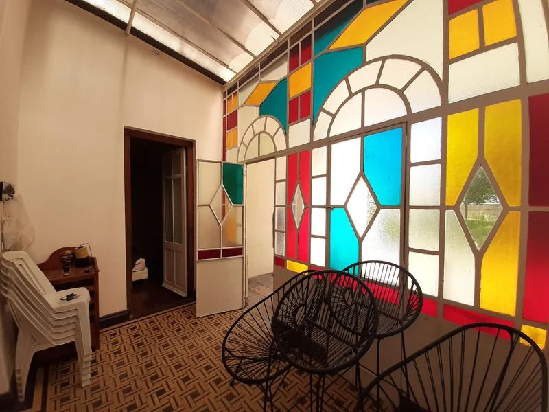 Mediante una bella puerta que es parte de un hermoso y colorido vitraux, se accede al amplio jardín con parrillero