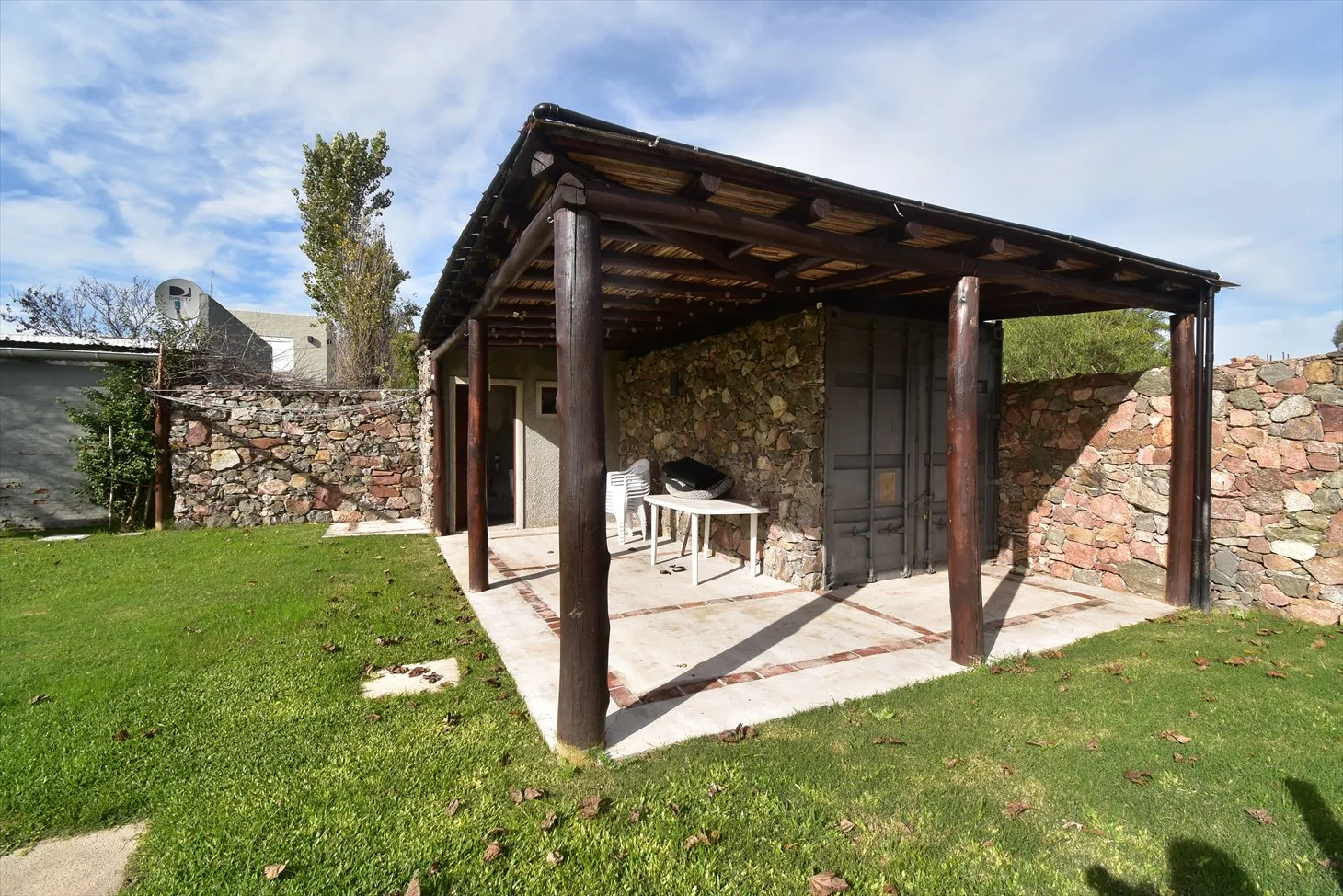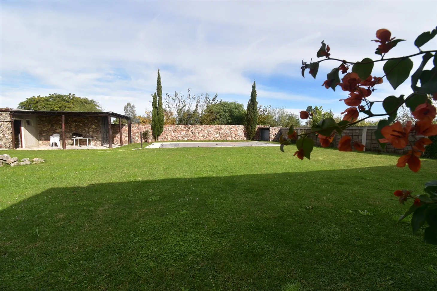 En este enorme jardín encontramos una gran piscina climatizada, un contenedor que cumple la función de guardilla y un baño.