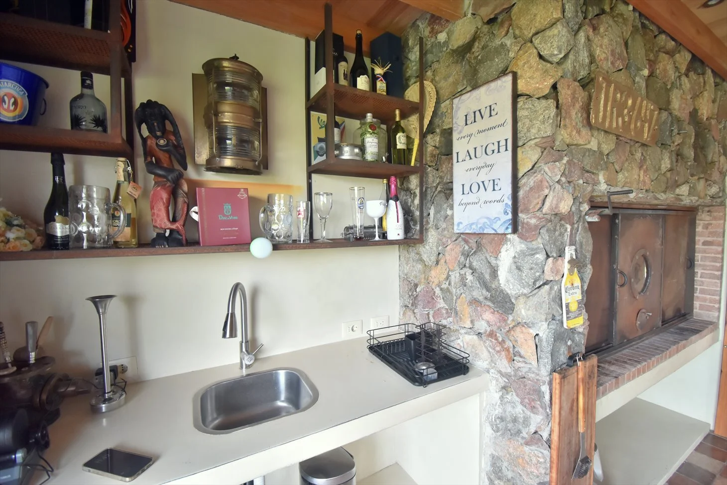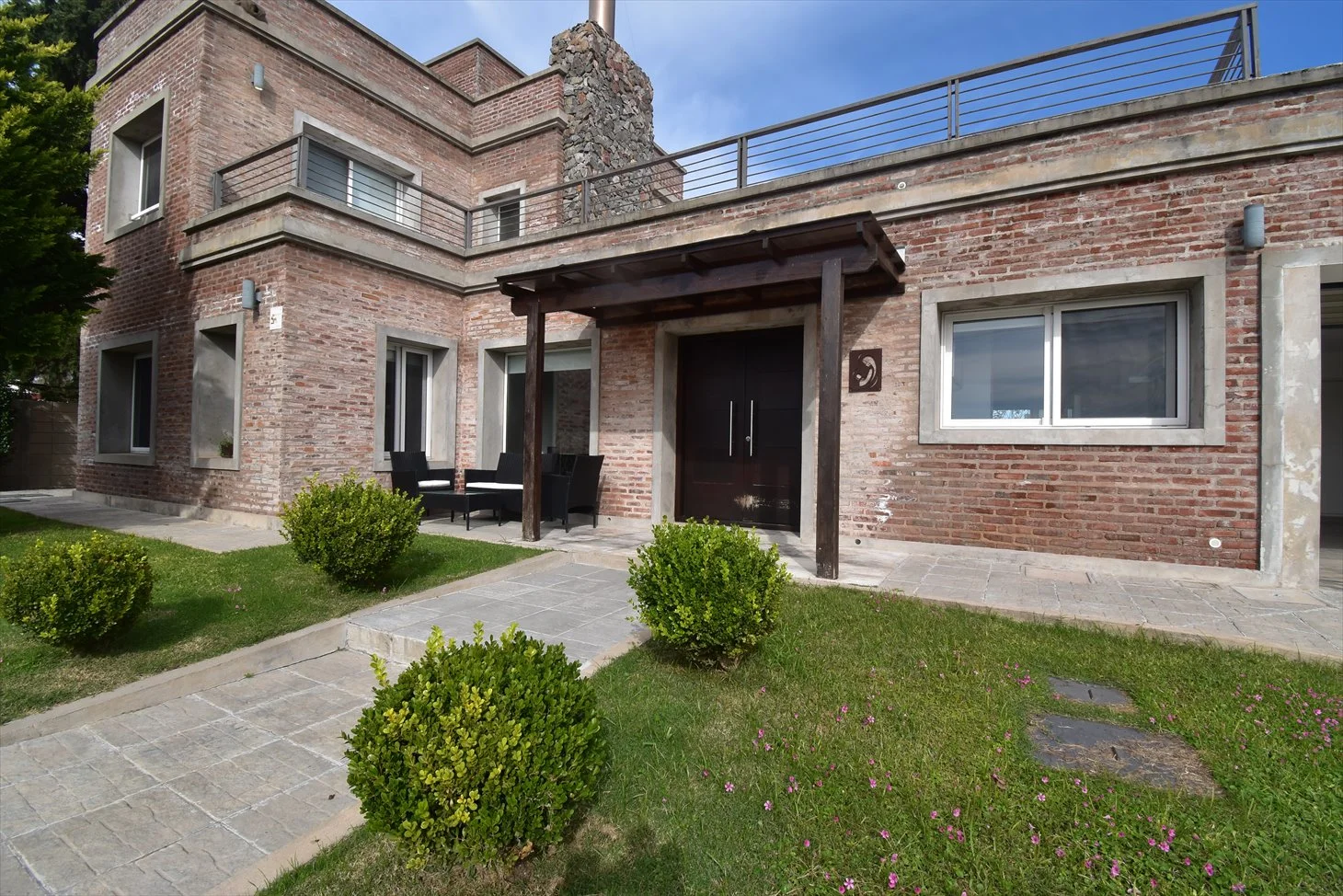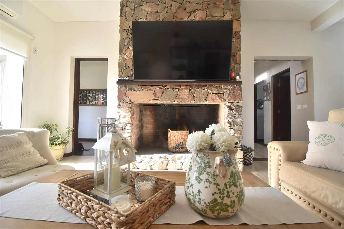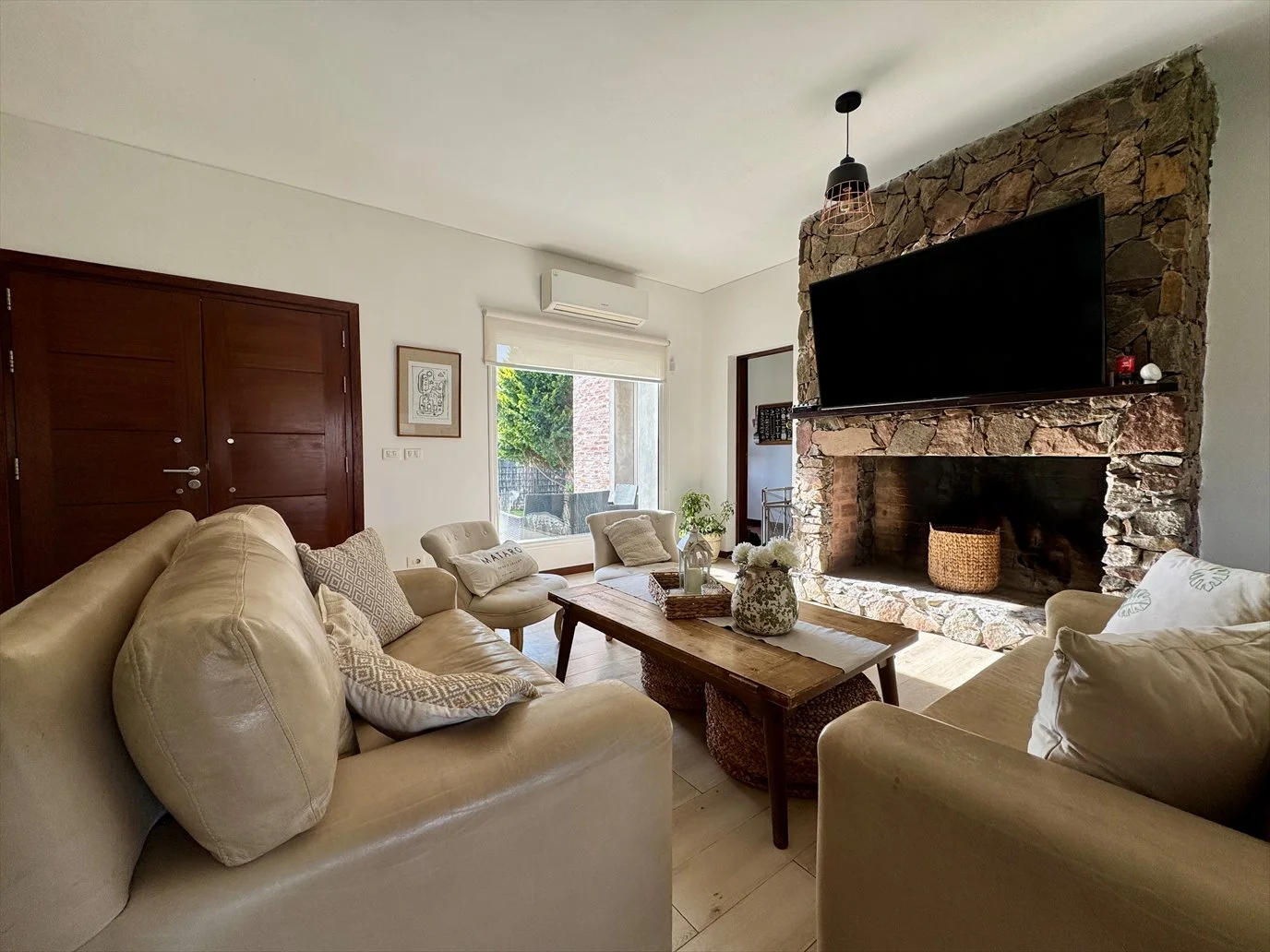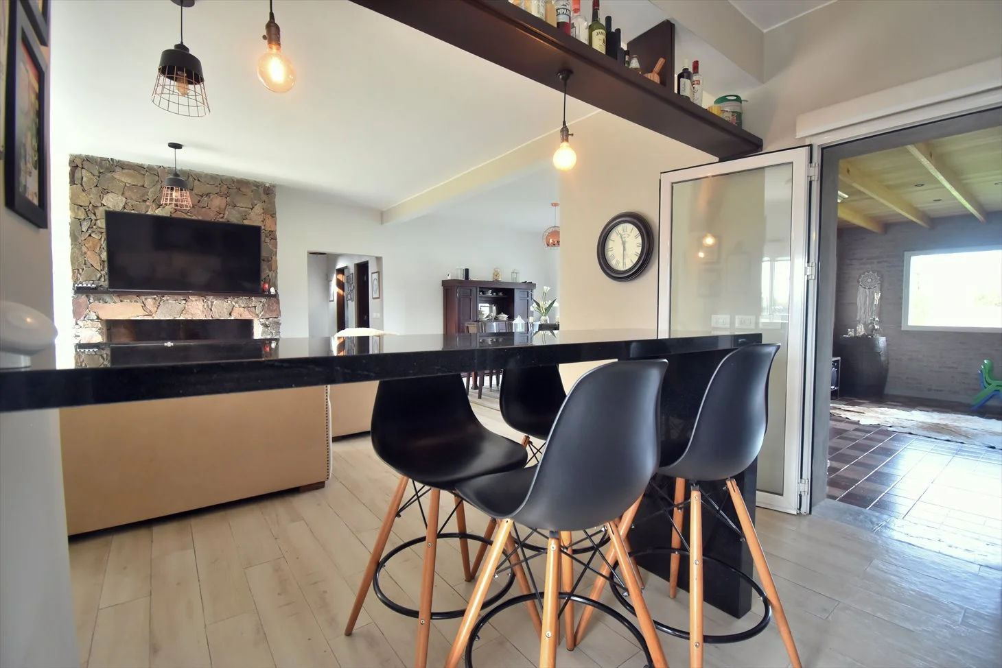 El acceso a la misma por la entrada principal nos lleva a un living muy amplio con una espectacular estufa a leña revestida en piedra, este se conecta con el comedor, que juntos hacen un ambiente super amplio y realmente muy luminoso. A estos se integra la cocina a través de una barra desayunadora, que por su diseño la hace una cocina bien definida.