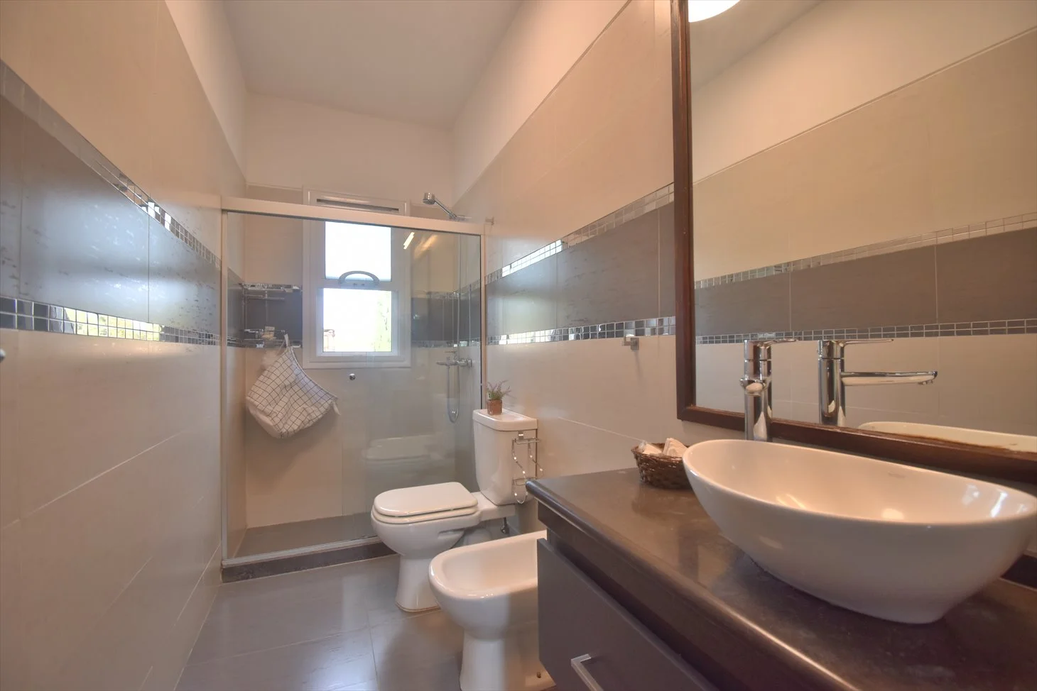 Tanto por la cocina como por el comedor accedemos a una barbacoa super amplia con salida al jardín y al garaje, a este ultimo se accede también desde la cocina, lo que le da una gran practicidad a la diaria. El Garaje funciona también como cuarto de lavado con lavadora y secadora de ropa ocultos el muebles diseñados a medida lo que da una clara sensación de orden.