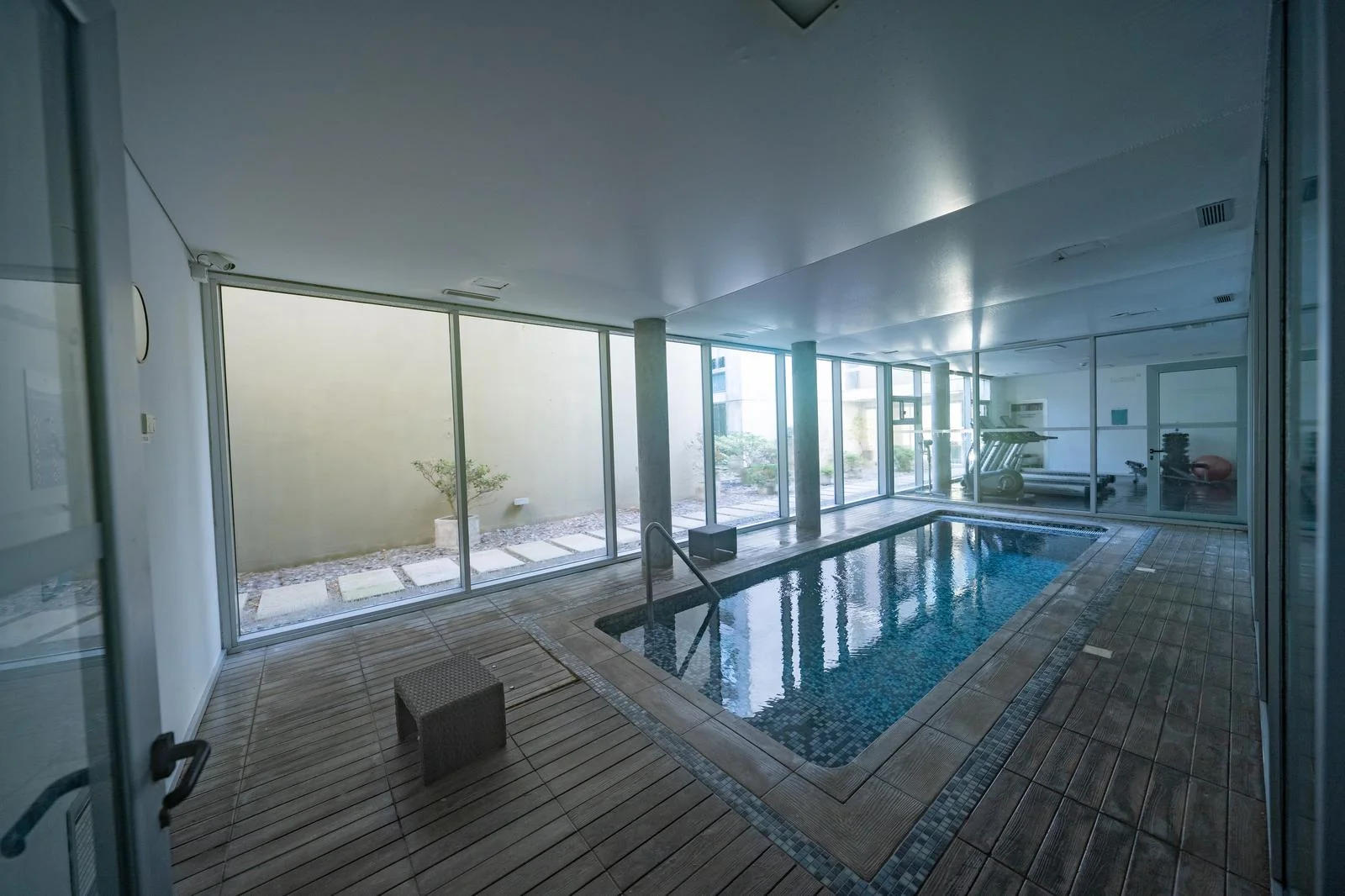 Piscina cubierta climatizada con deck y vistas al río